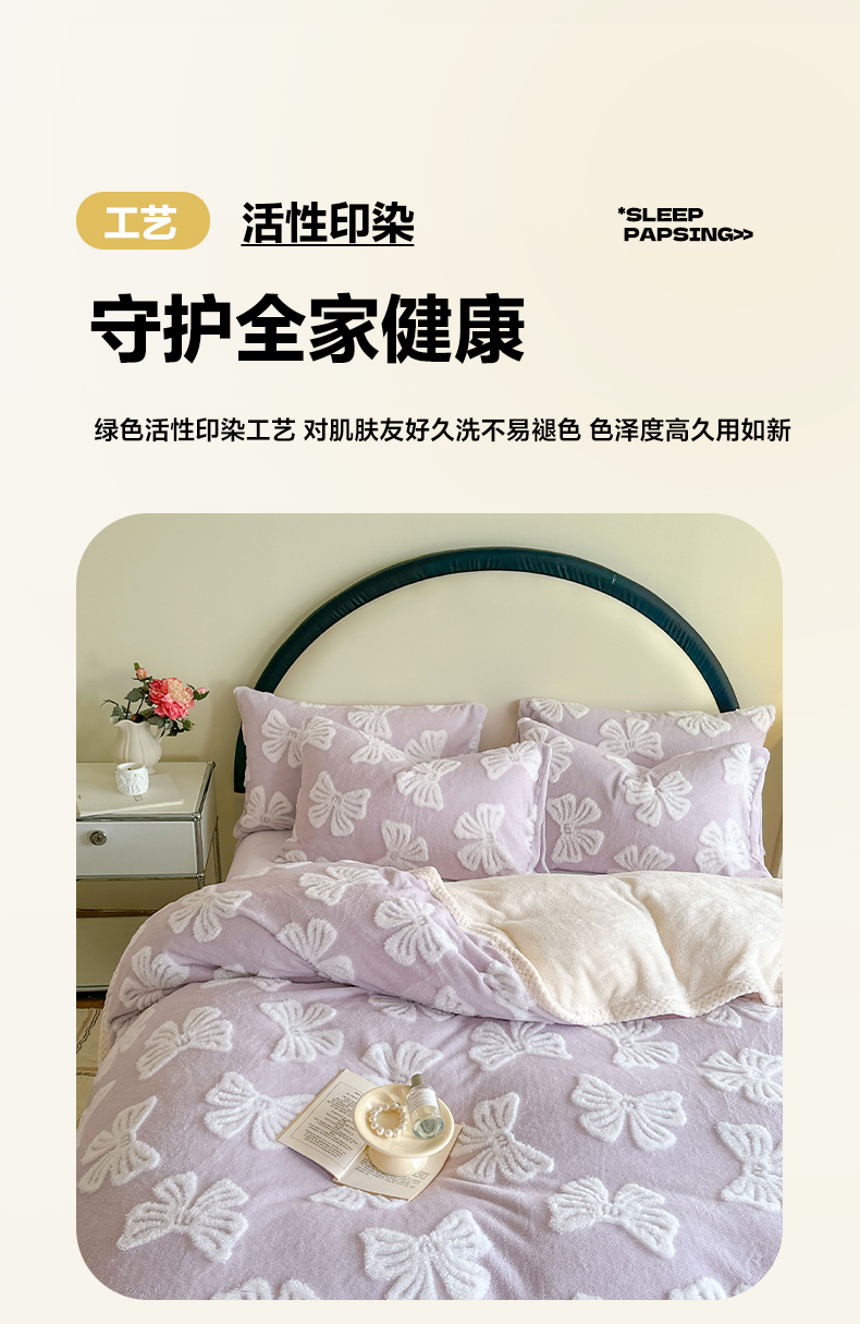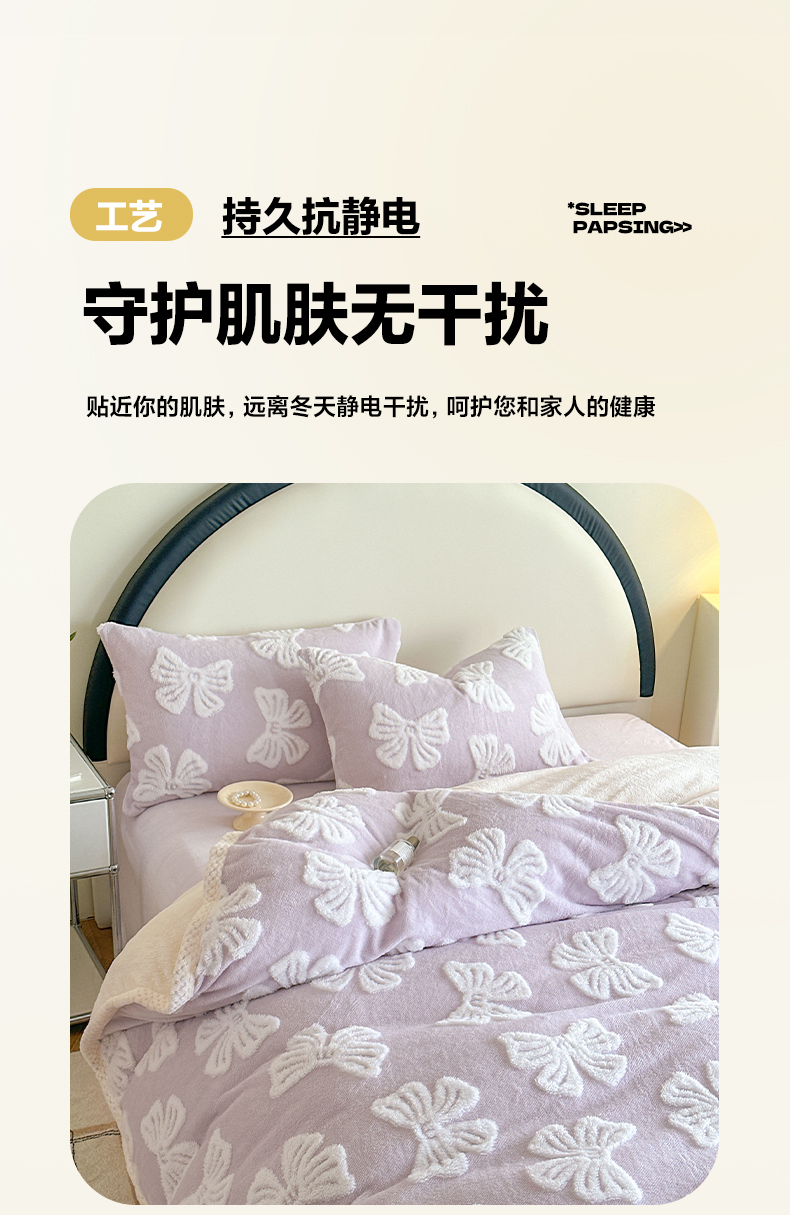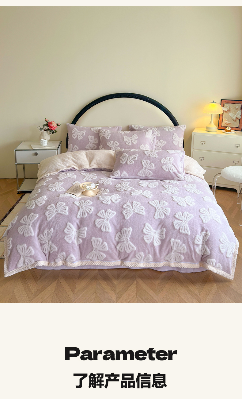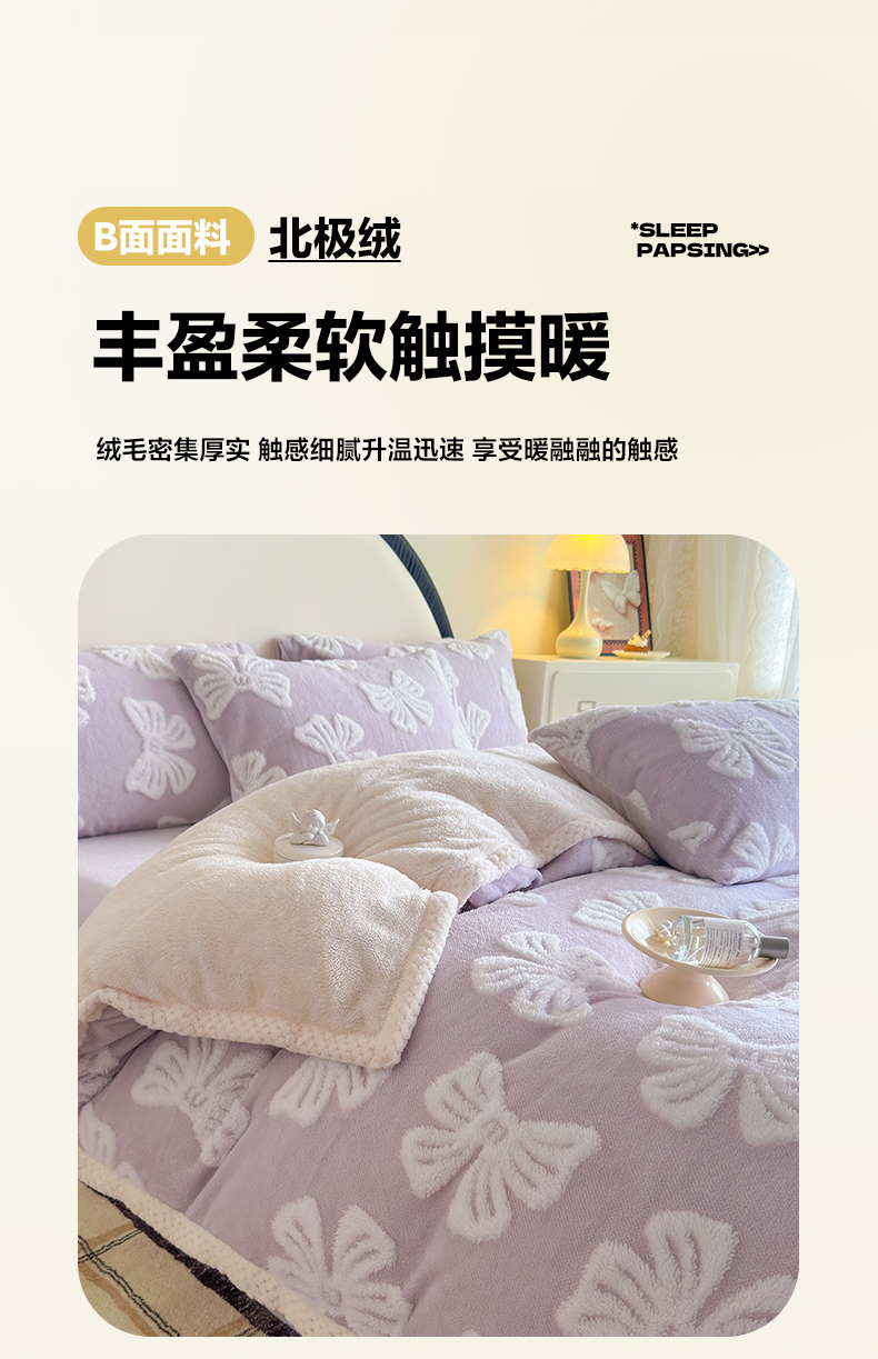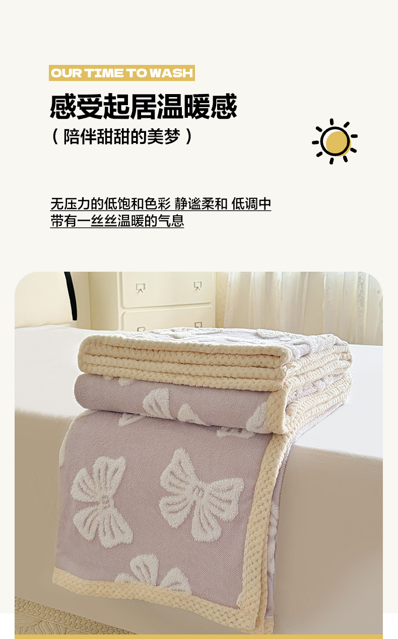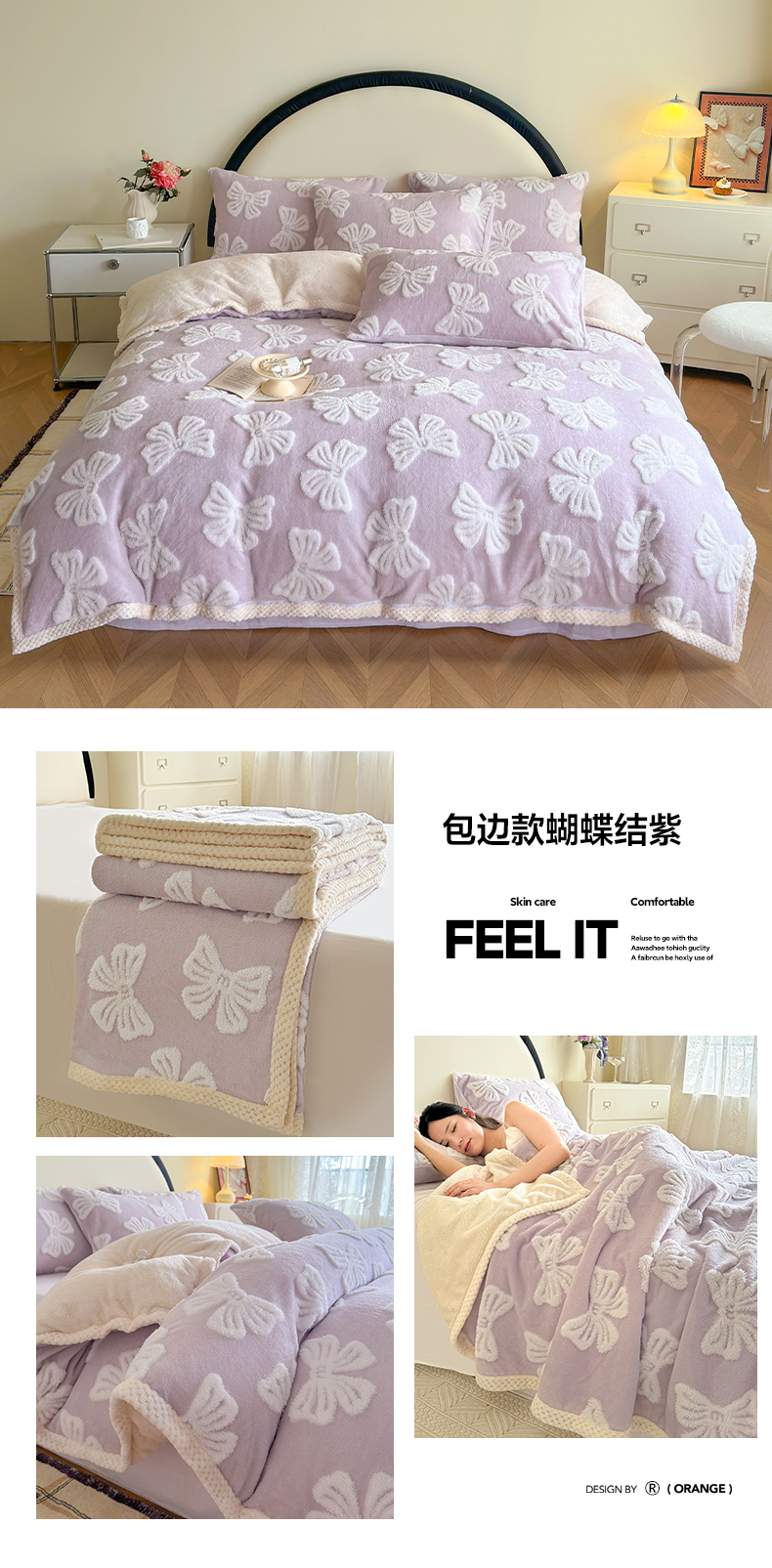 当前位置: 91家纺网 > 商品网购 > 毛毯休闲毯绒毯 > 毛毯 > 莱登卡奴 2024新款牛奶绒阳离子提花北极绒包边款多功能被套毯系列 包边款蝴蝶结紫