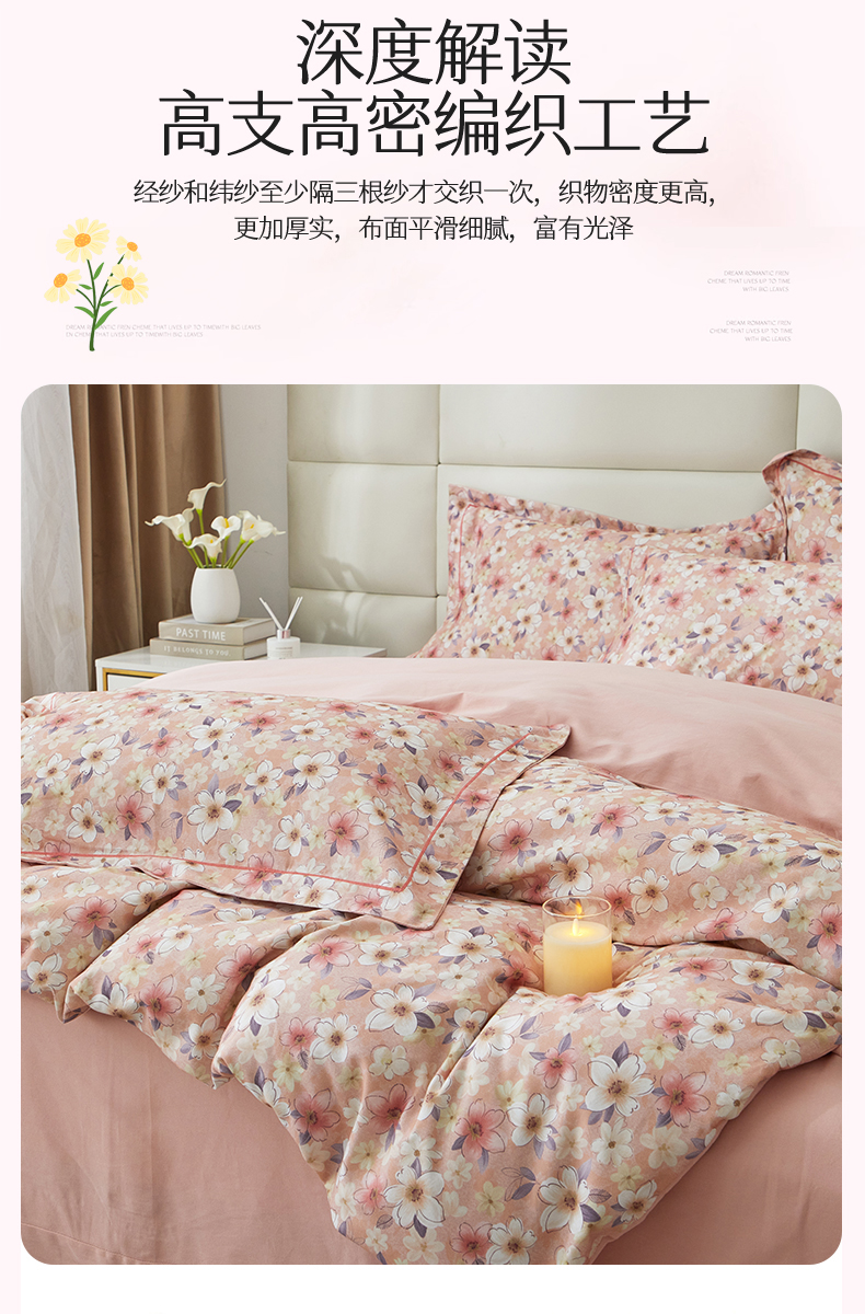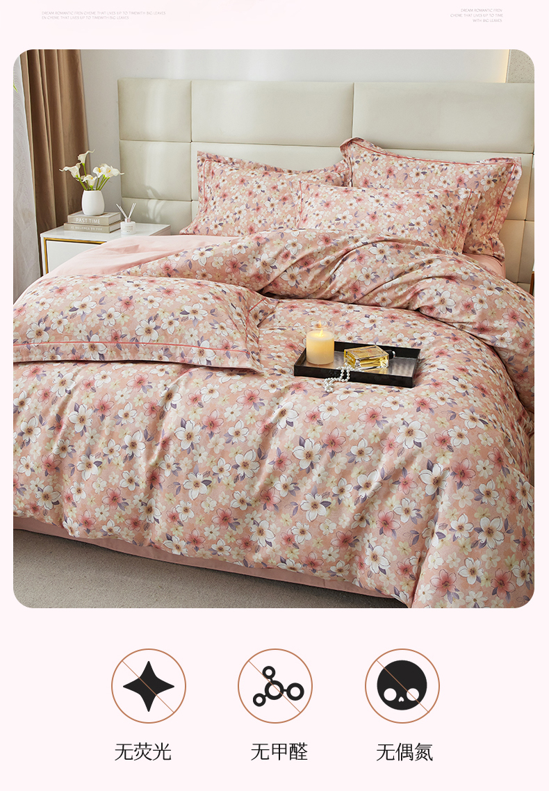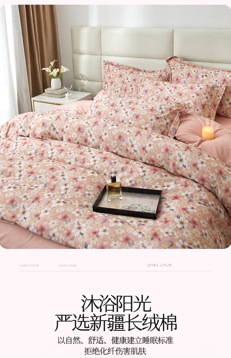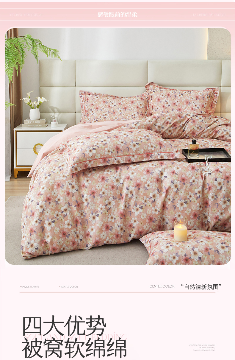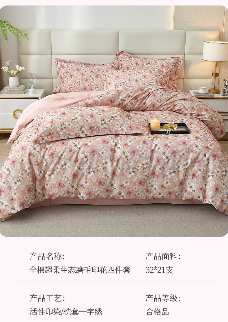 商品名称:品乐家纺 2024新款32支全棉超柔生态磨毛四件套 爱在花开-粉