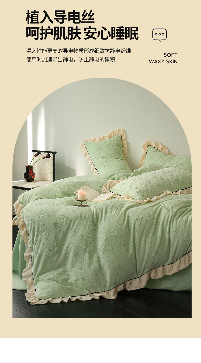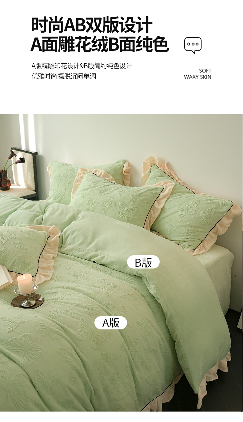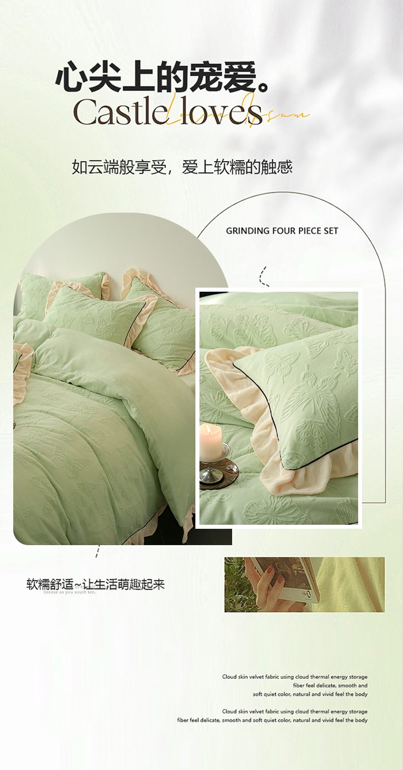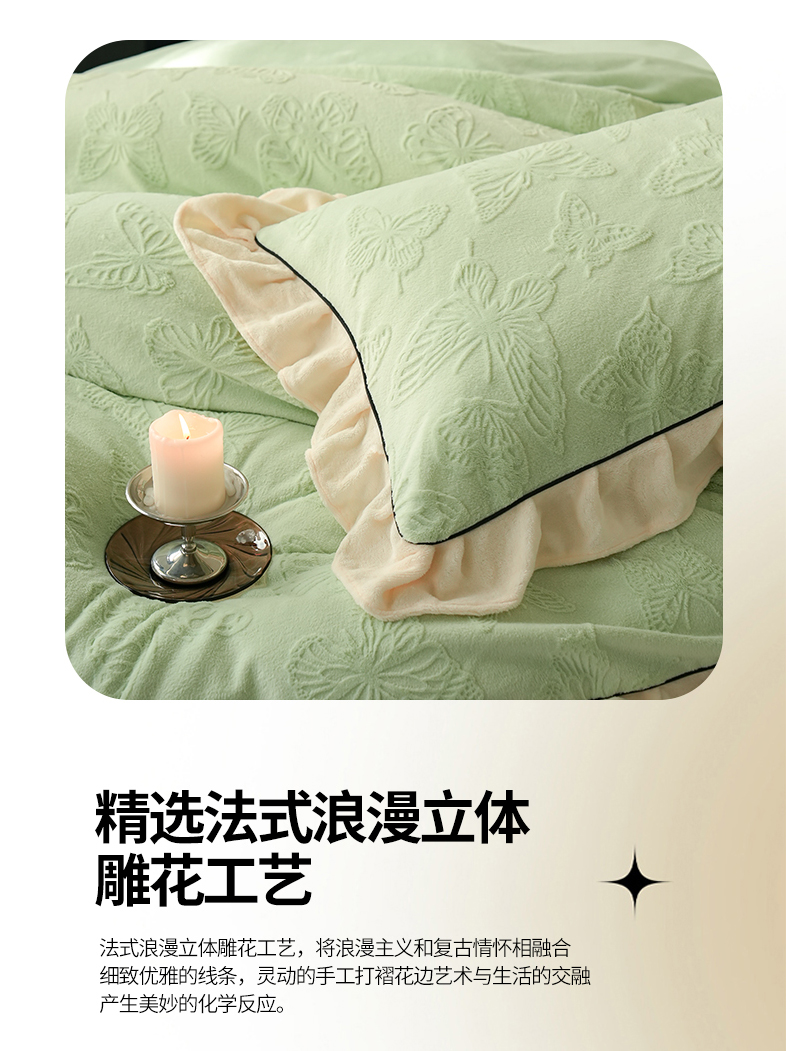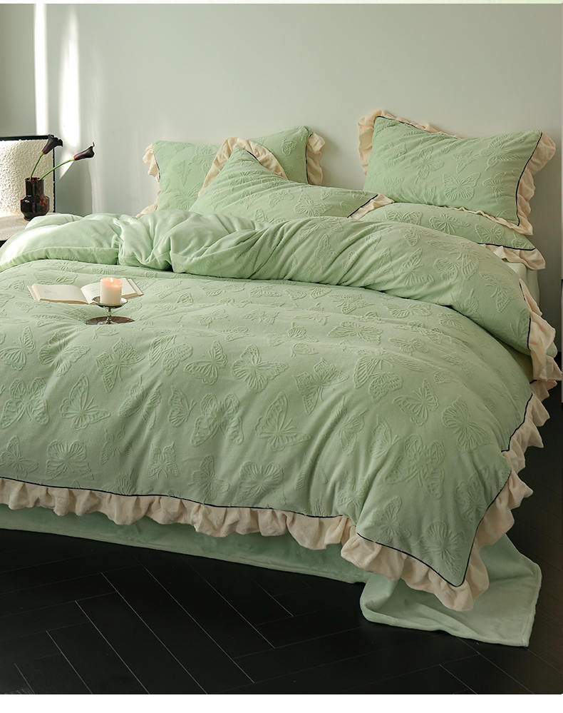 萝莉家纺 2024新款加厚牛奶绒提花浪漫雕花绒四件套 蝴蝶飞飞果绿