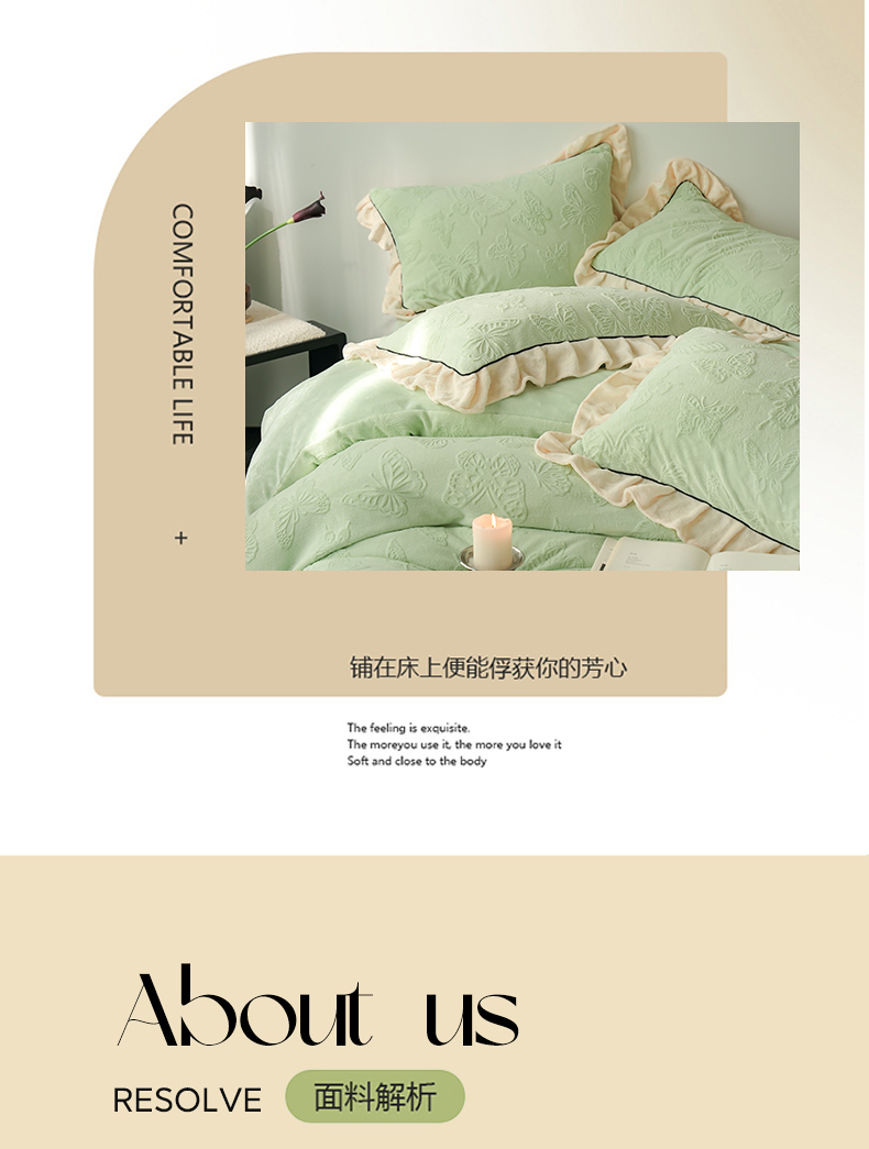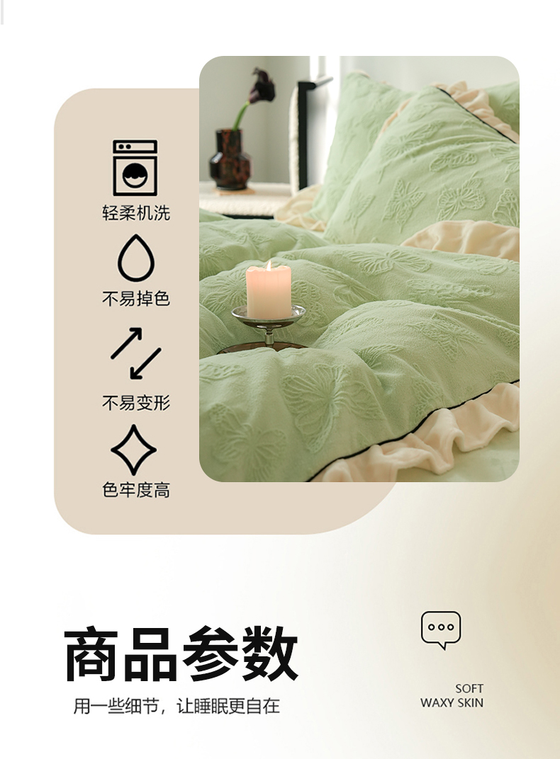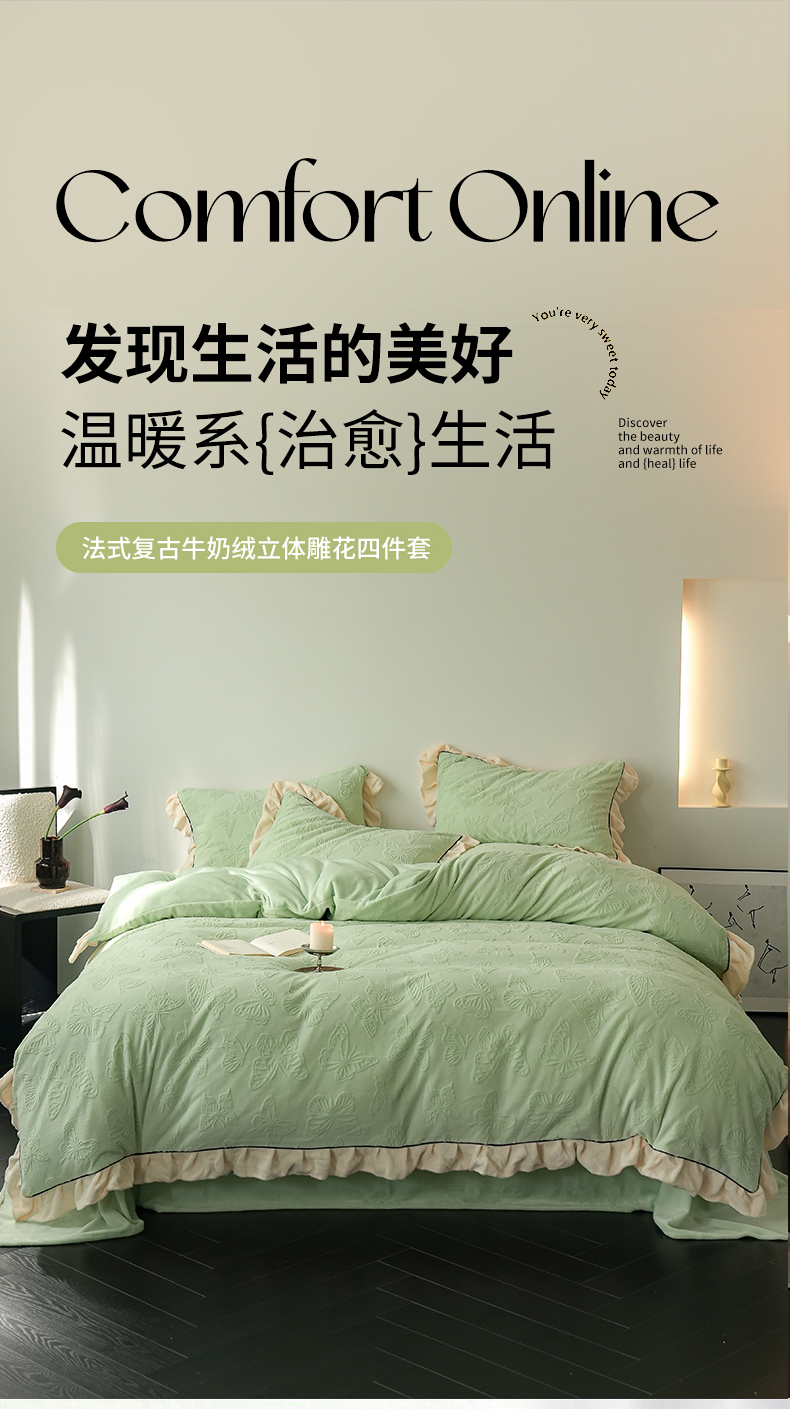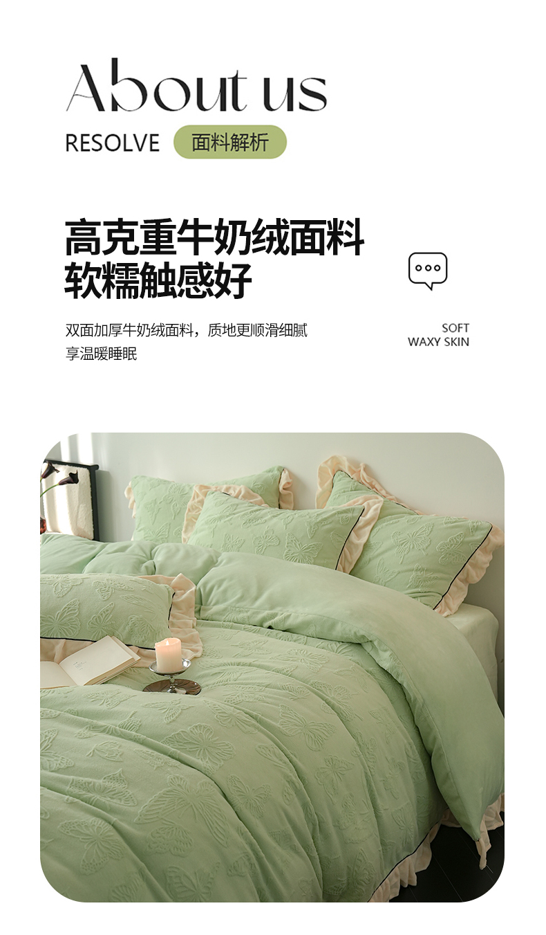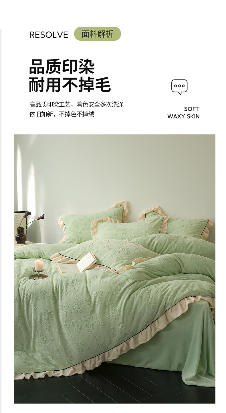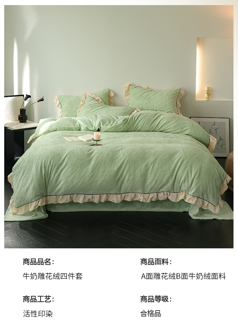 商品名称:萝莉家纺 2024新款加厚牛奶绒提花浪漫雕花绒四件套 蝴蝶飞飞果绿