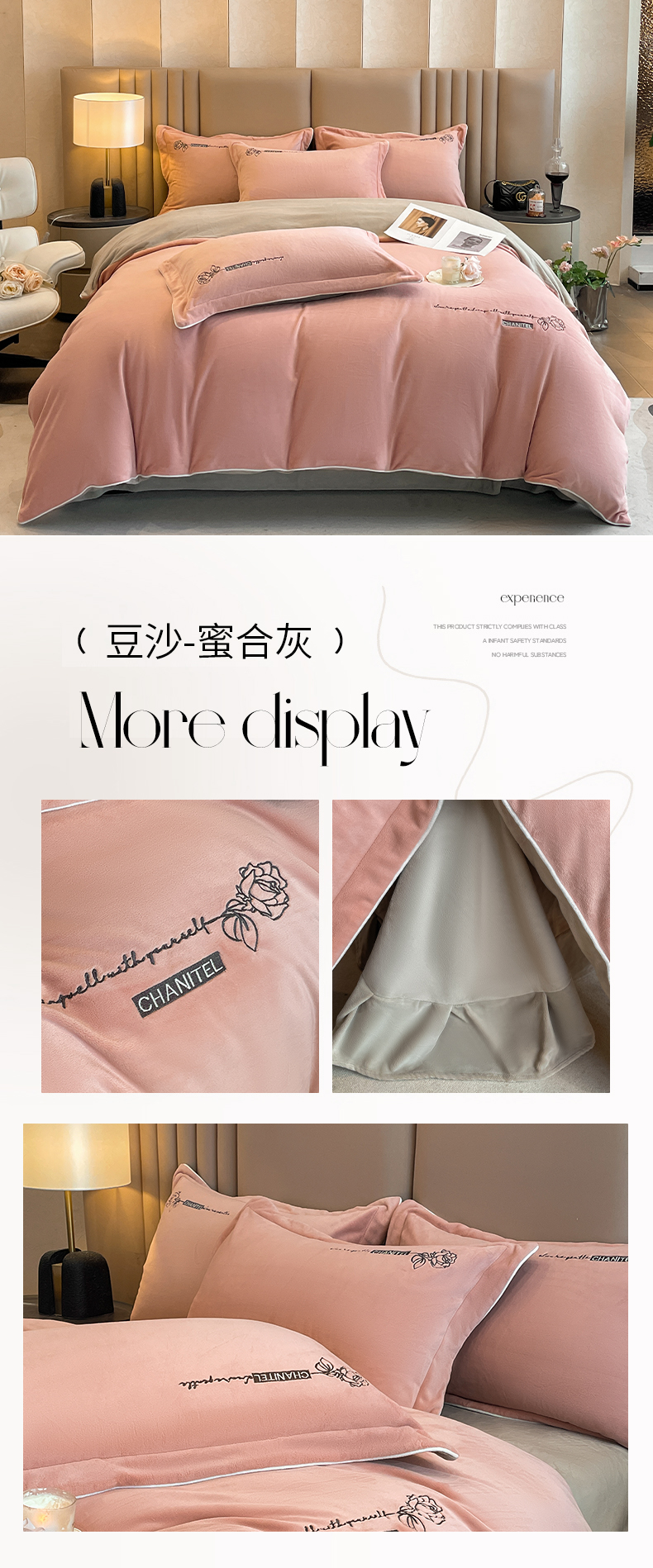 商品名称:嗯呢家纺 2024新款A类高克重全消光婴儿绒刺绣双拼四件套 豆沙-蜜合灰