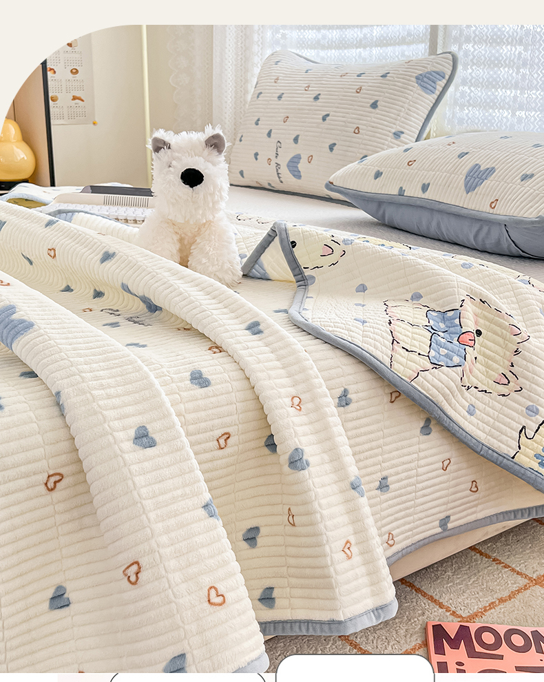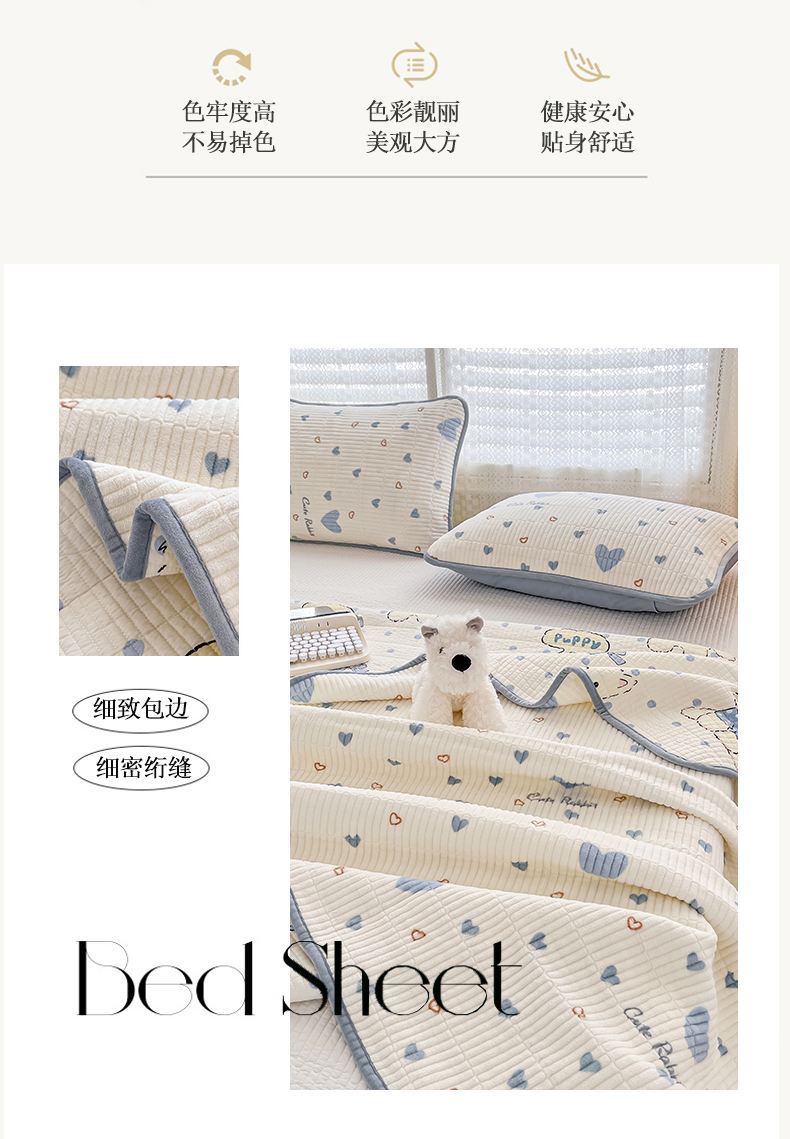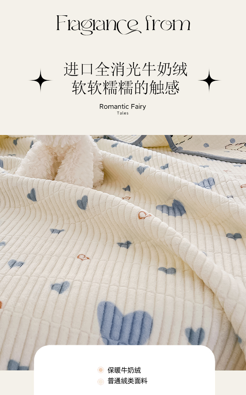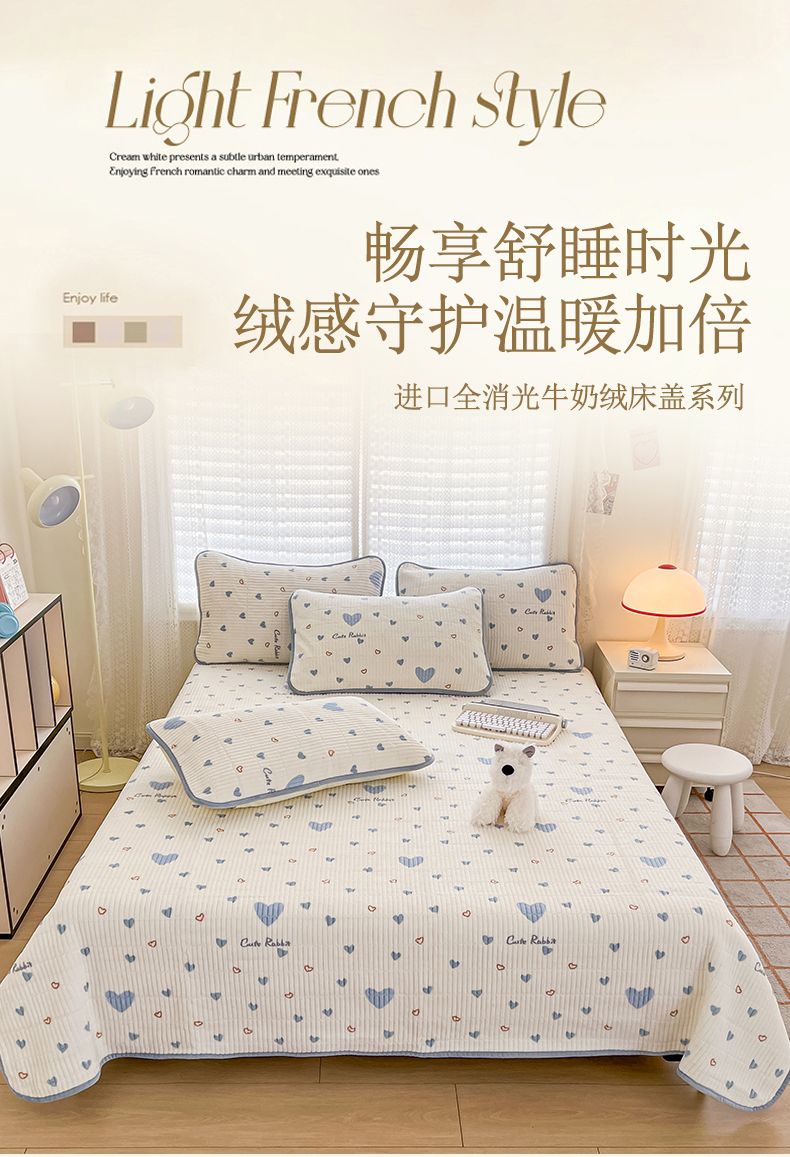 茉夕家纺 2024新款奶芙纯棉印花牛奶绒水洗床盖 奶芙-爱心蓝