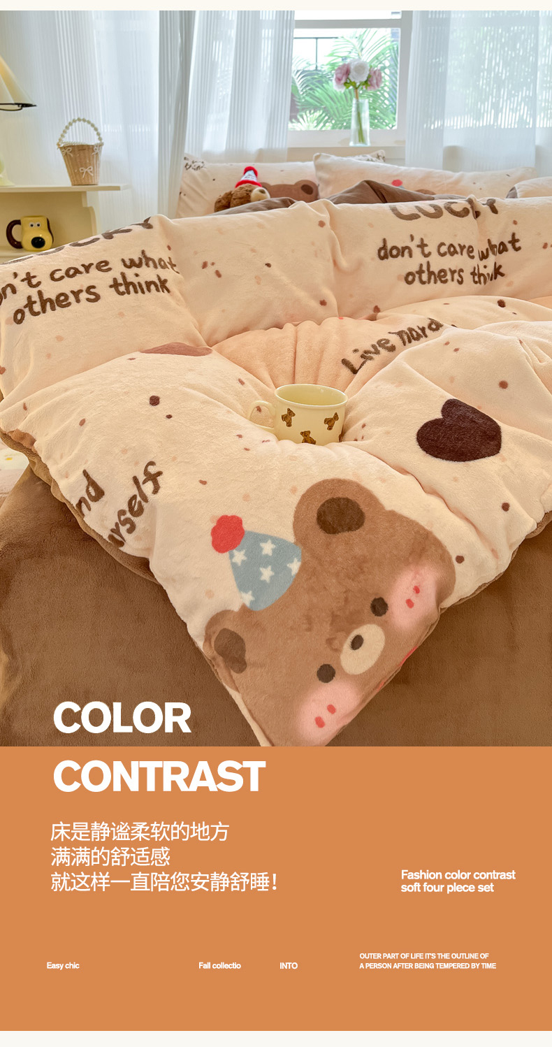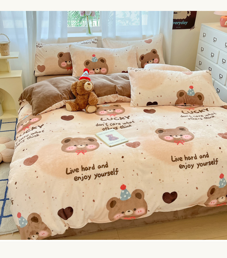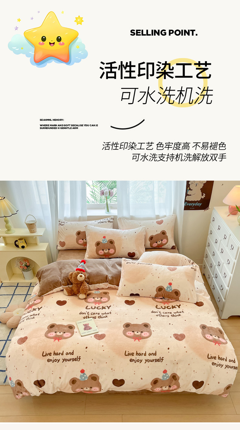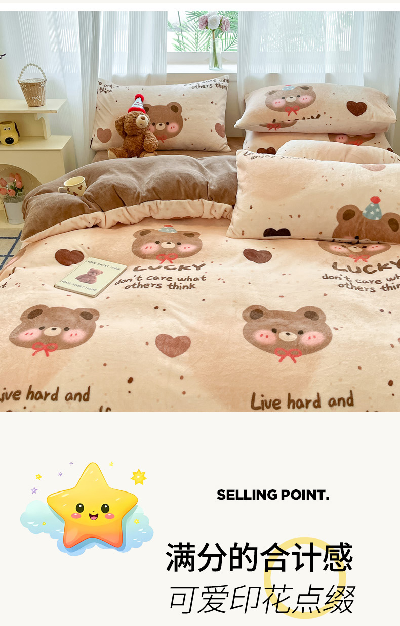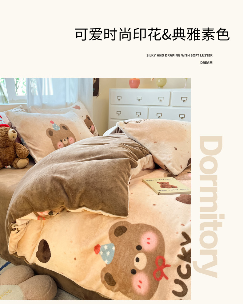 当前位置: 91家纺网 > 商品网购 > 床品套件 > 四件套 > 牛奶绒四件套 > 慕澄家纺 2024新款小清新可爱印花牛奶绒加厚保暖四件套 点点熊仔