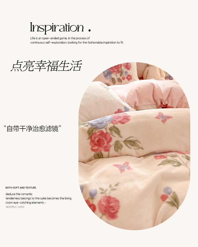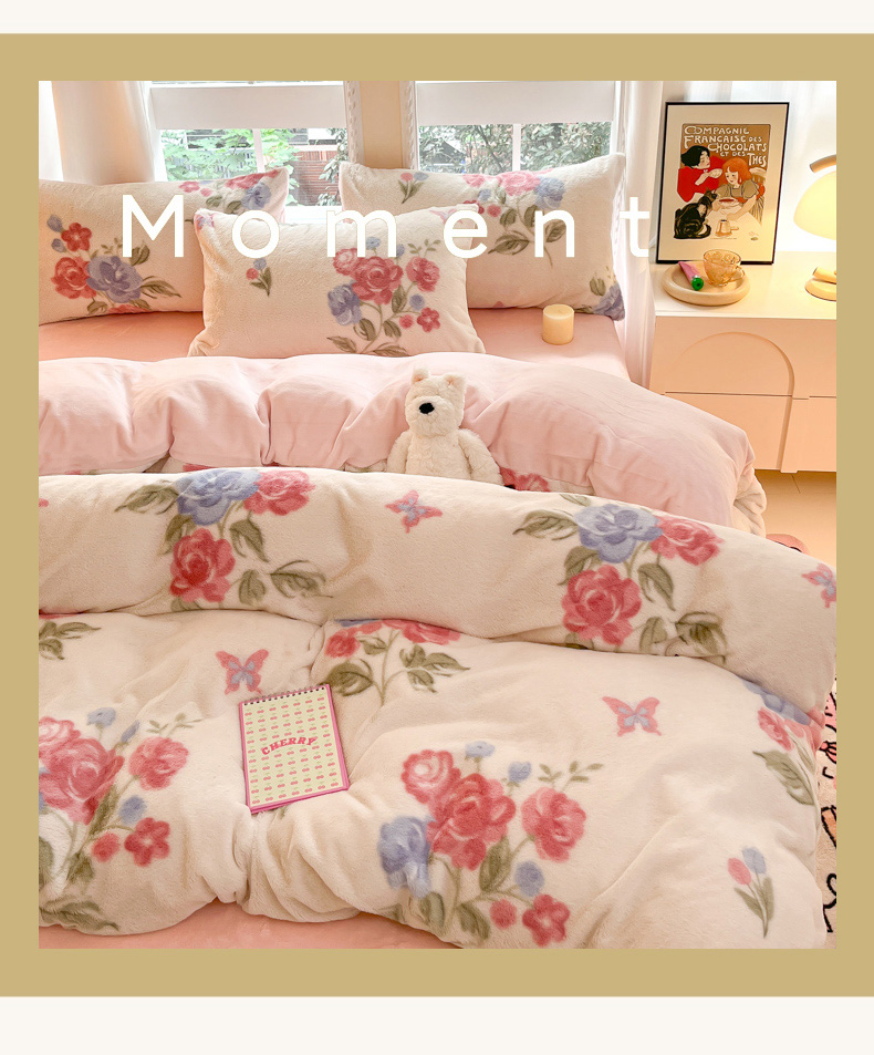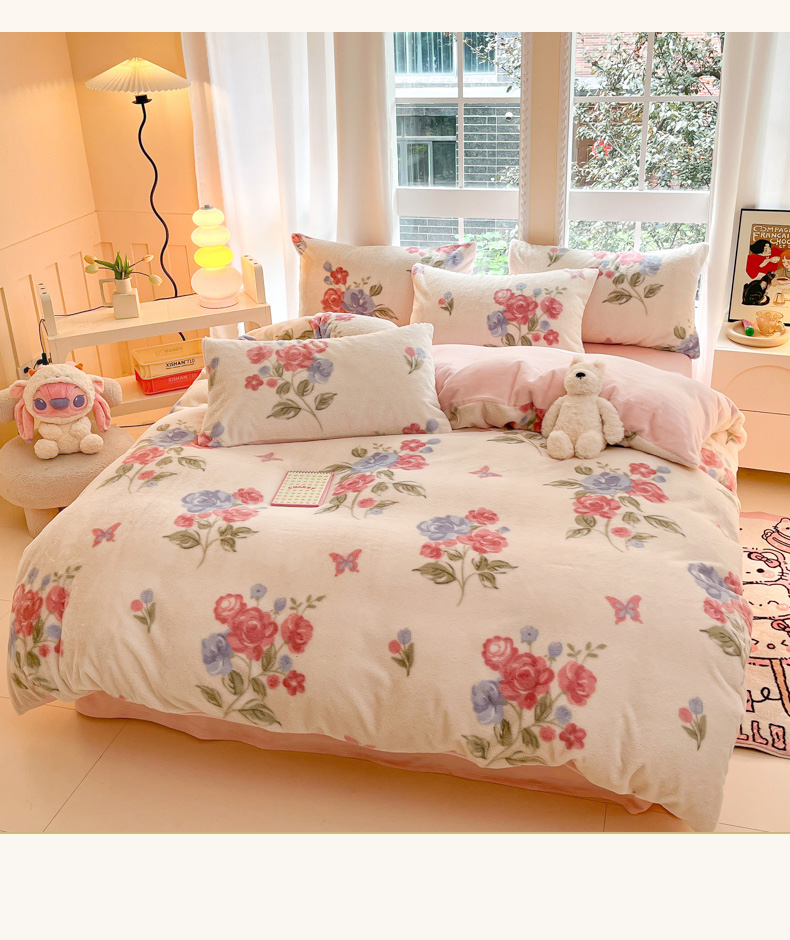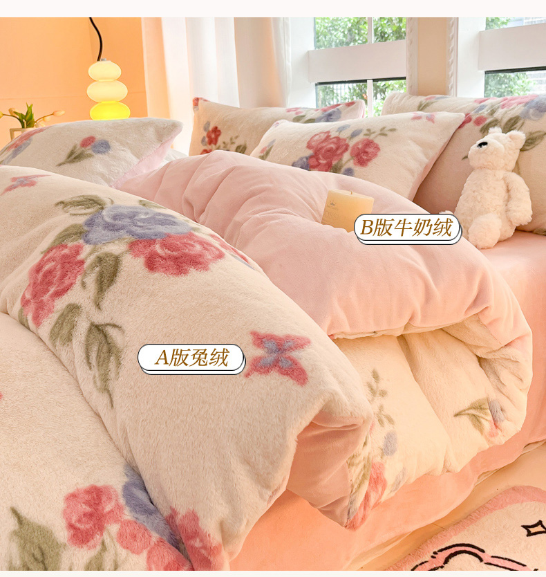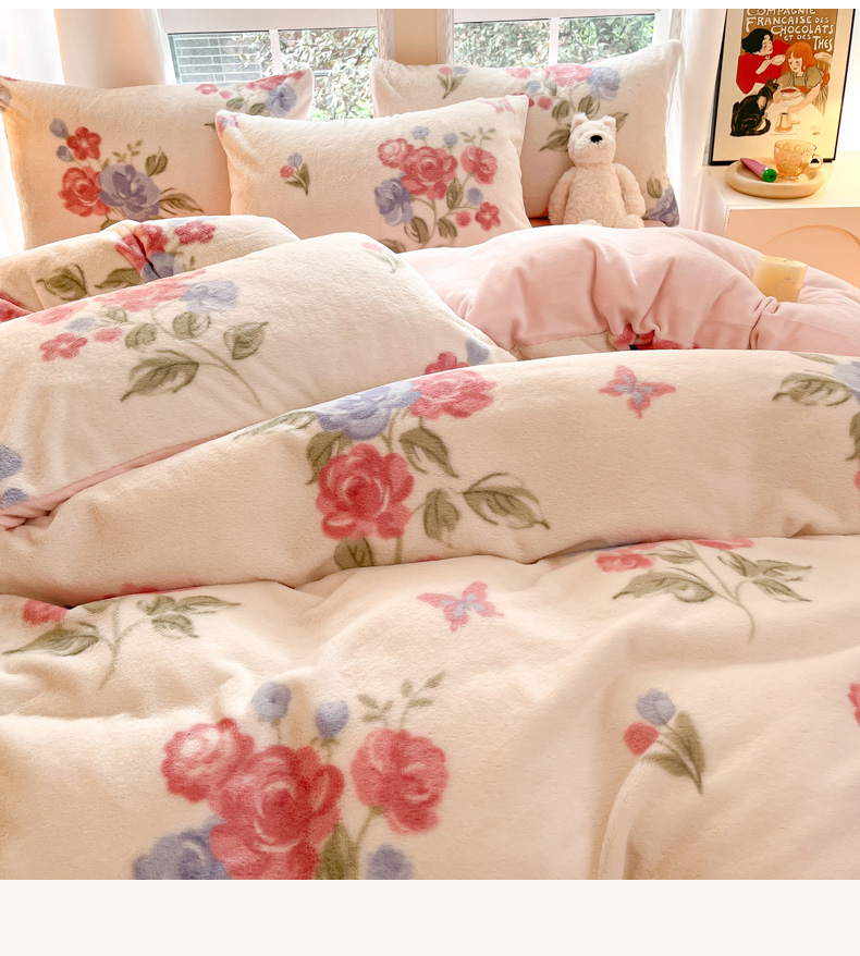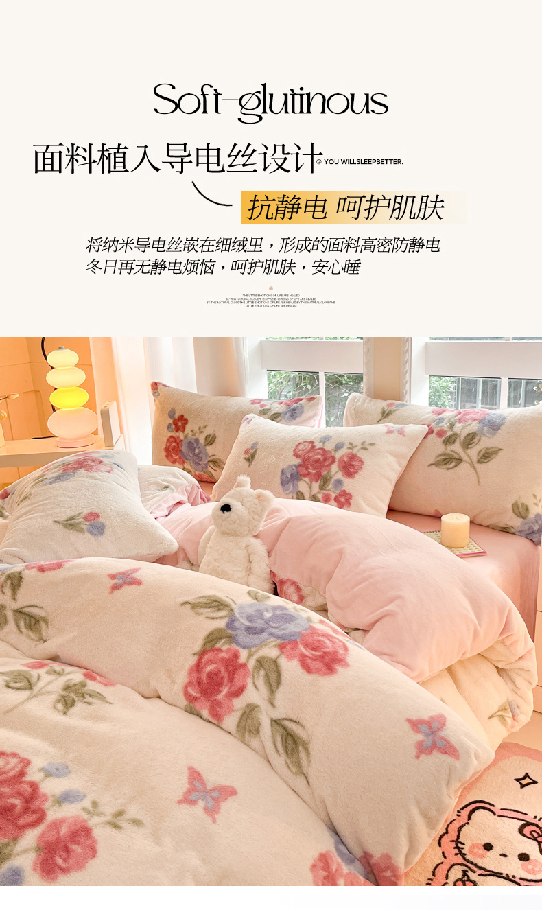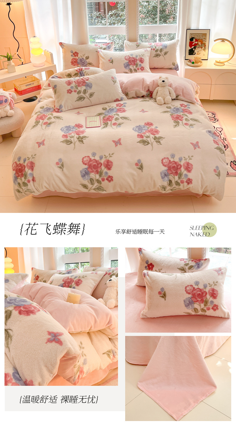 商品名称:慕澄家纺 2024新款兔绒牛奶绒加厚保暖印花四件套 花飞蝶舞