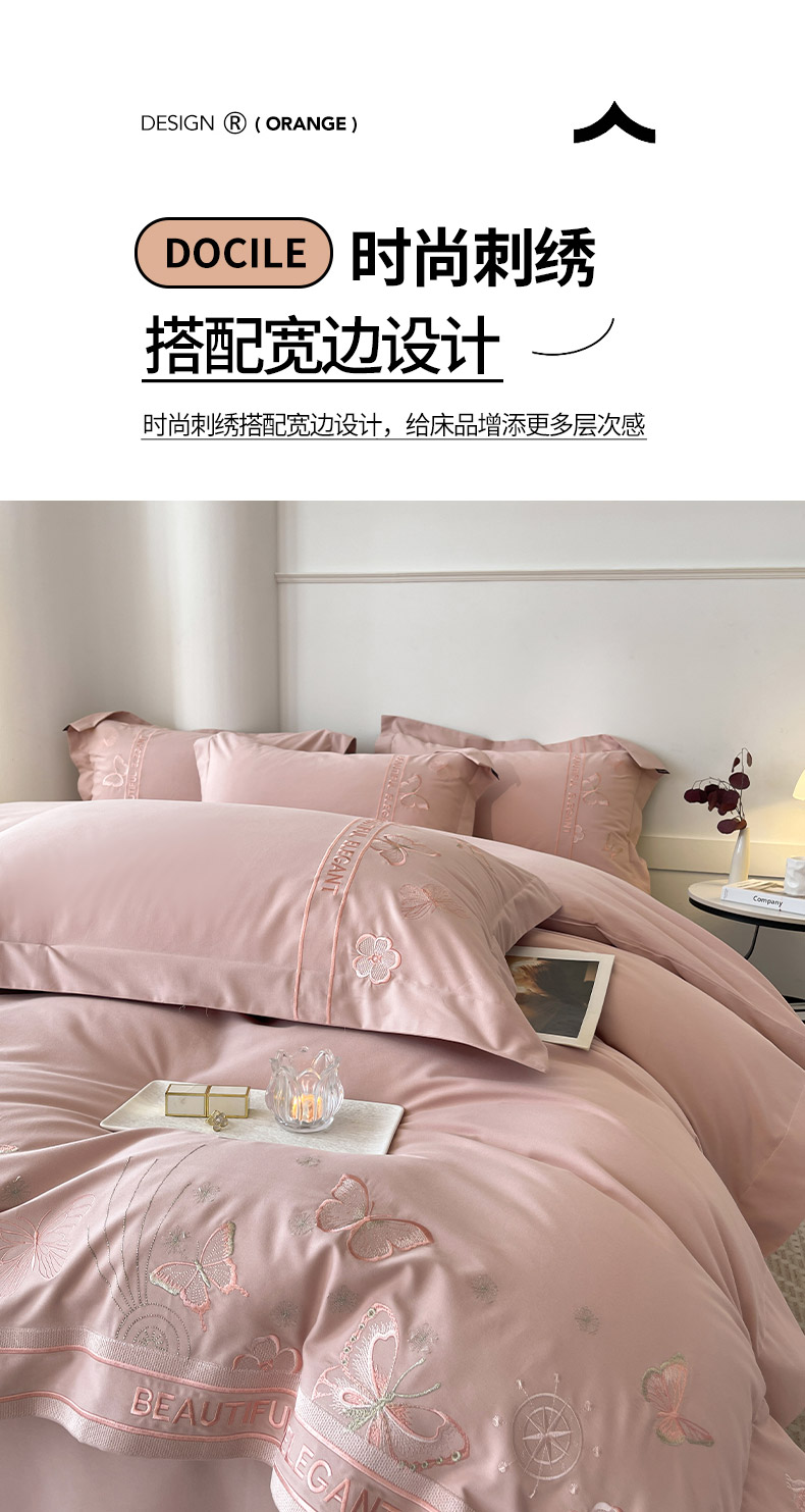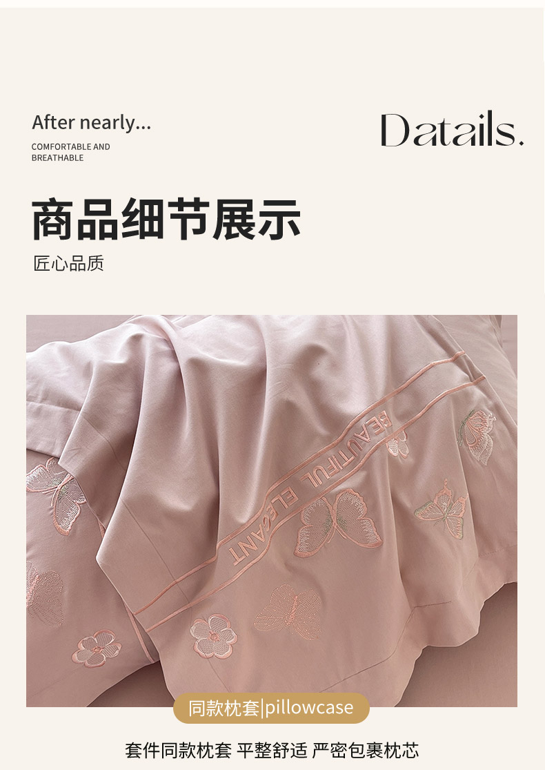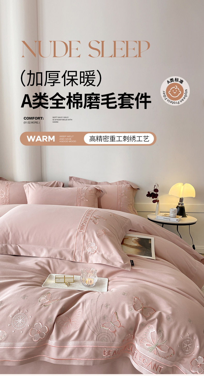 秋冬新品A类纯棉加厚磨毛四件套轻奢简约风蝴蝶床单被套床上用品晨光蝶语-红桃
