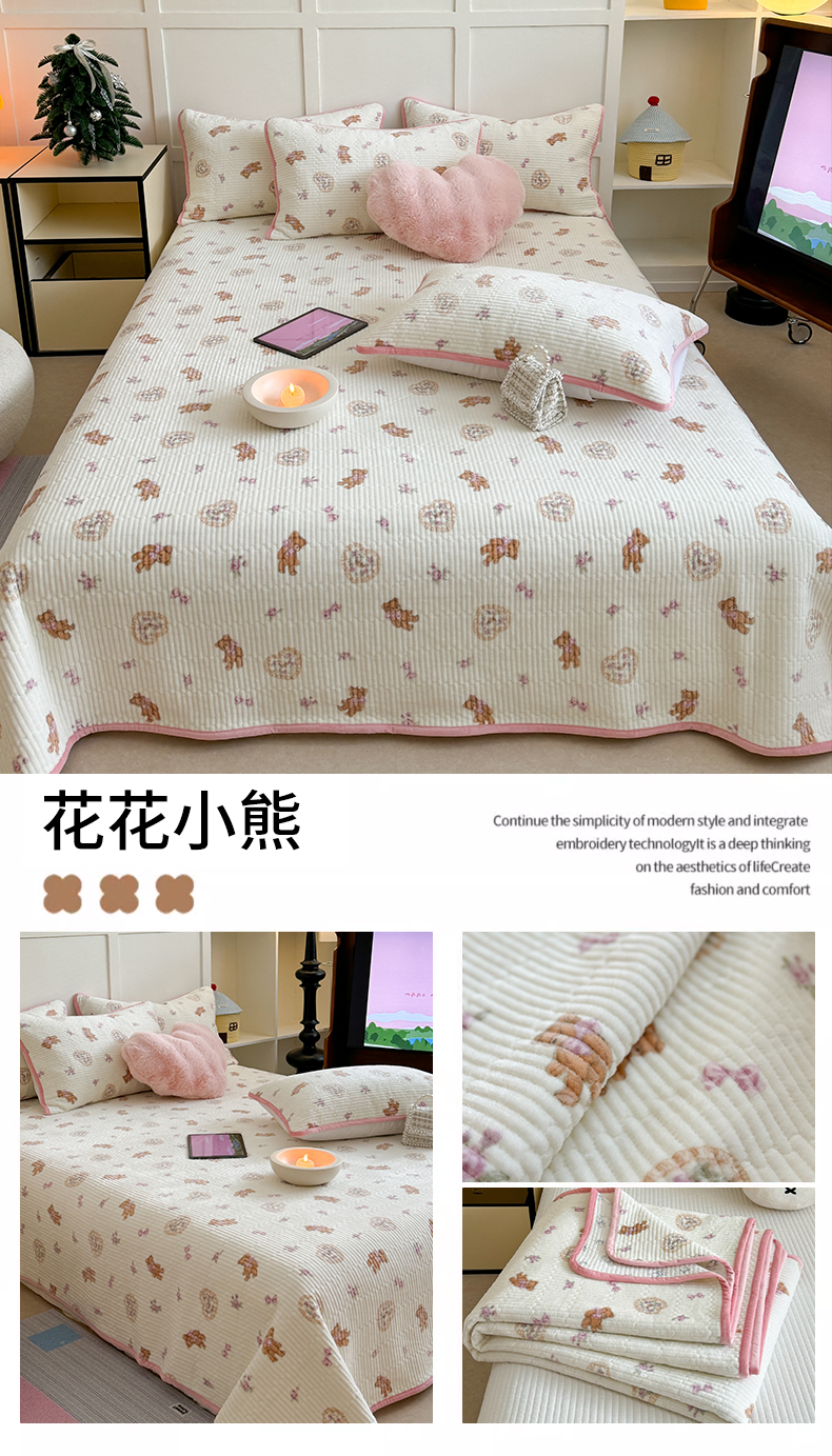 萝莉家纺 2024爆款印花牛奶绒夹棉绗缝床盖三件套 花花小熊
