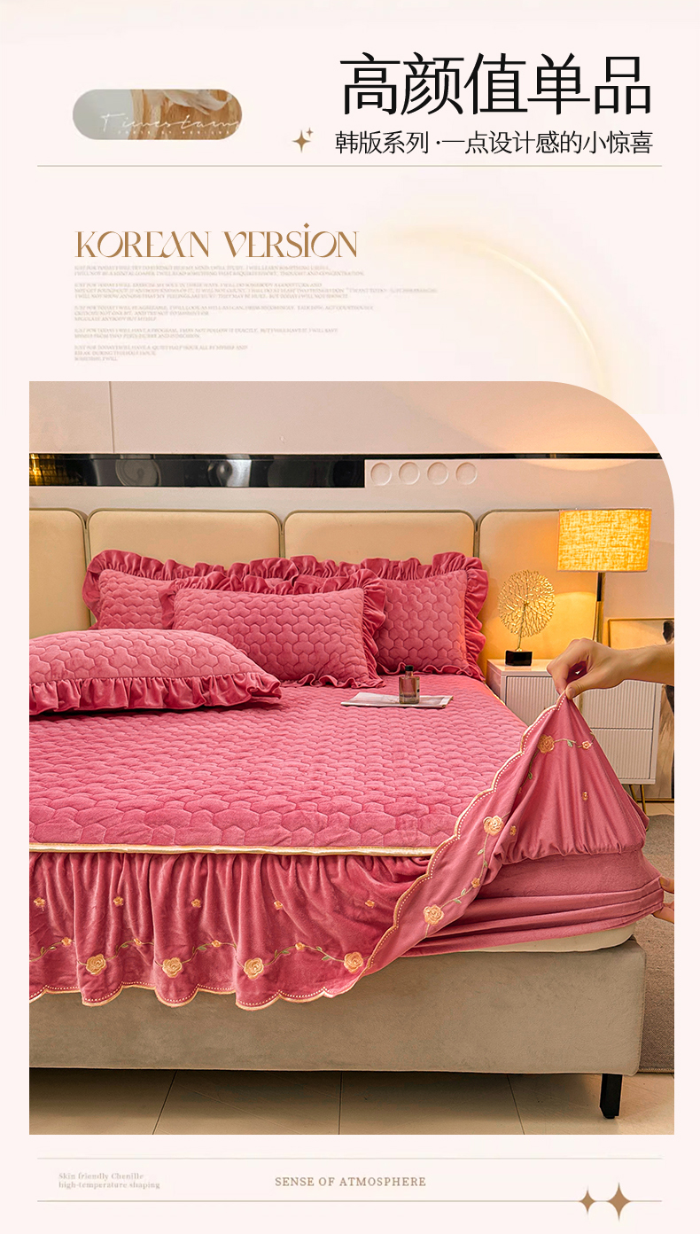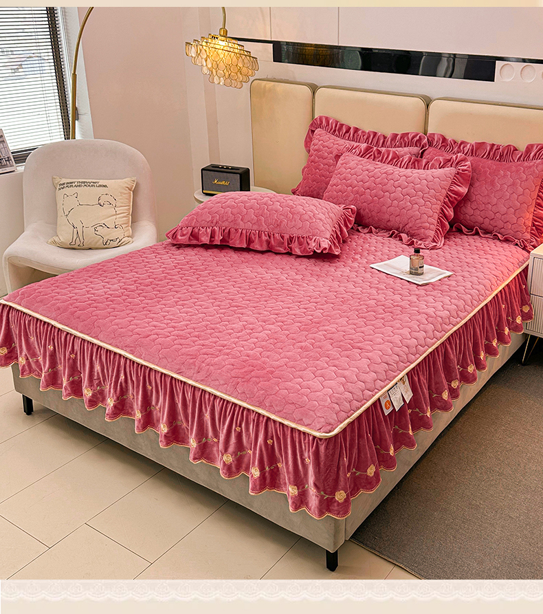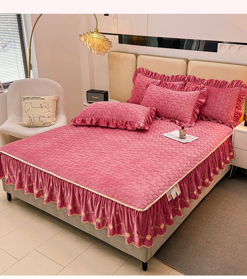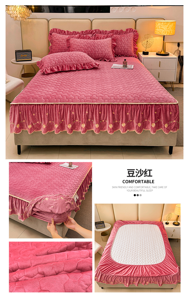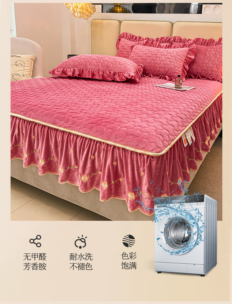 (总)恒爱家纺 2025新款牛奶绒贴布绣夹棉床裙四件套,豆沙红,浪漫紫,天空蓝,温馨粉,象牙白