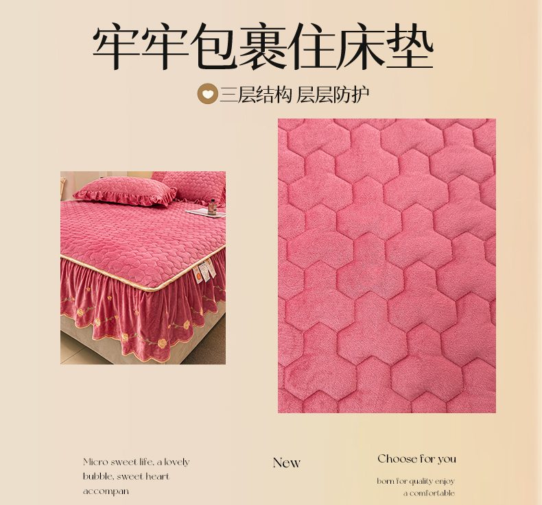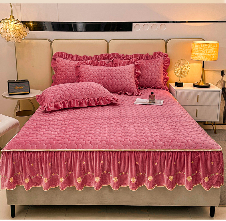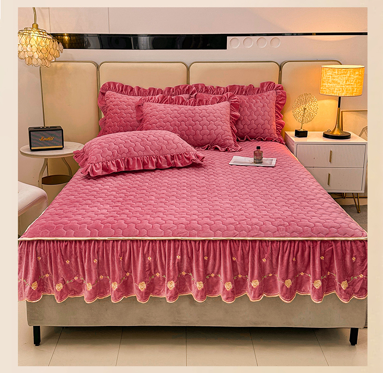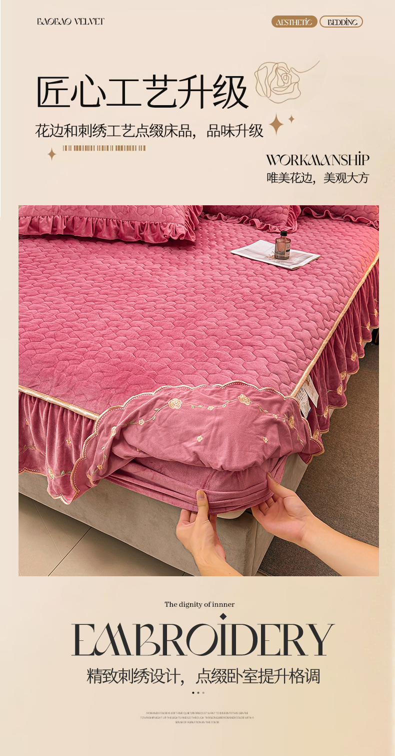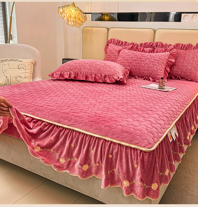 (总)恒爱家纺 2025新款牛奶绒贴布绣夹棉床裙四件套,豆沙红,浪漫紫,天空蓝,温馨粉,象牙白