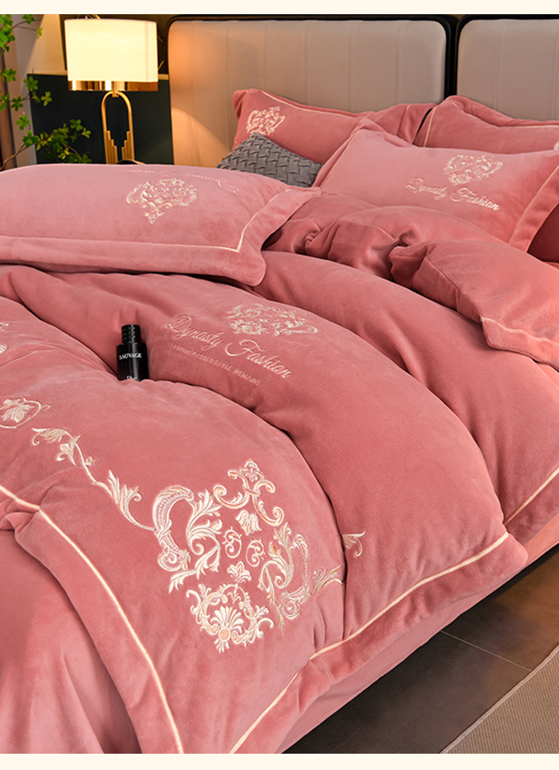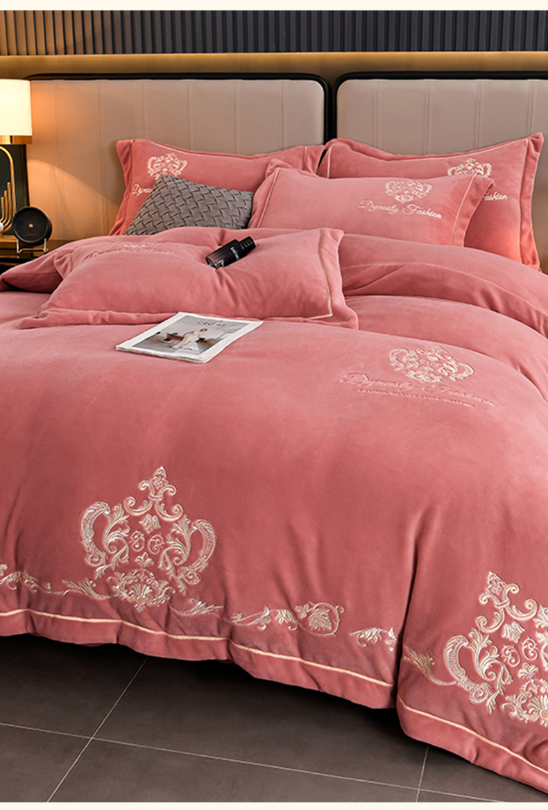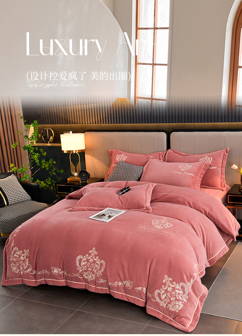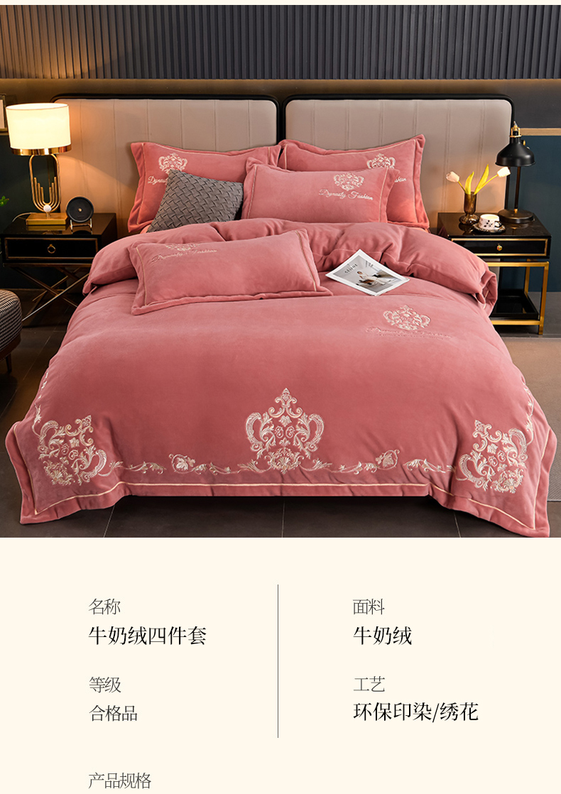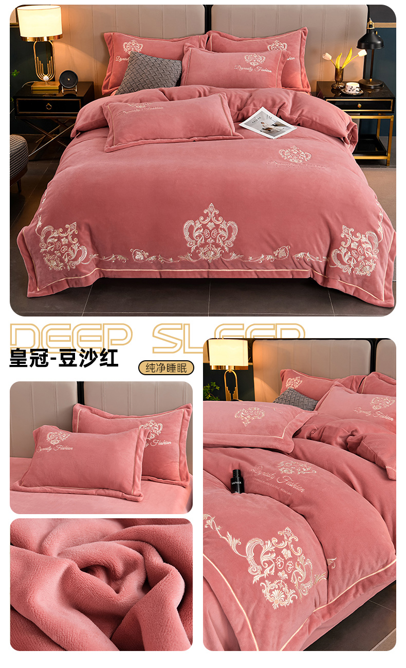 沐妍家纺 2024新款重工刺绣绣花纯色牛奶绒四件套皇冠-豆沙红