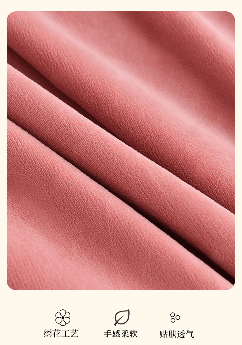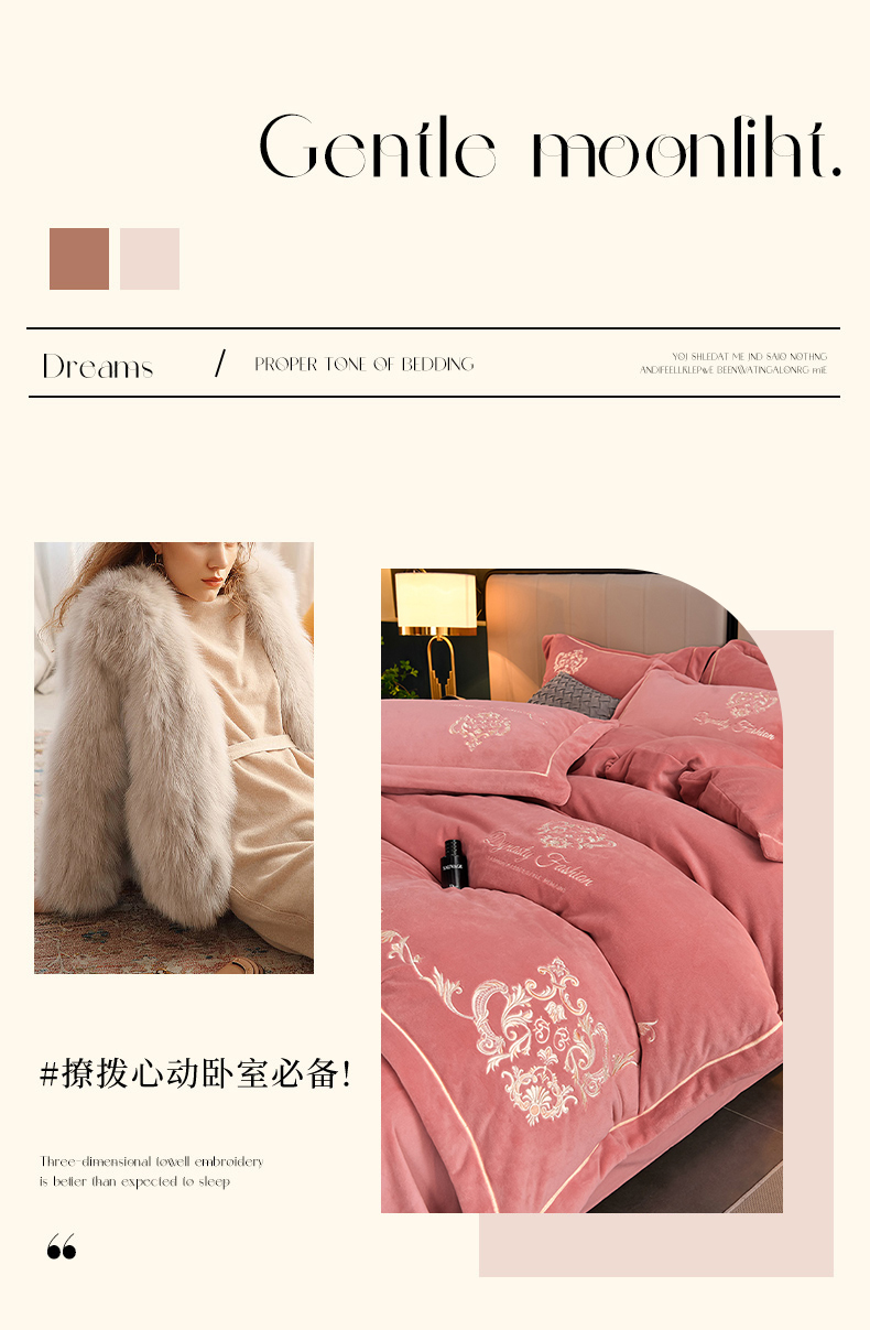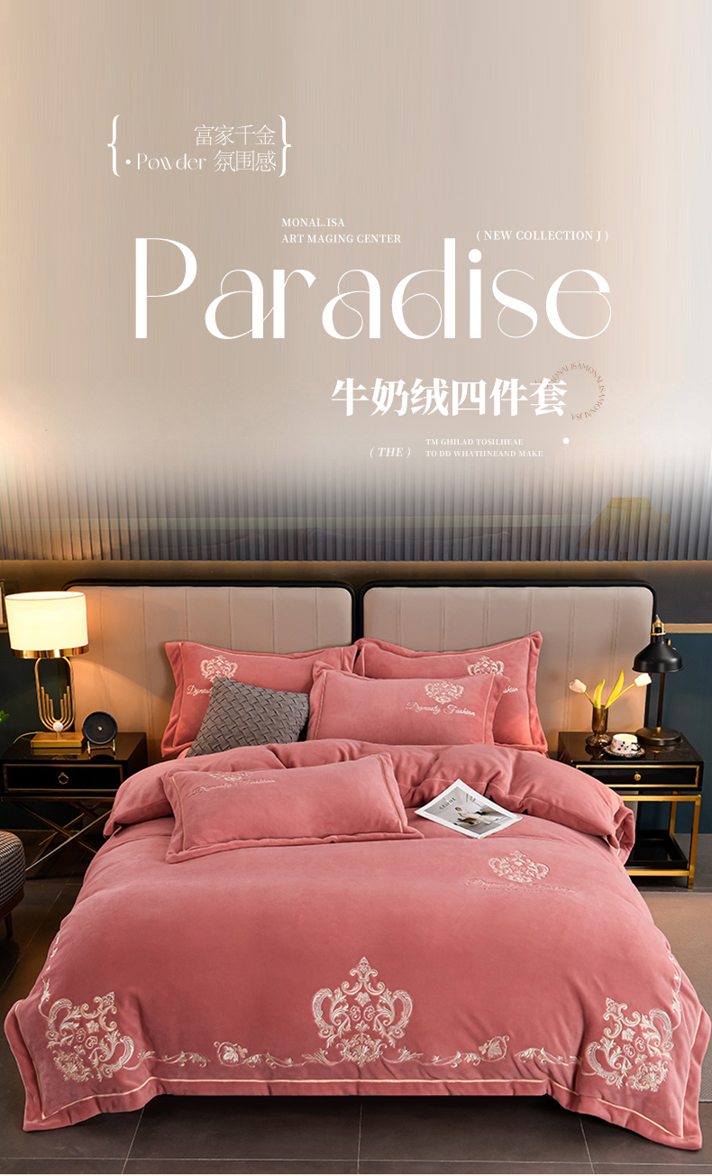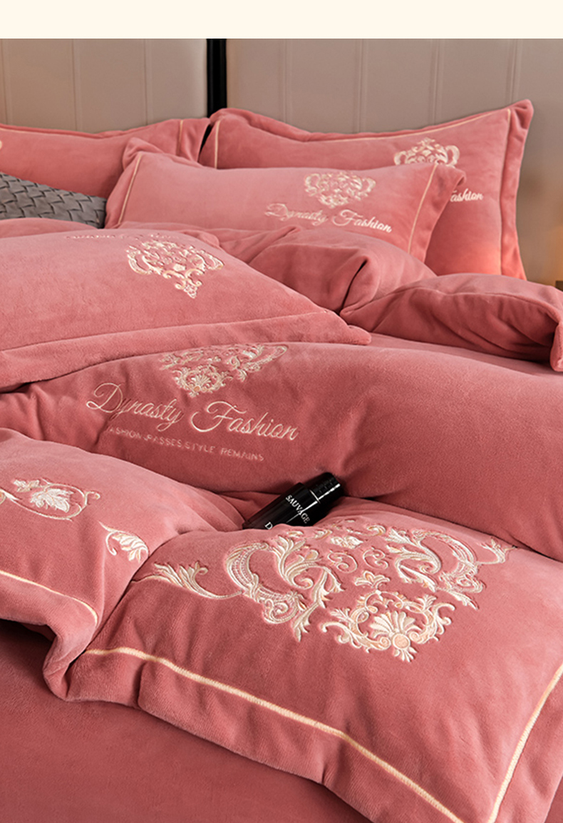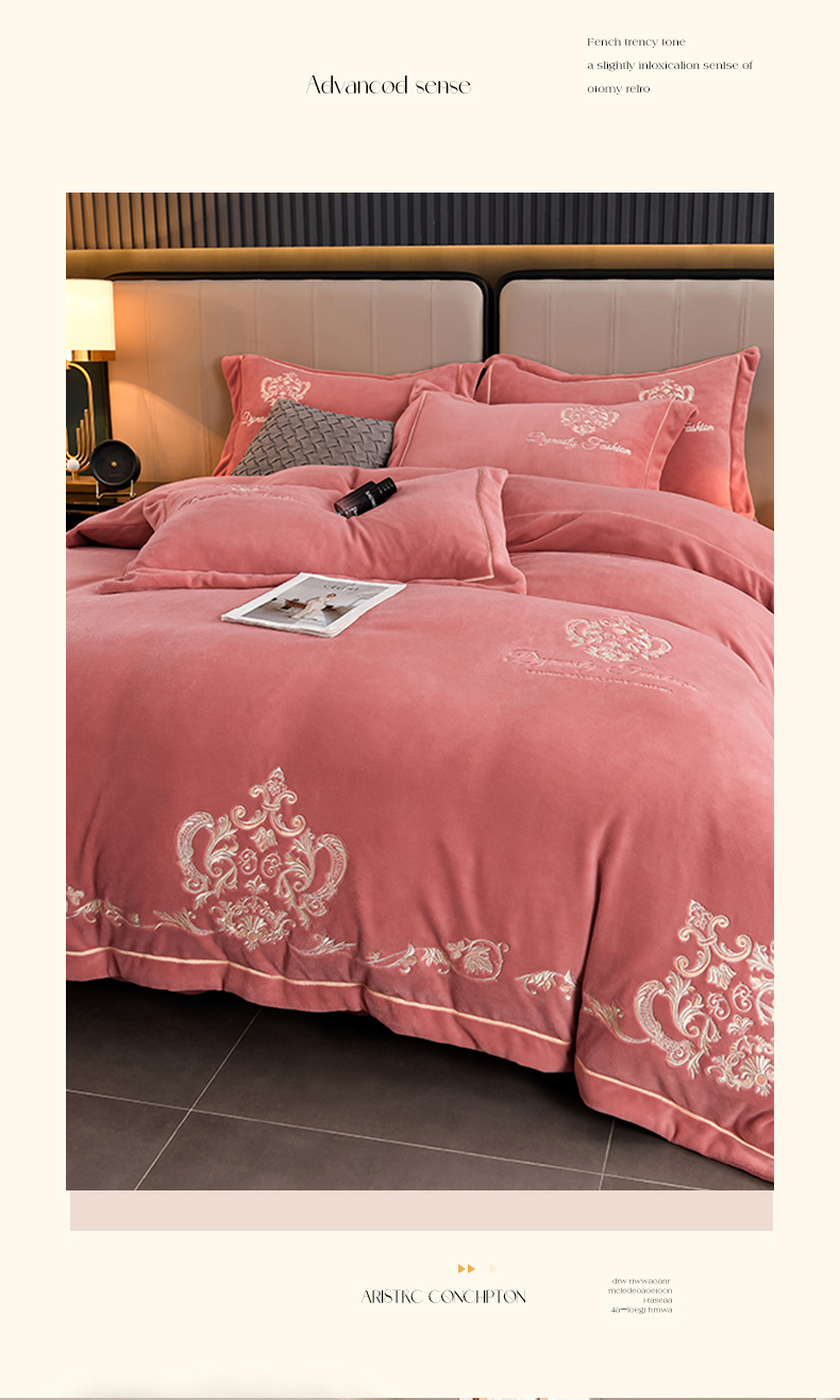 沐妍家纺 2024新款重工刺绣绣花纯色牛奶绒四件套皇冠-豆沙红
