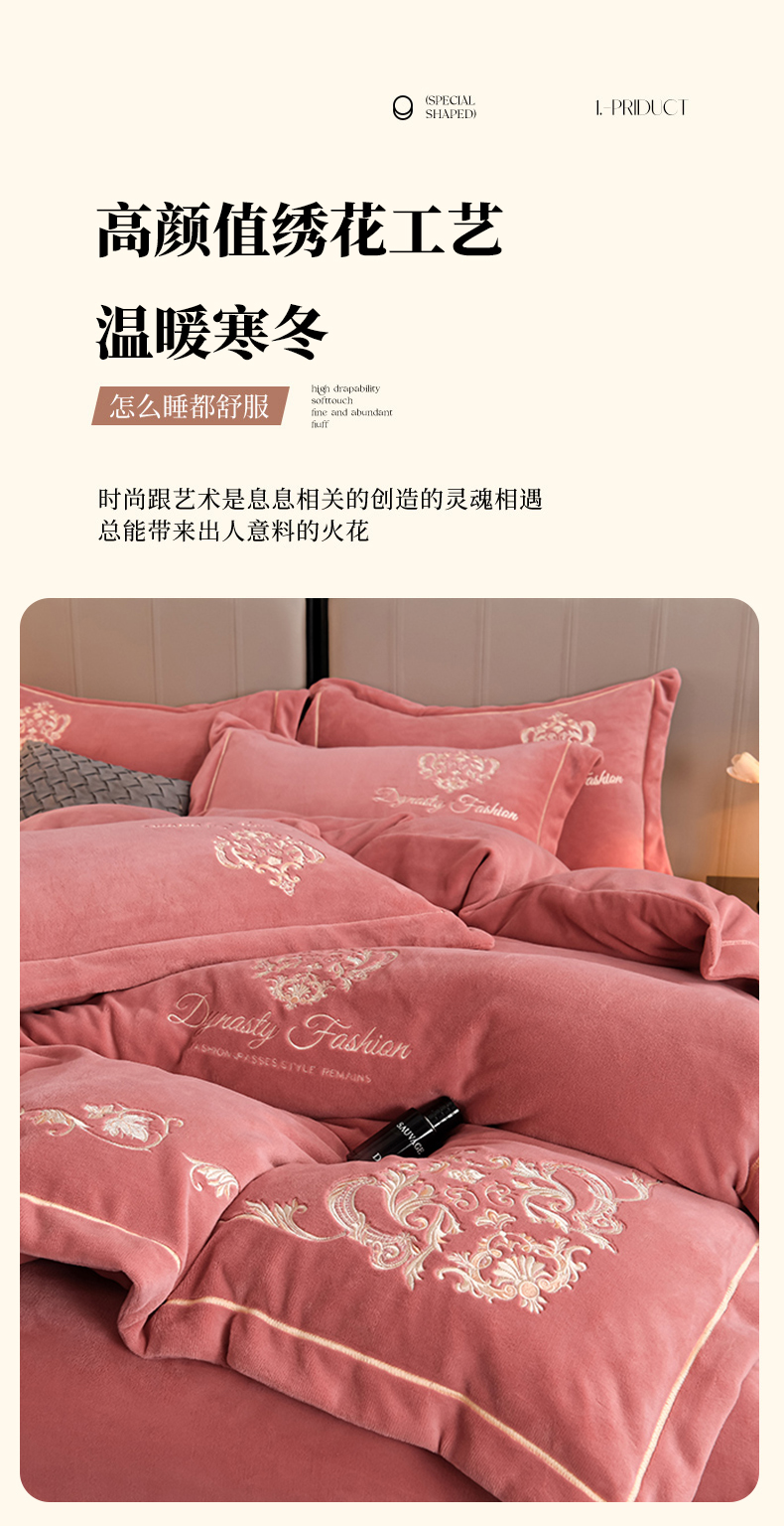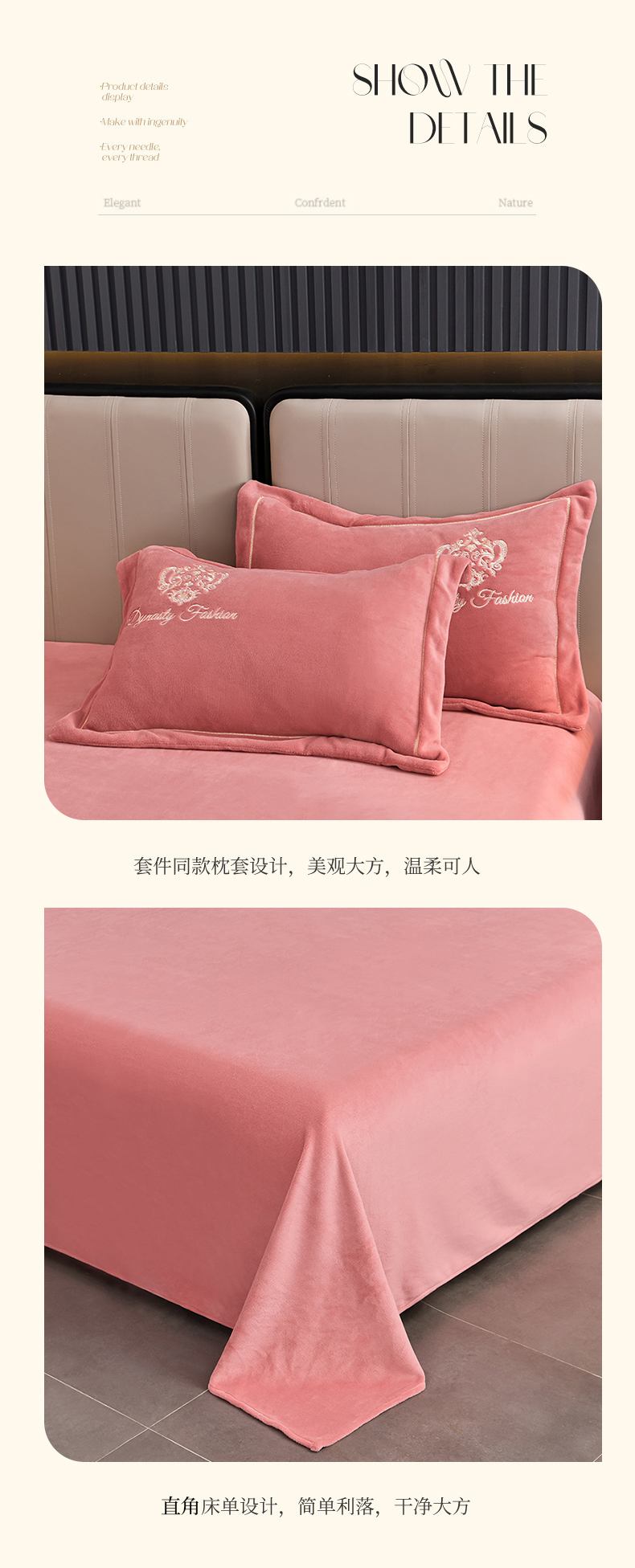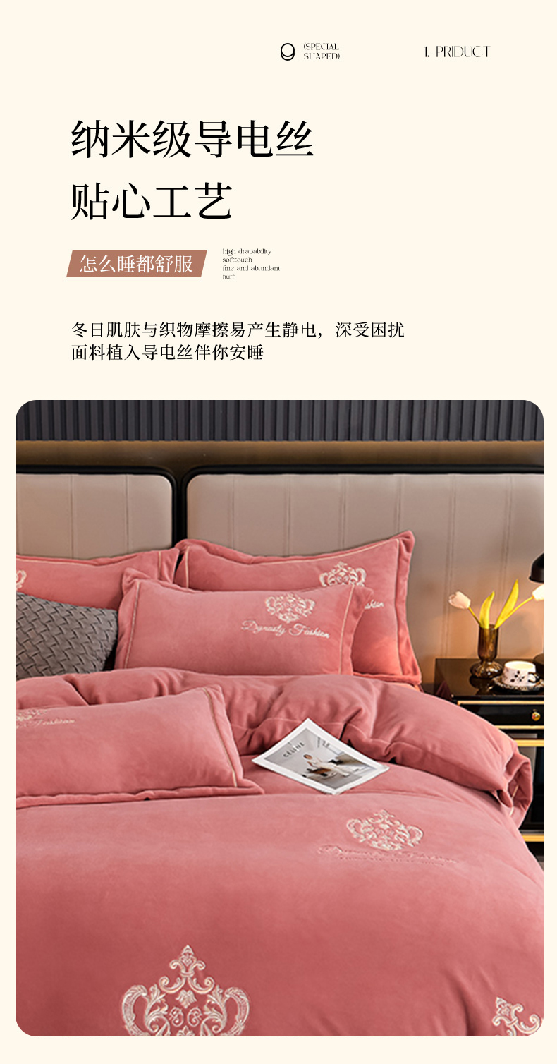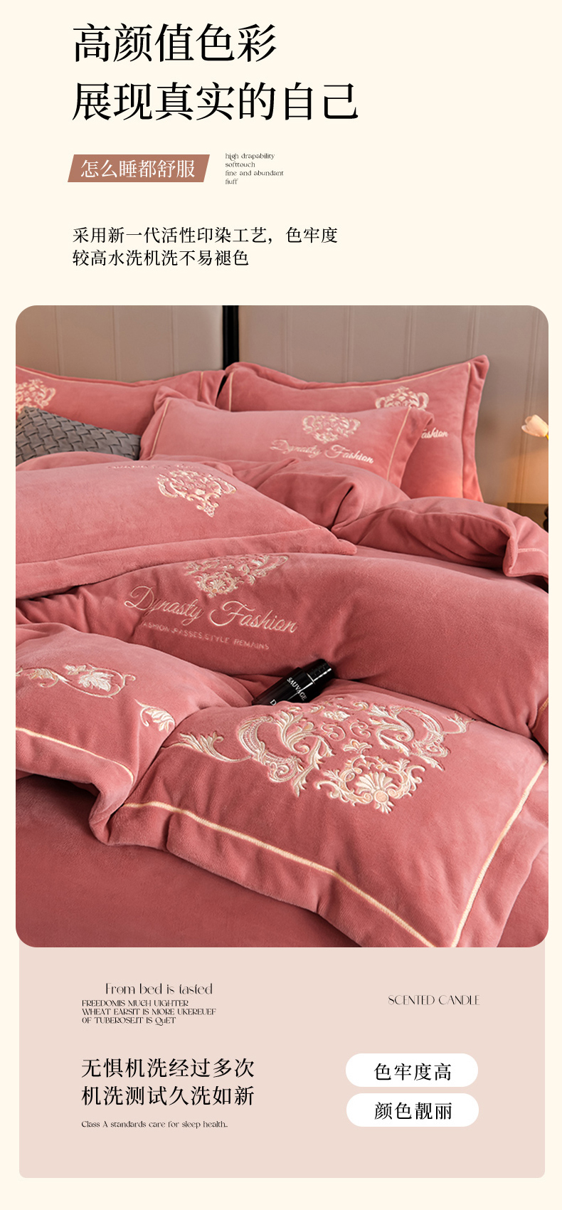 沐妍家纺 2024新款重工刺绣绣花纯色牛奶绒四件套皇冠-粉玉,皇冠-粉玉