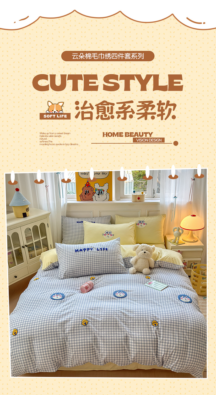 当前位置: 91家纺网 > 商品网购 > 床品套件 > 四件套 > 其它四件套 > 罗亿家纺 2025新款韩版糯糯棉(110克)毛巾绣四件套-场景三(提供买家秀) 小蓝叮当