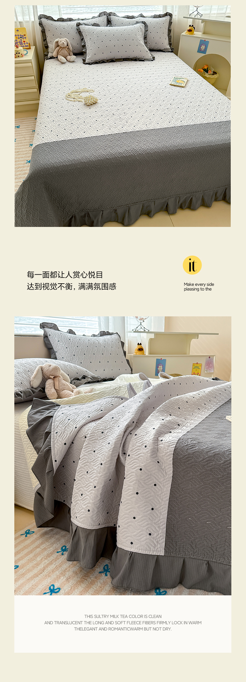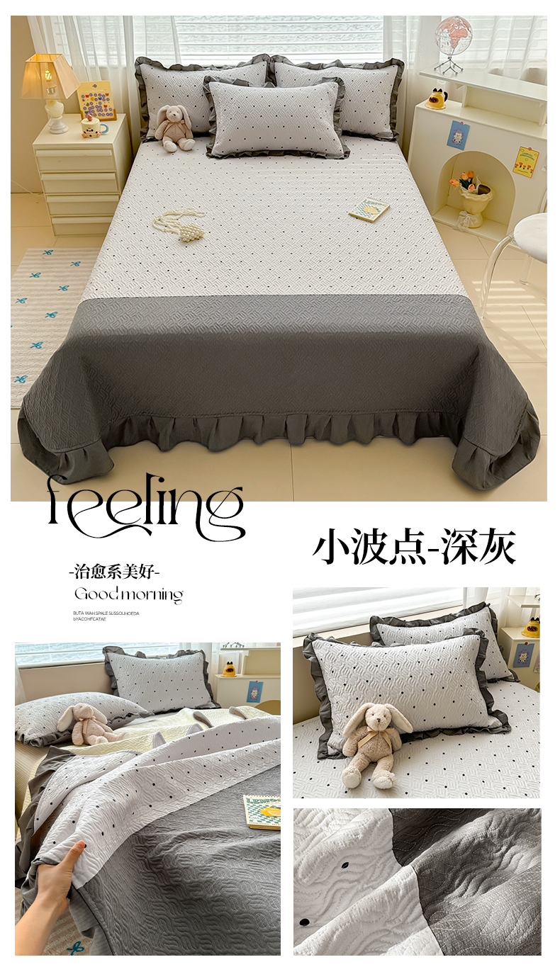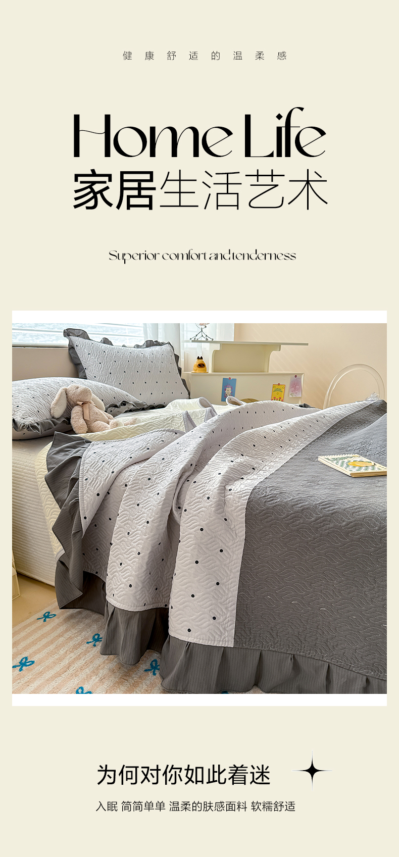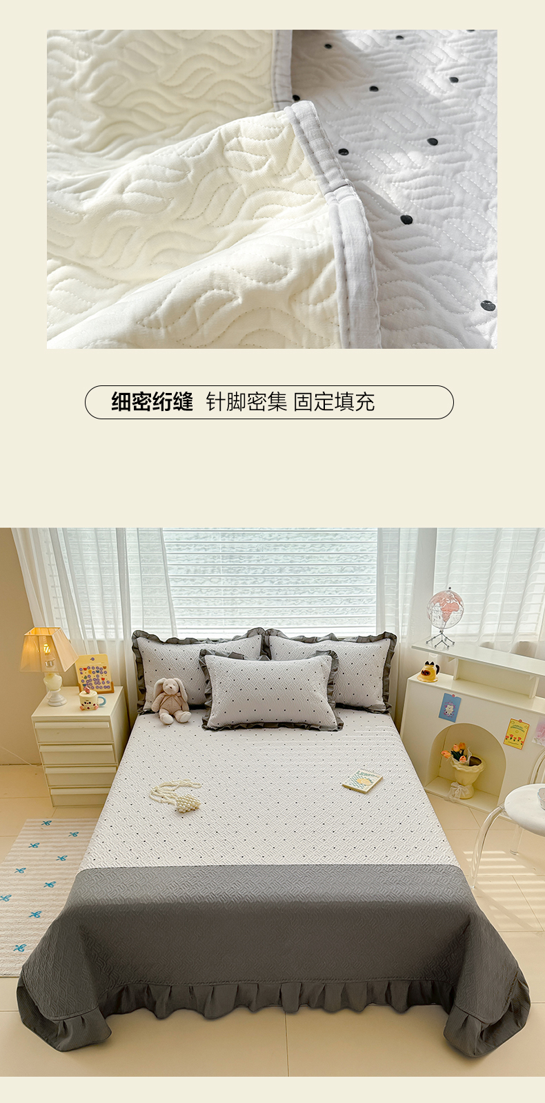 商品名称:2025新款木棉夹棉花边拼接床盖系列 小波点-深灰
