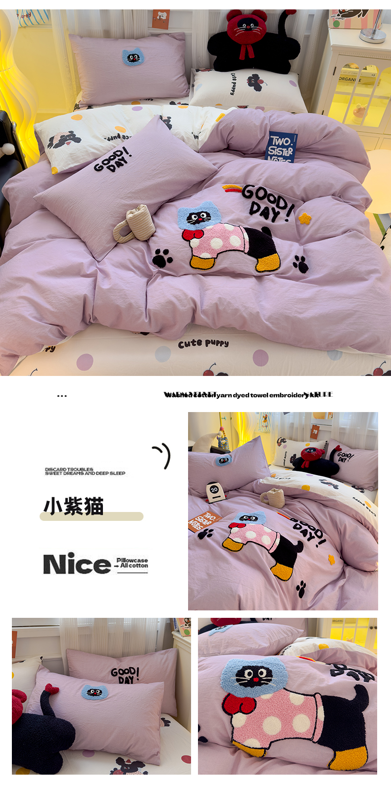 当前位置: 91家纺网 > 商品网购 > 床品套件 > 四件套 > 水洗棉四件套 > 颜选 2025新款水洗棉毛巾绣四件套 小紫猫