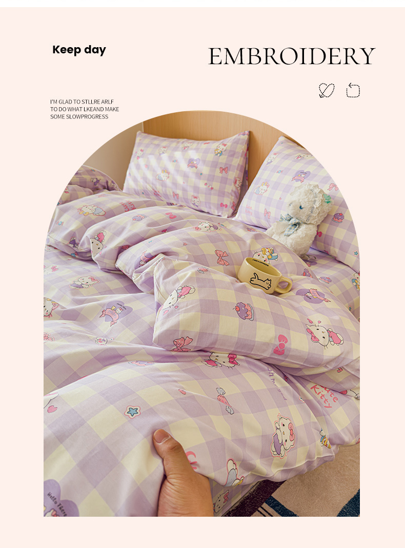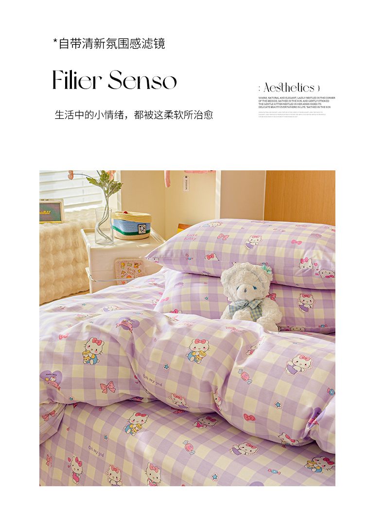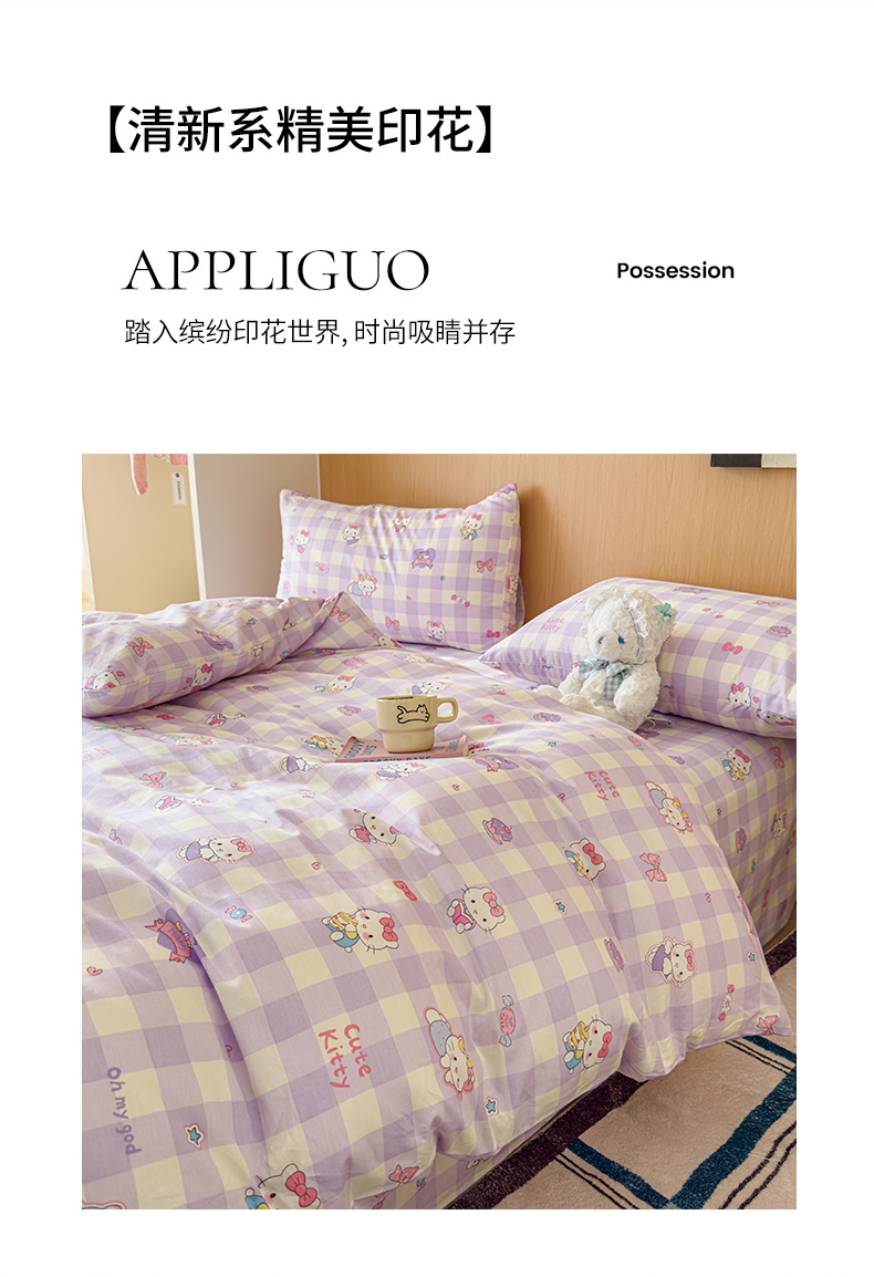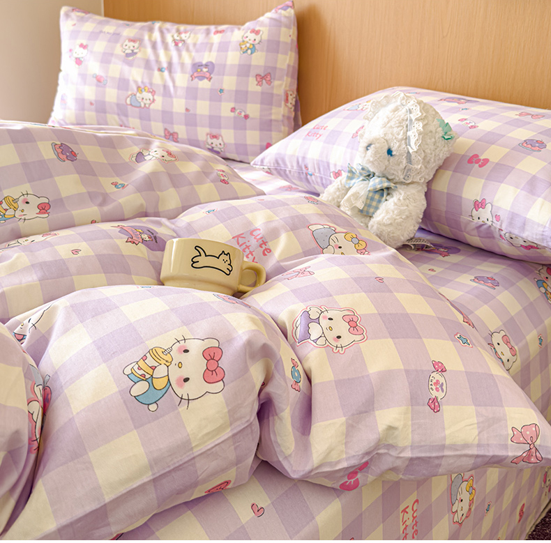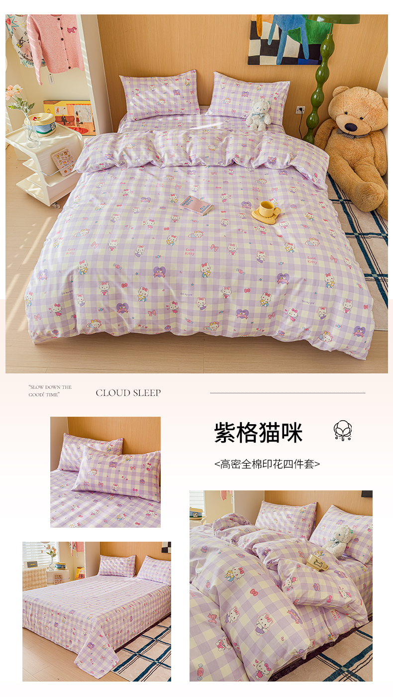 感遇全棉软萌清新四件套 紫格猫咪