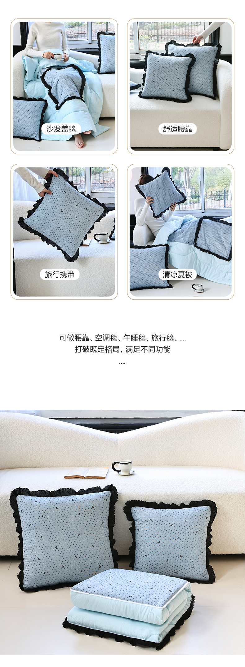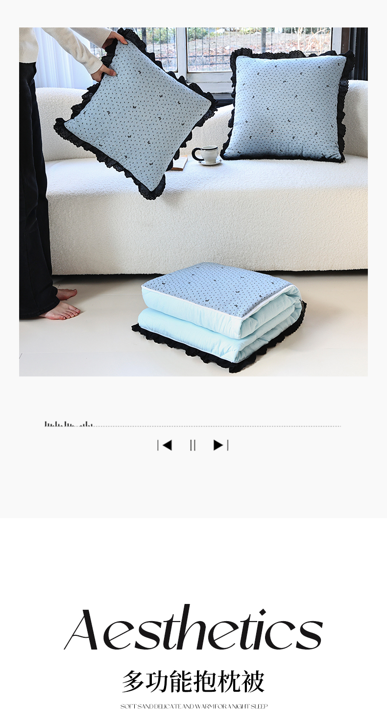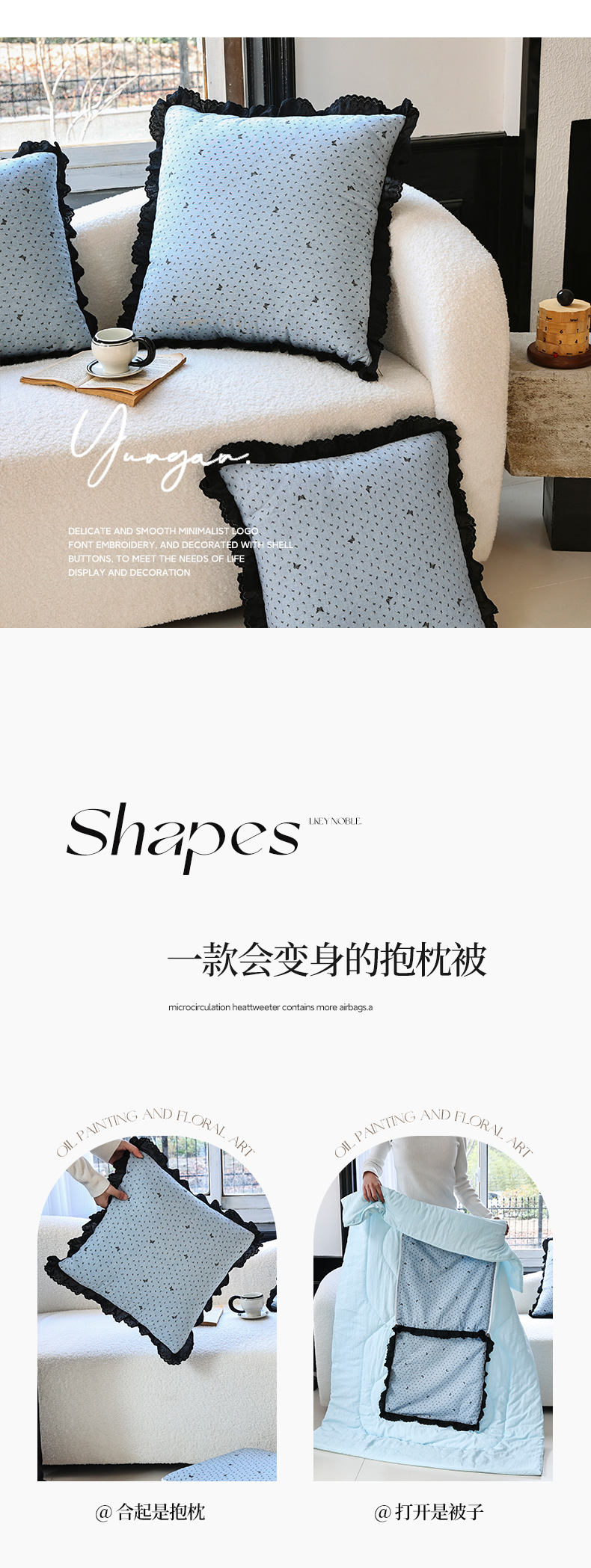 番茄+ 2025新款法式全棉黑花边抱枕被系列 蝶梦蓝