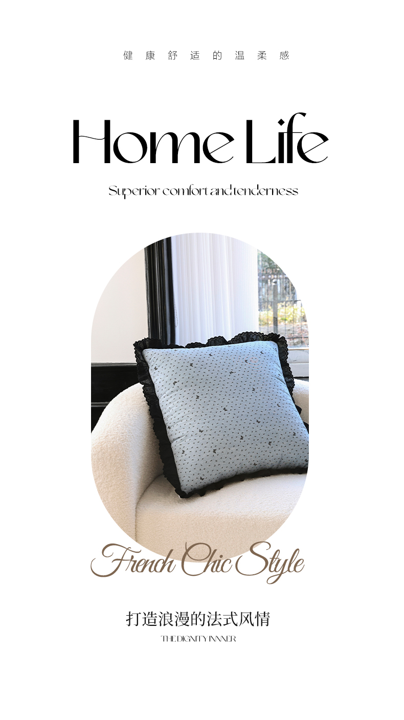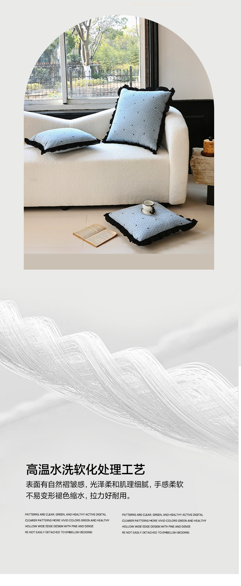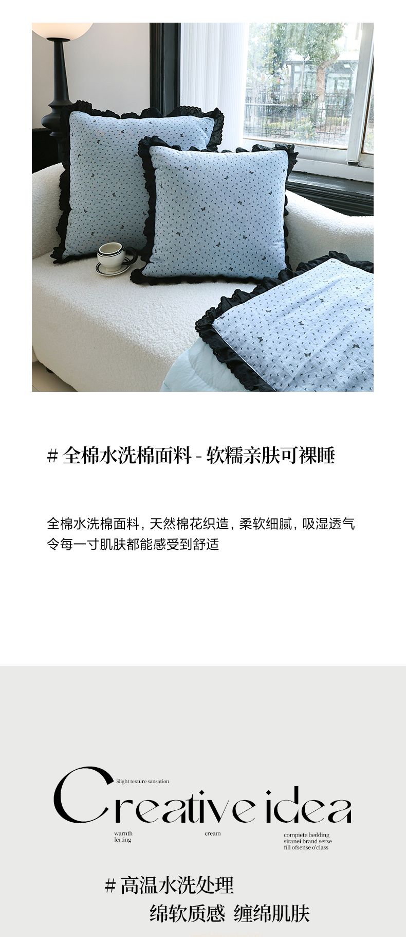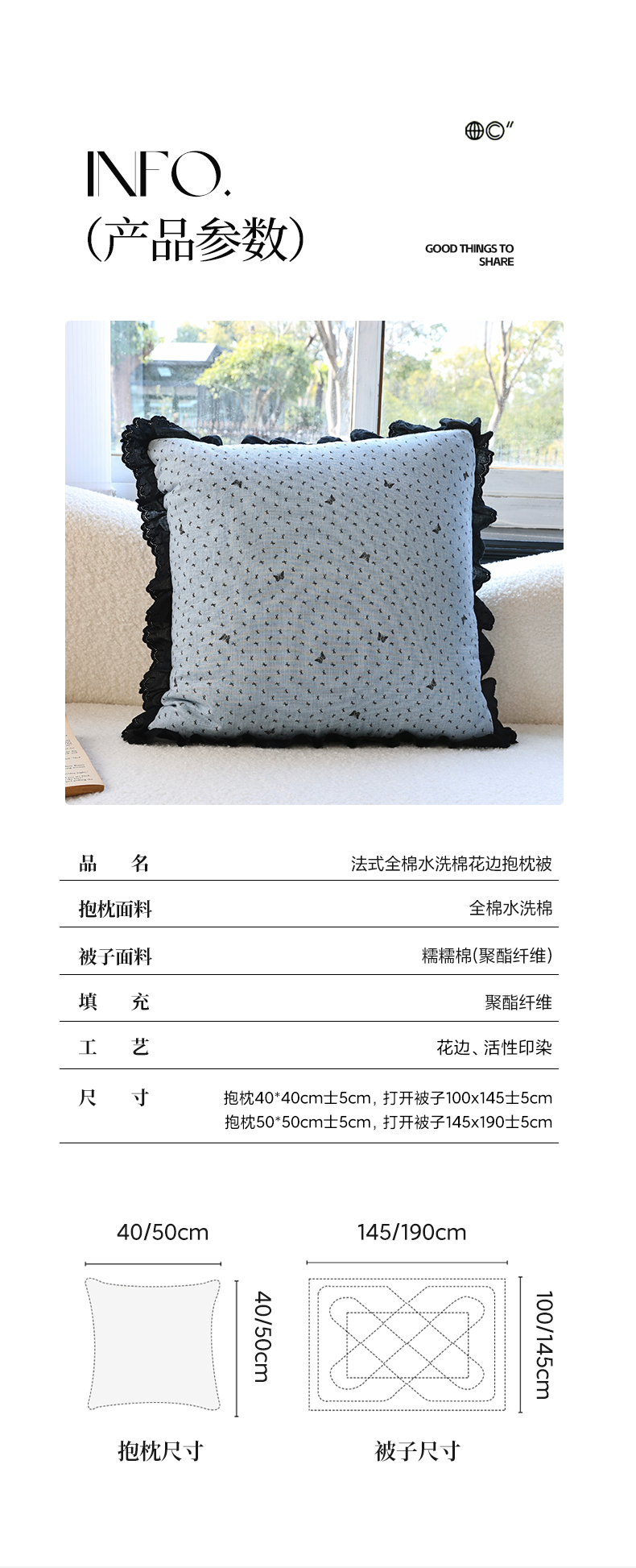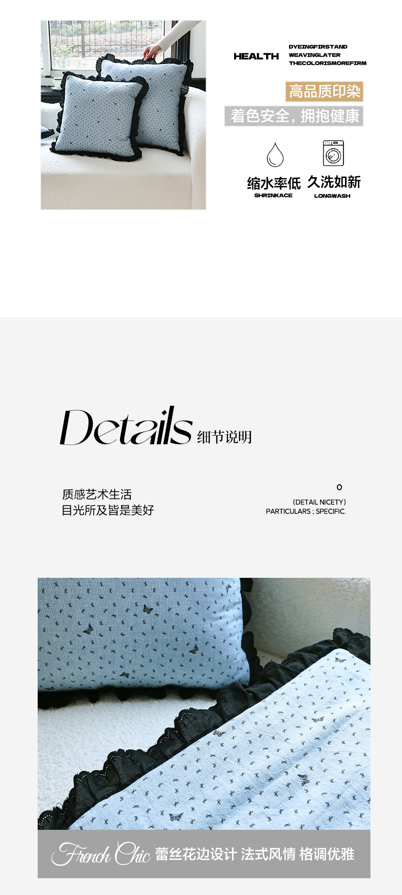 商品名称:番茄+ 2025新款法式全棉黑花边抱枕被系列 蝶梦蓝