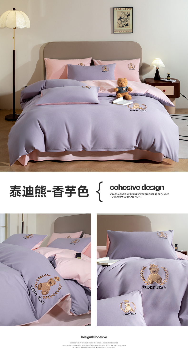 澳梵家居2025新款A类全棉水洗棉刺绣四件套-泰迪小熊 泰迪熊-香芋色