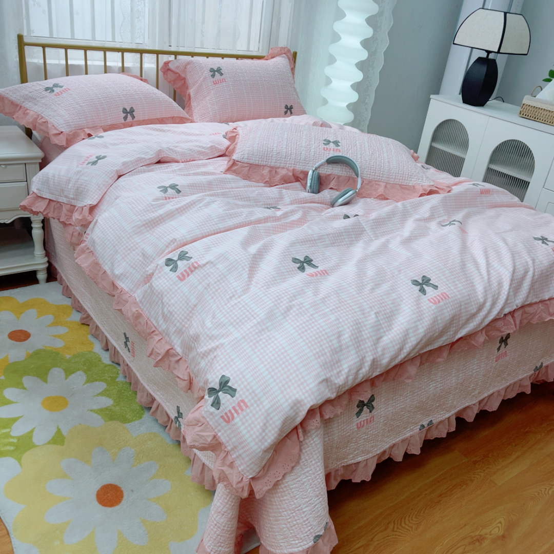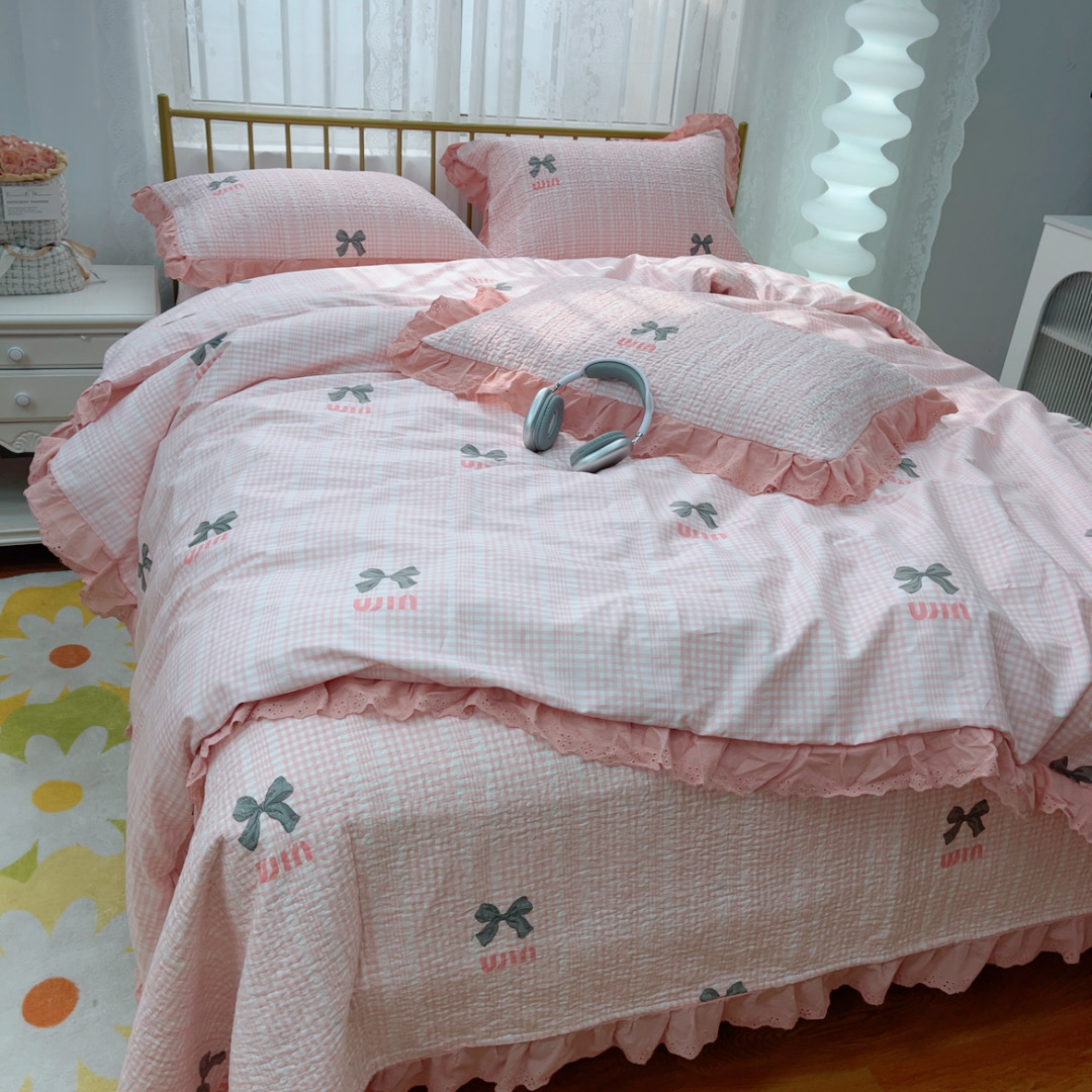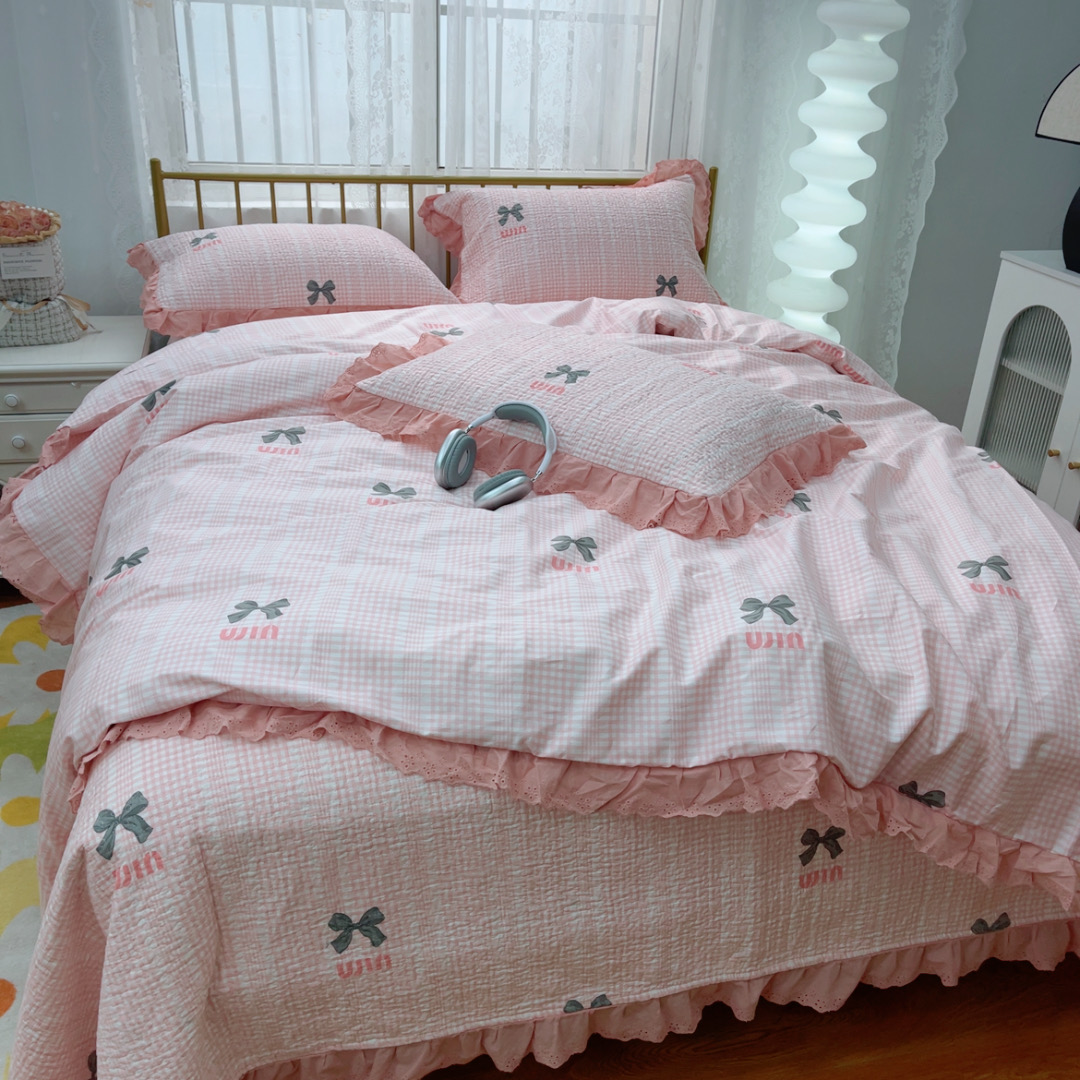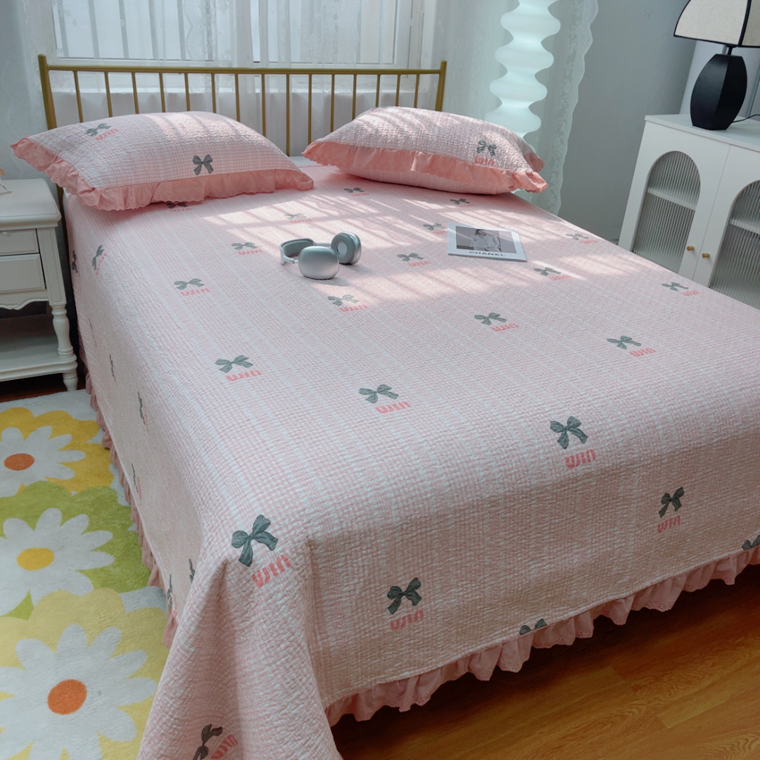 商品名称:暖居 2025春夏款高温砂洗棉花床盖三件套被套四件套同款纯棉夏被空调被四季 蝴蝶结粉色