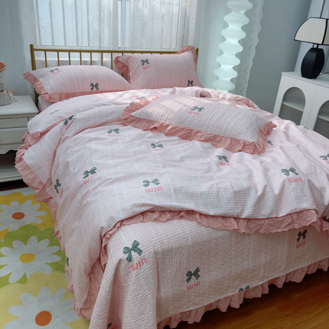 暖居 2025春夏款高温砂洗棉花床盖三件套被套四件套同款纯棉夏被空调被四季 蝴蝶结粉色