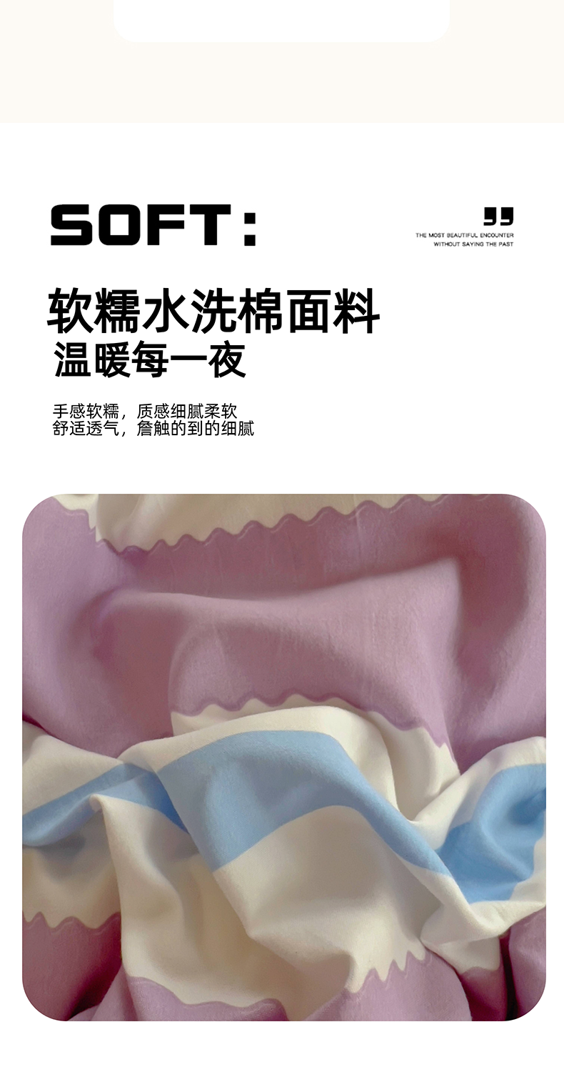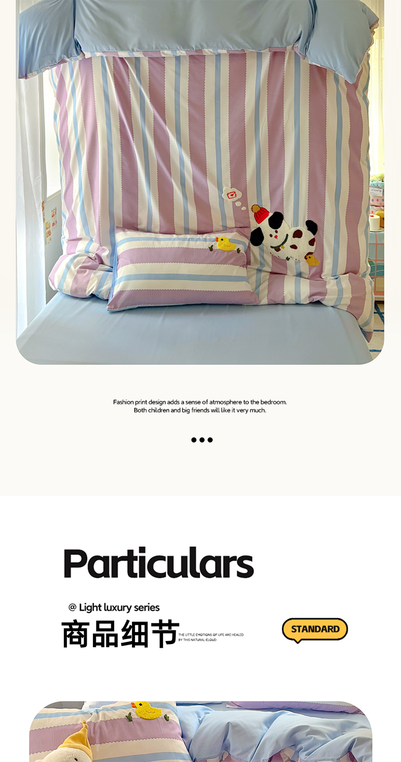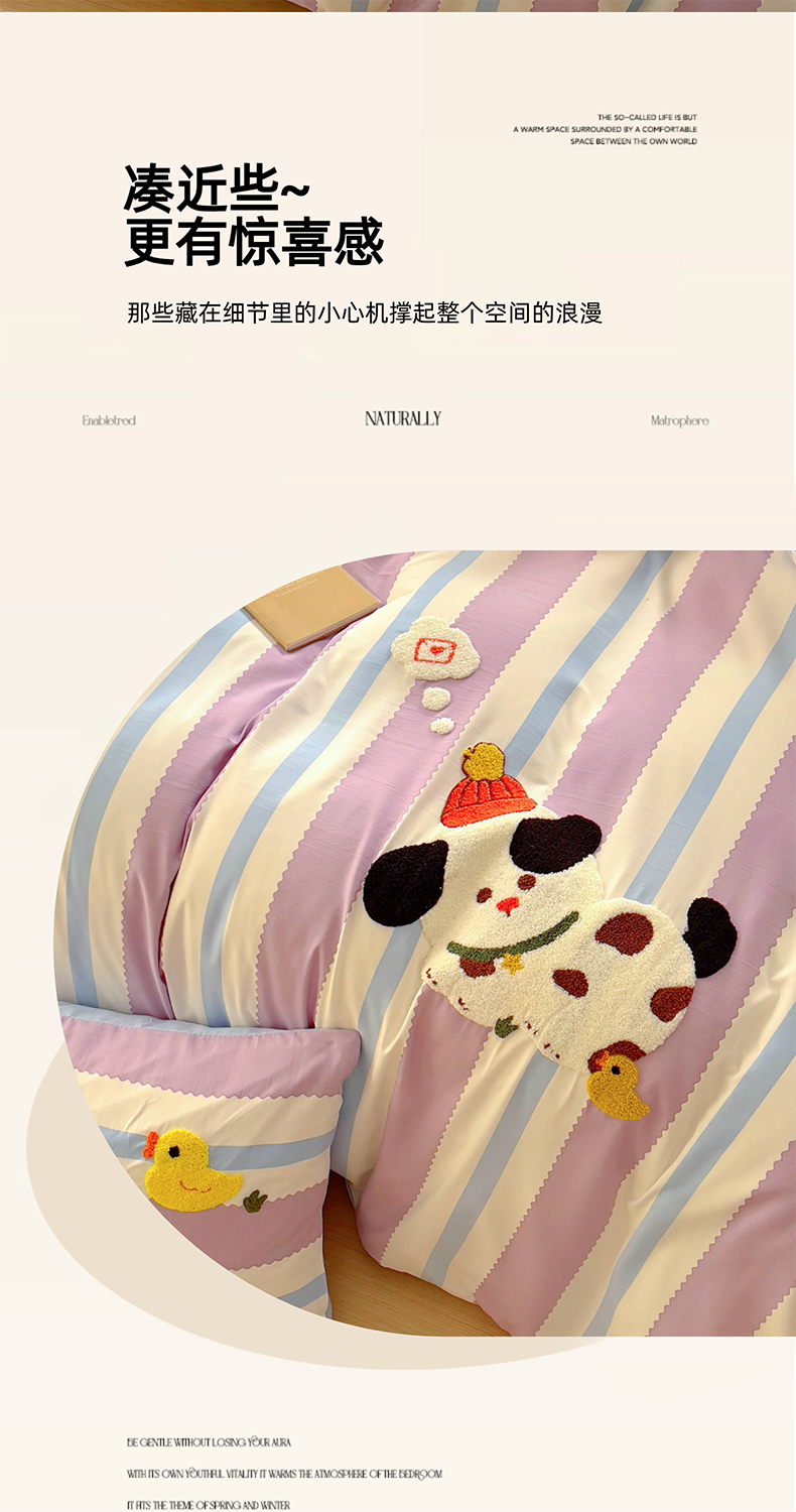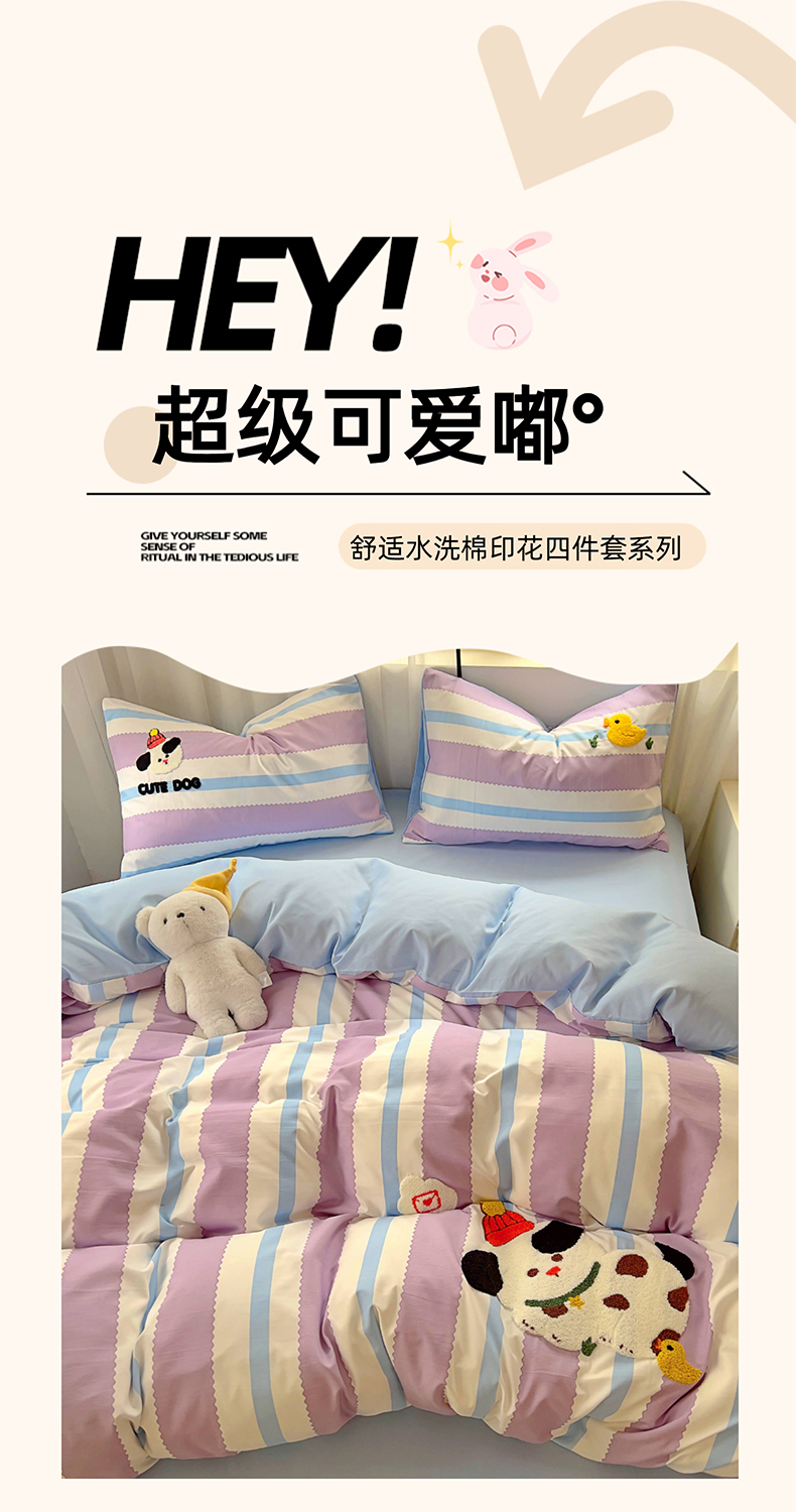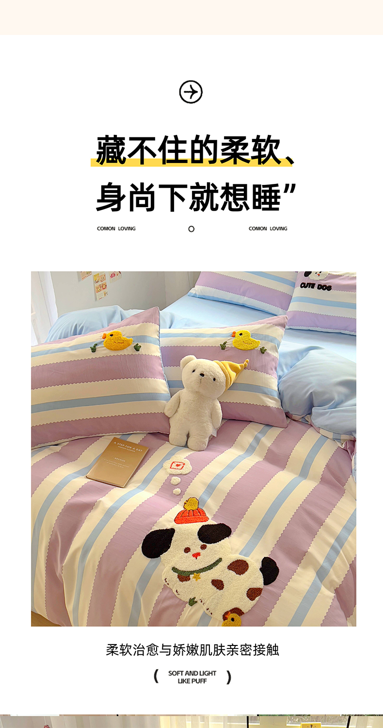 当前位置: 91家纺网 > 商品网购 > 床品套件 > 四件套 > 春光里 2025新款舒适水洗棉印花毛巾绣四件套 帽子狗(紫条)