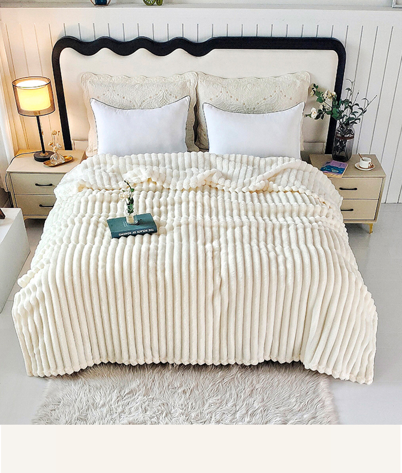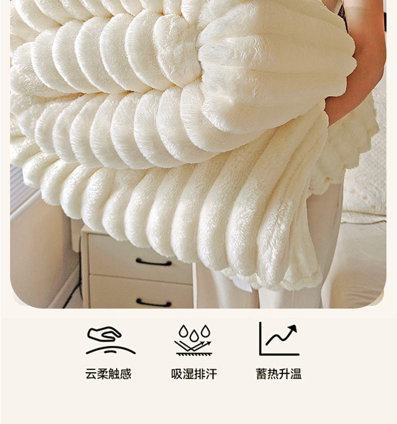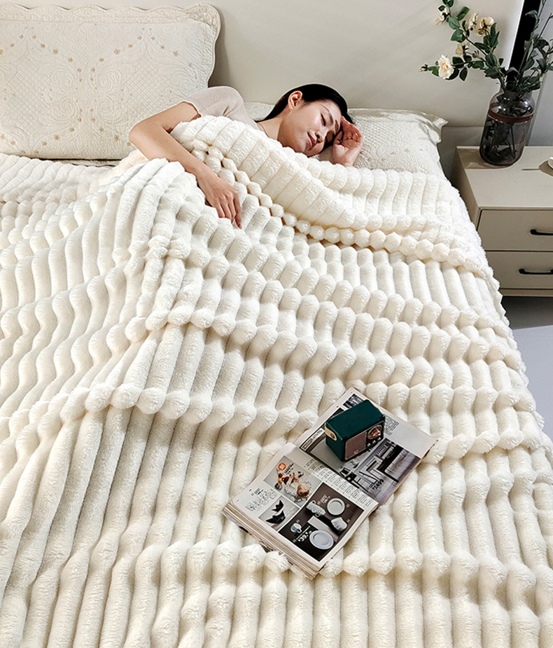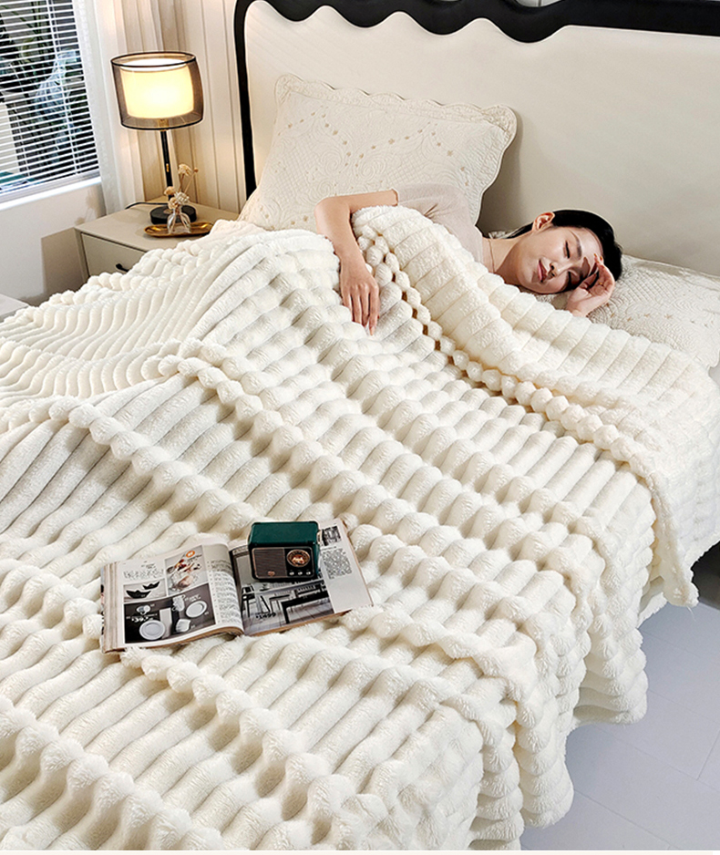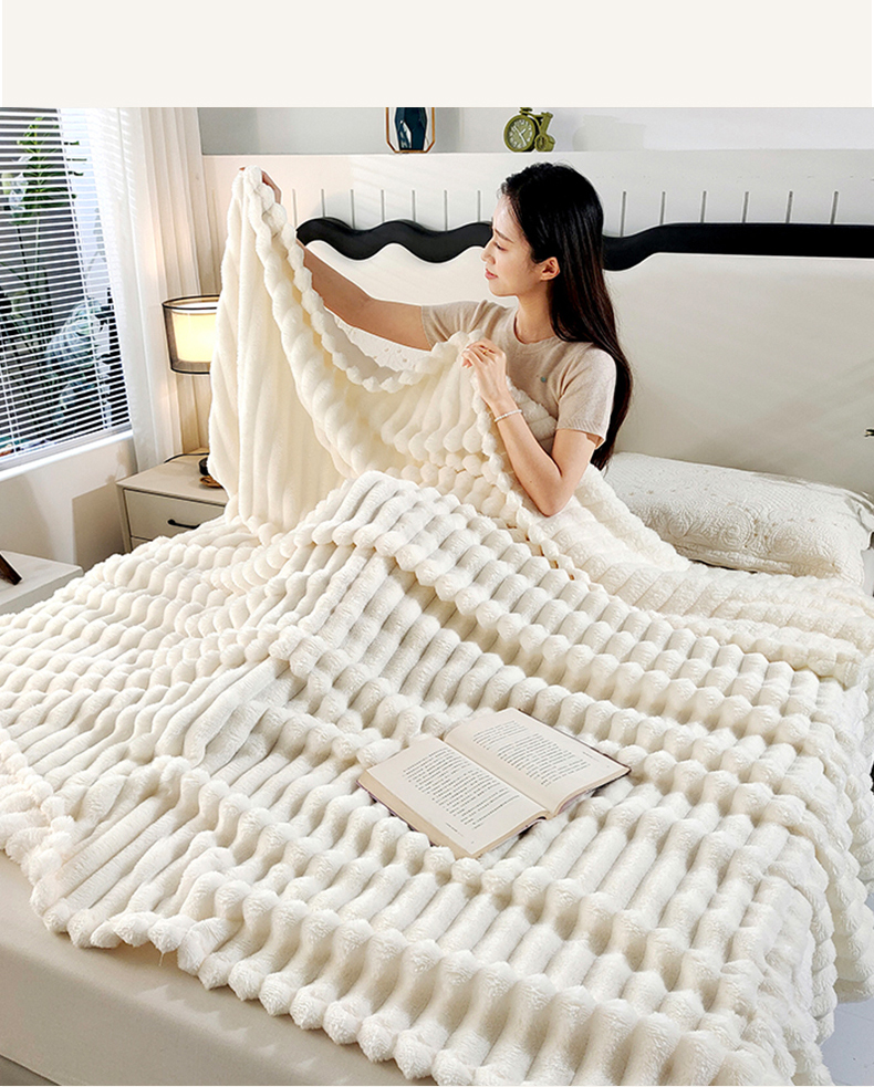 商品名称:美洲琳 2025新款仿兔毛大泡泡宽抽条毛毯毯子 白色