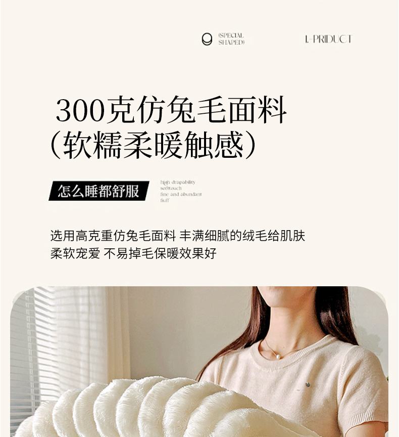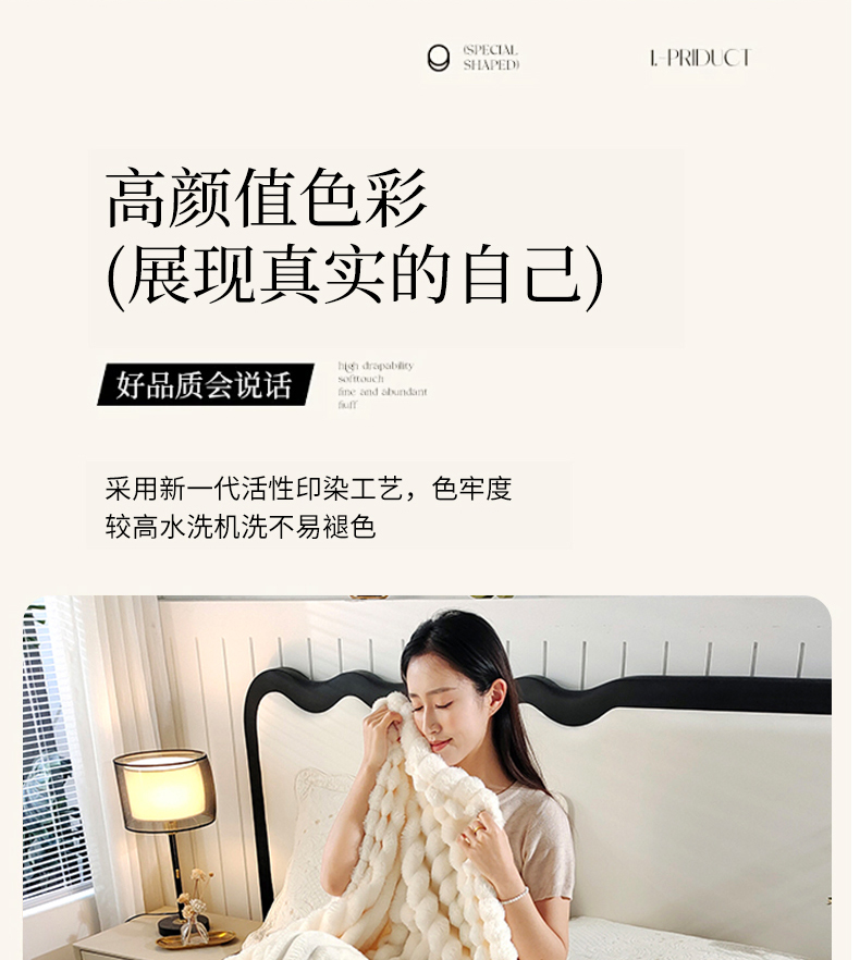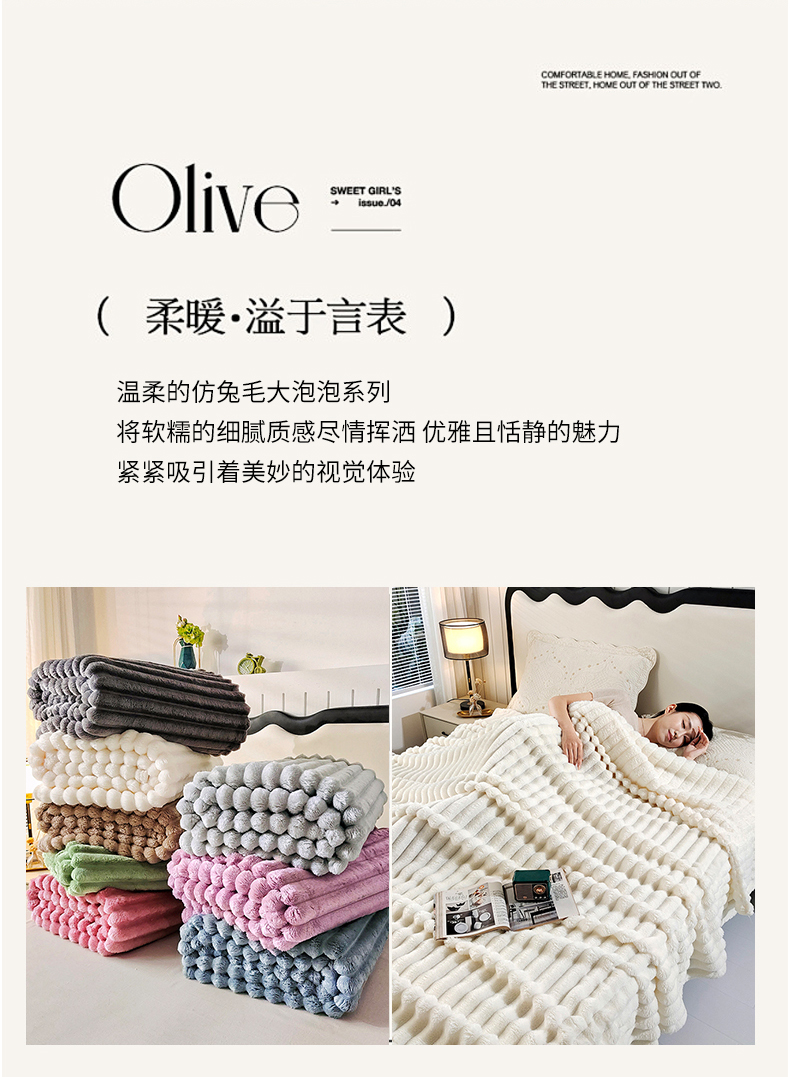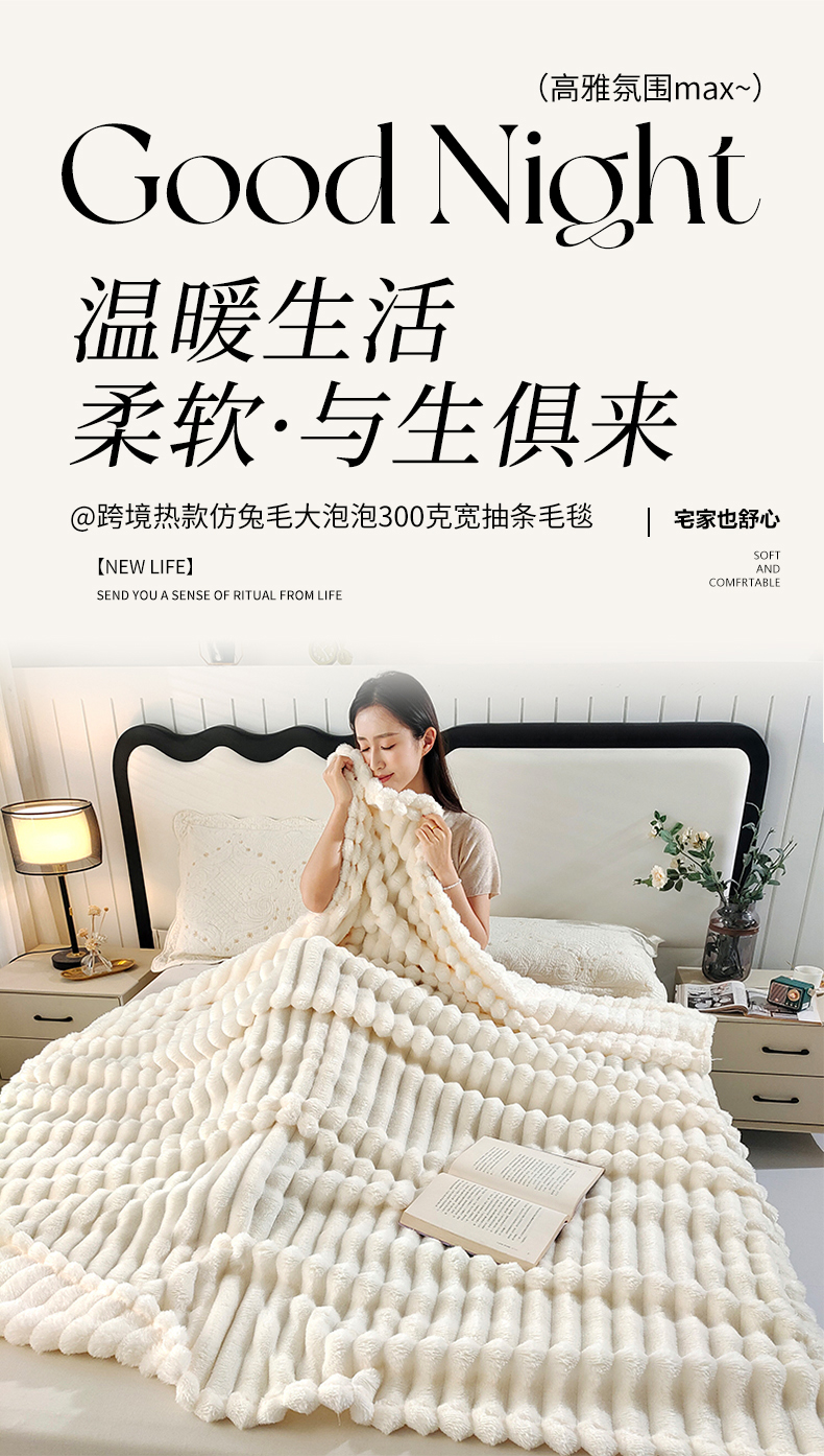 商品名称:美洲琳 2025新款仿兔毛大泡泡宽抽条毛毯毯子 白色