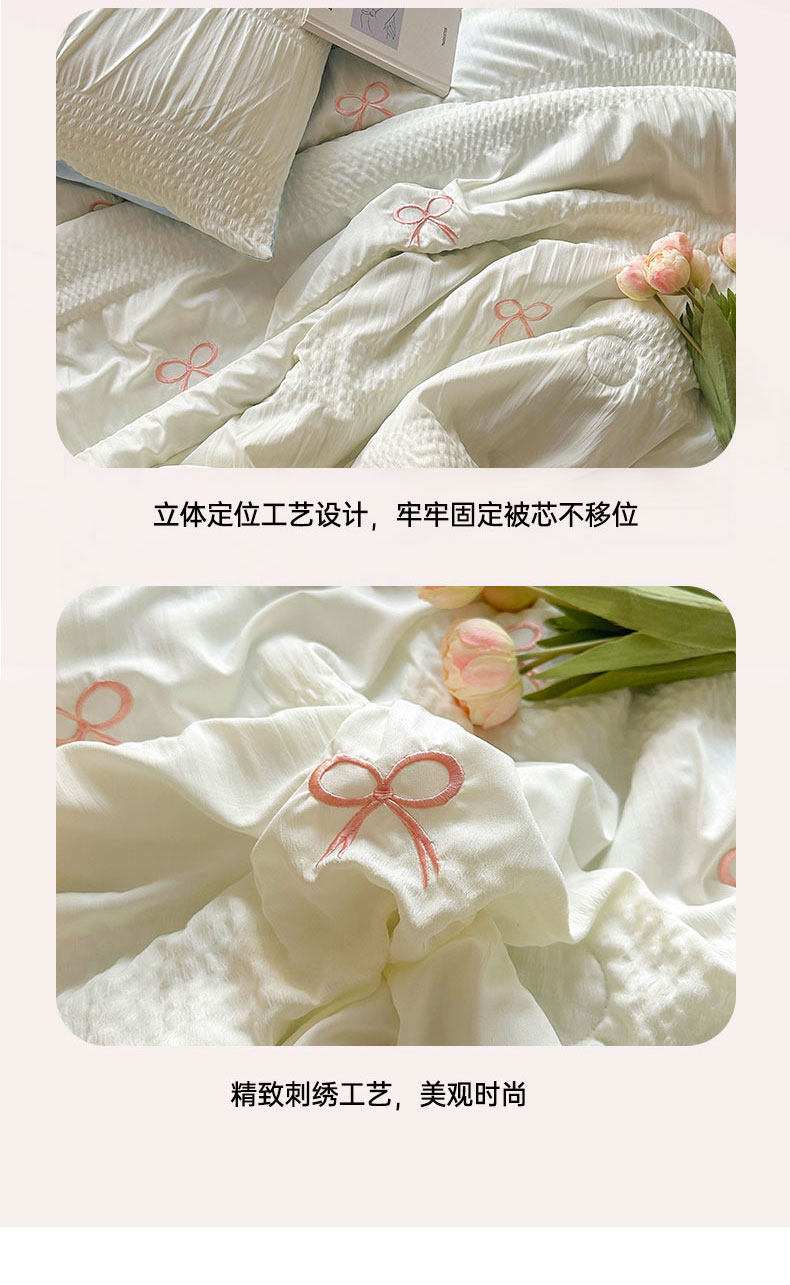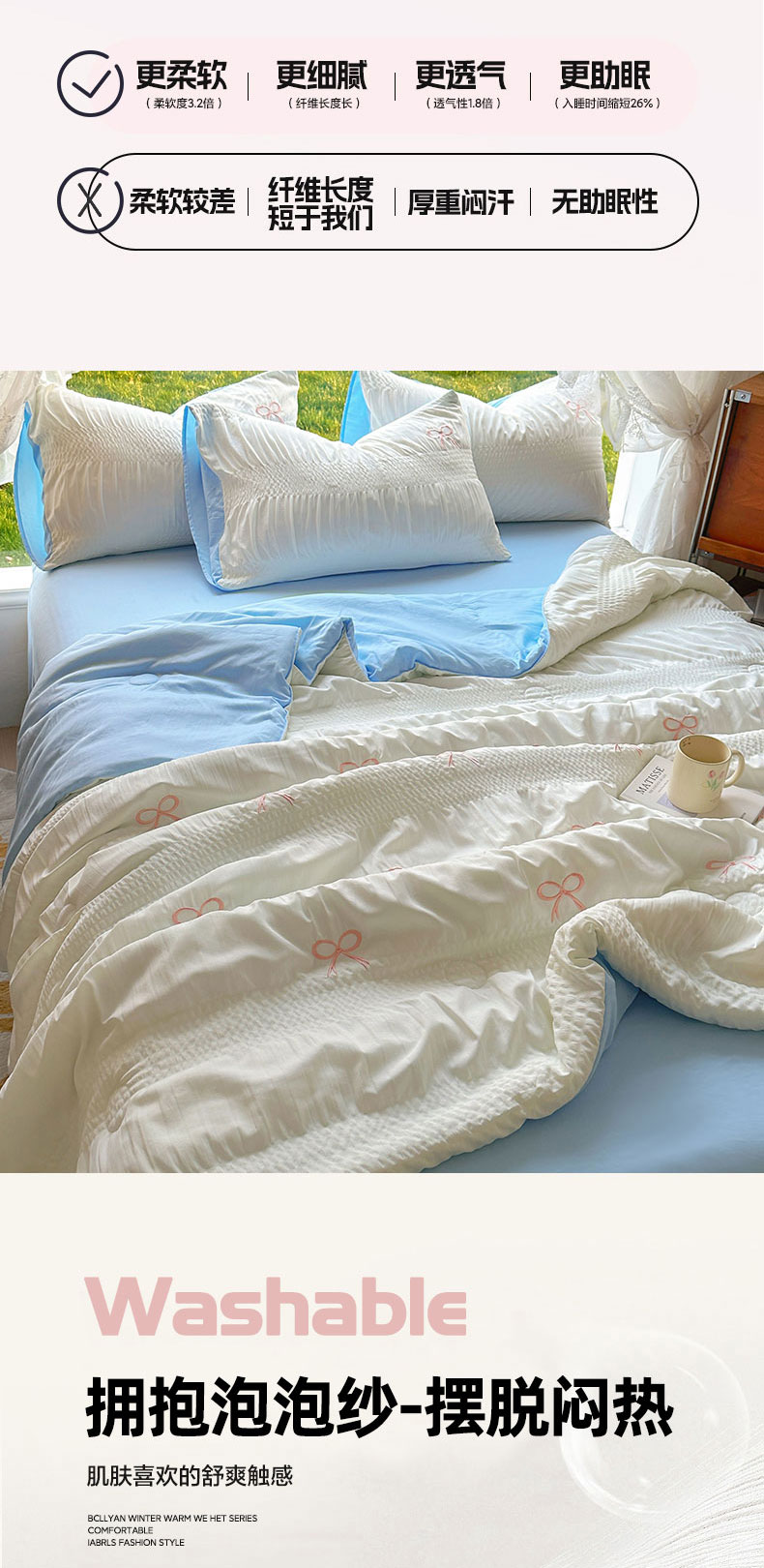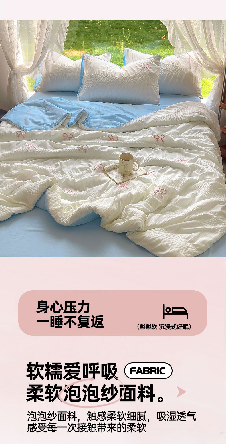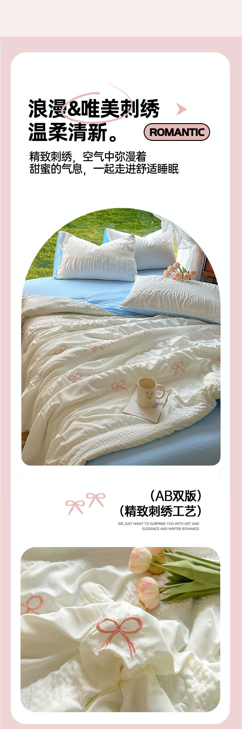 当前位置: 91家纺网 > 商品网购 > 床品套件 > 四件套 > 全棉普通四件套 > 灰鲸 2025新款泡泡纱郁金香,蝴蝶结满绣系列夏被四件套 蝴蝶结-奶昔白+天空蓝