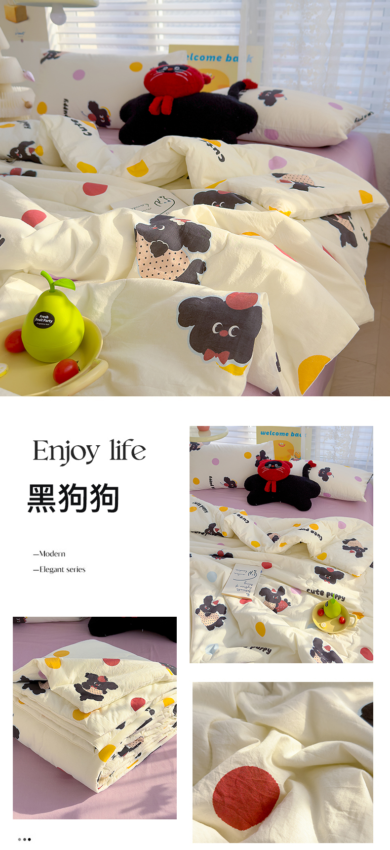 当前位置: 91家纺网 > 商品网购 > 床品套件 > 四件套 > 夏被四件套 > 颜选 2025新款印花棉柔水洗棉夏被四件套 黑狗狗