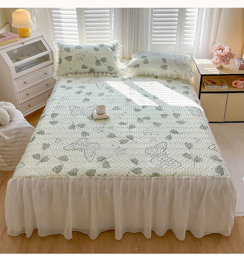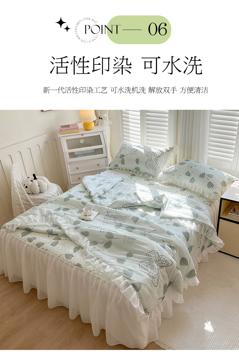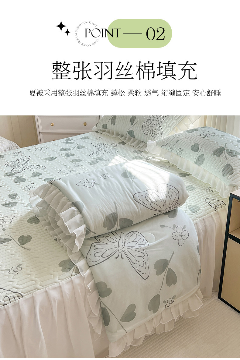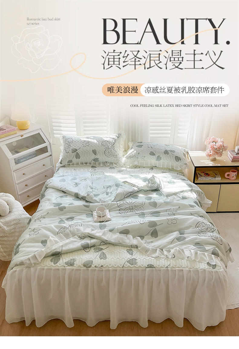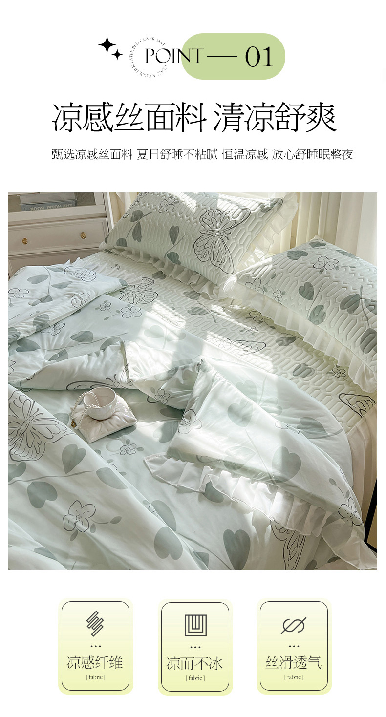 • 91家纺网 家纺一手货源 找家纺 慕澄2025新款小版印花床裙款乳胶凉席凉感丝夏被四件套 绿色蝶