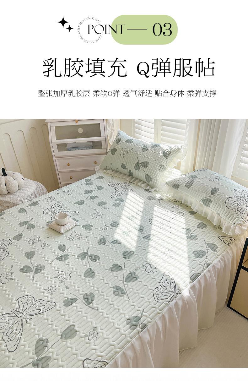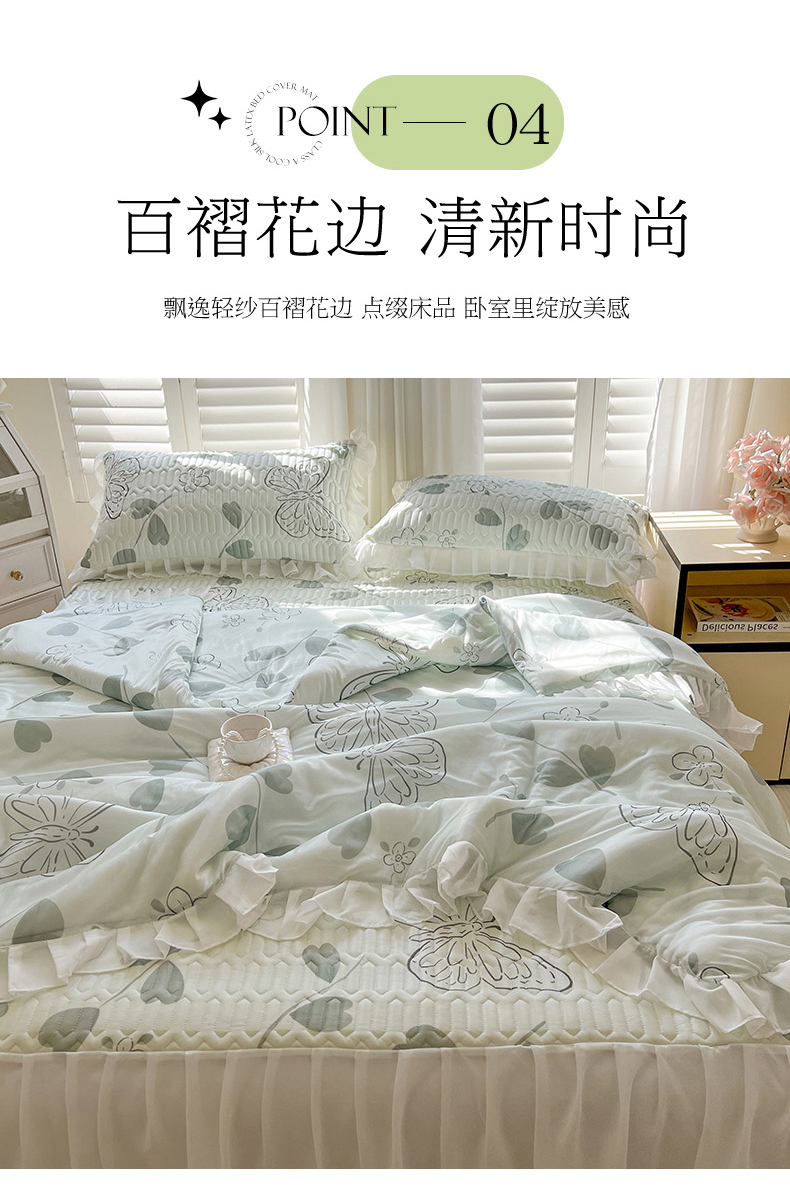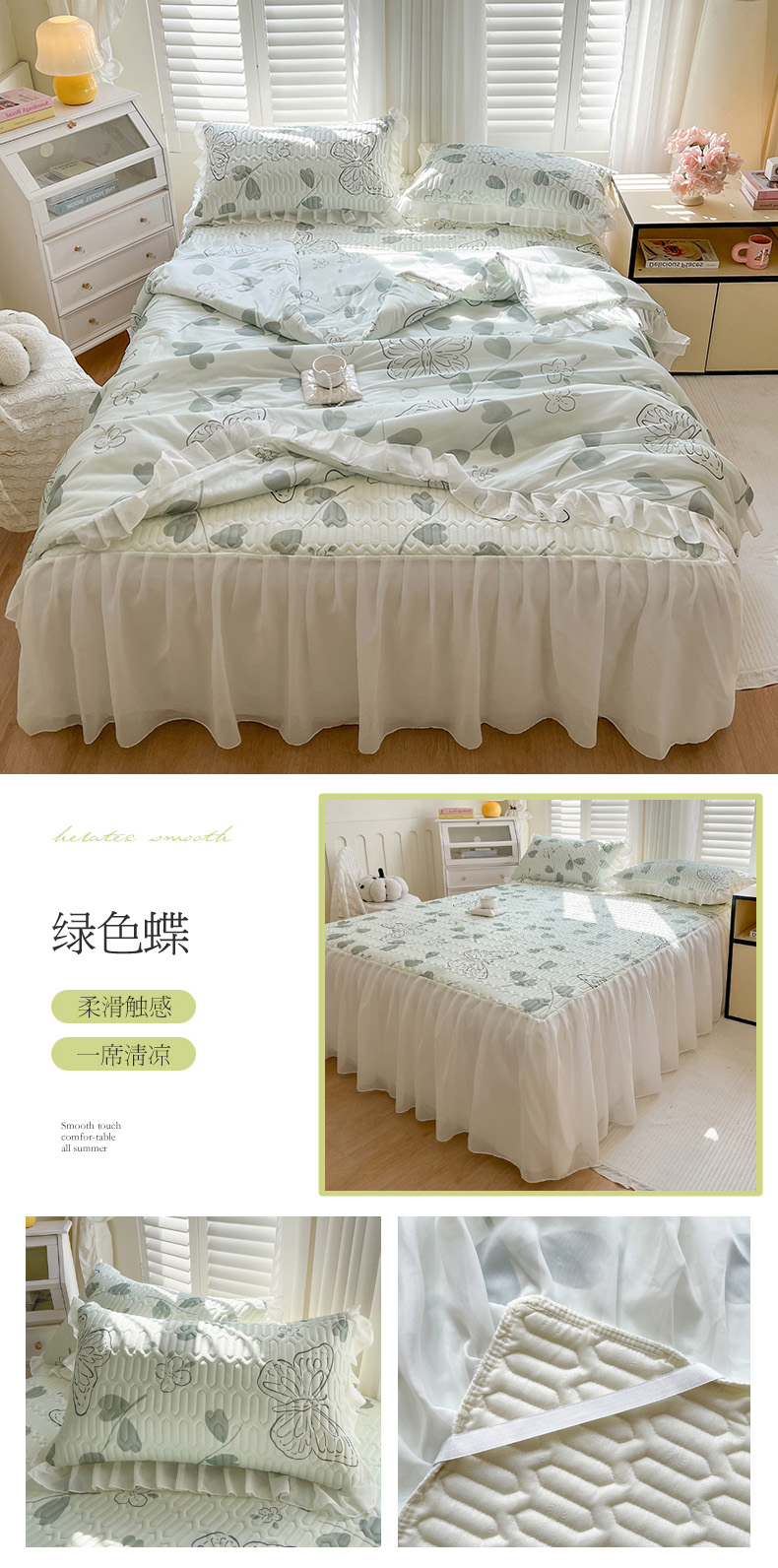 慕澄2025新款小版印花床裙款乳胶凉席凉感丝夏被四件套 绿色蝶