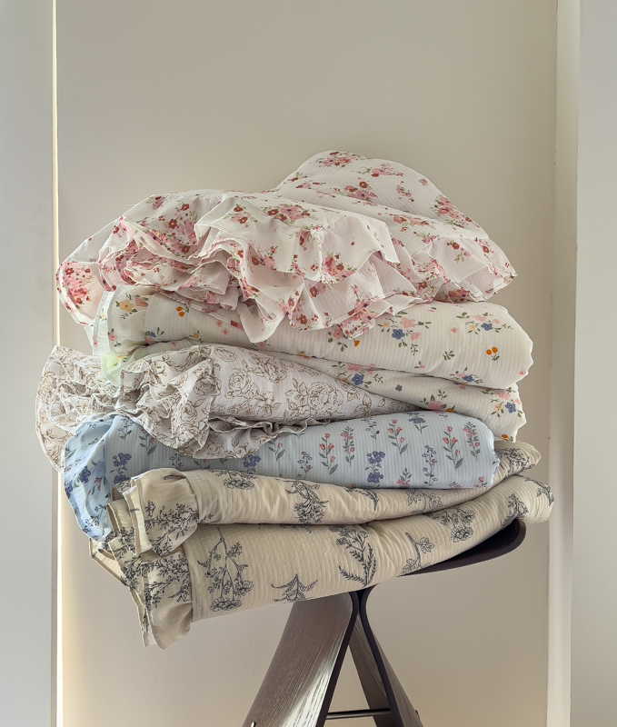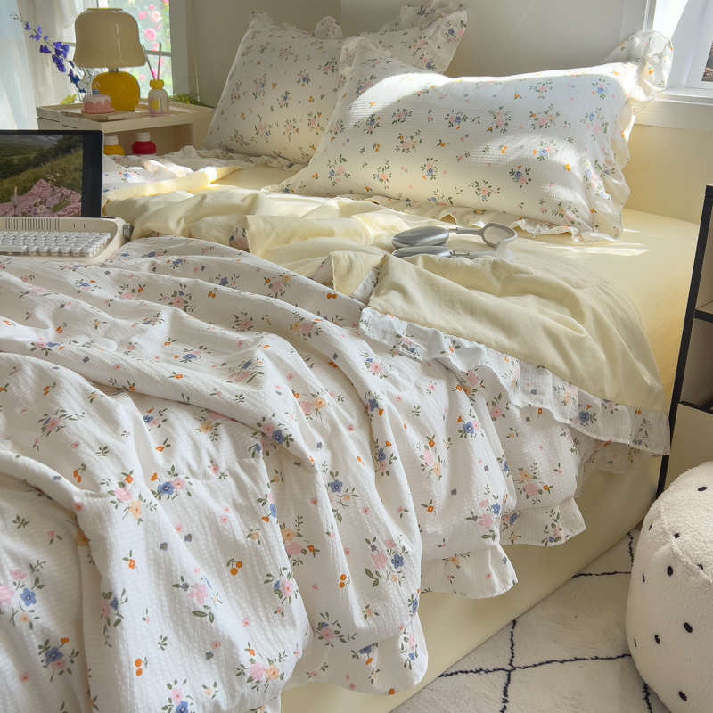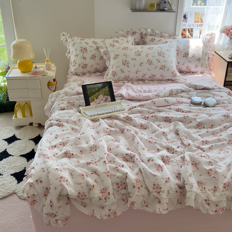 (总)希丞家居 2025新款花卉泡泡纱花边四件套,春野,繁花,花青,梦语,棉枝,蔷薇,夏瑾,紫韵