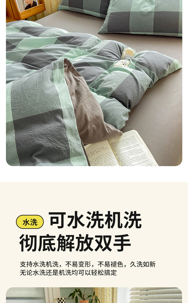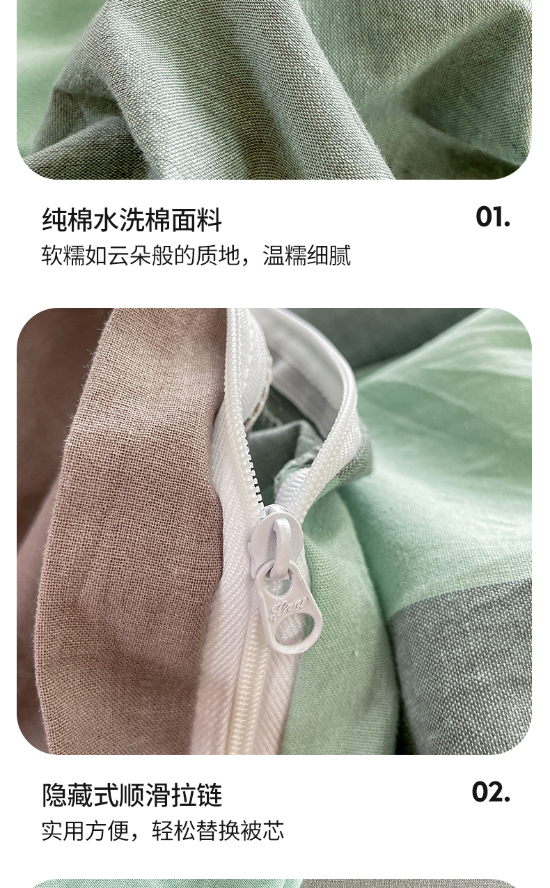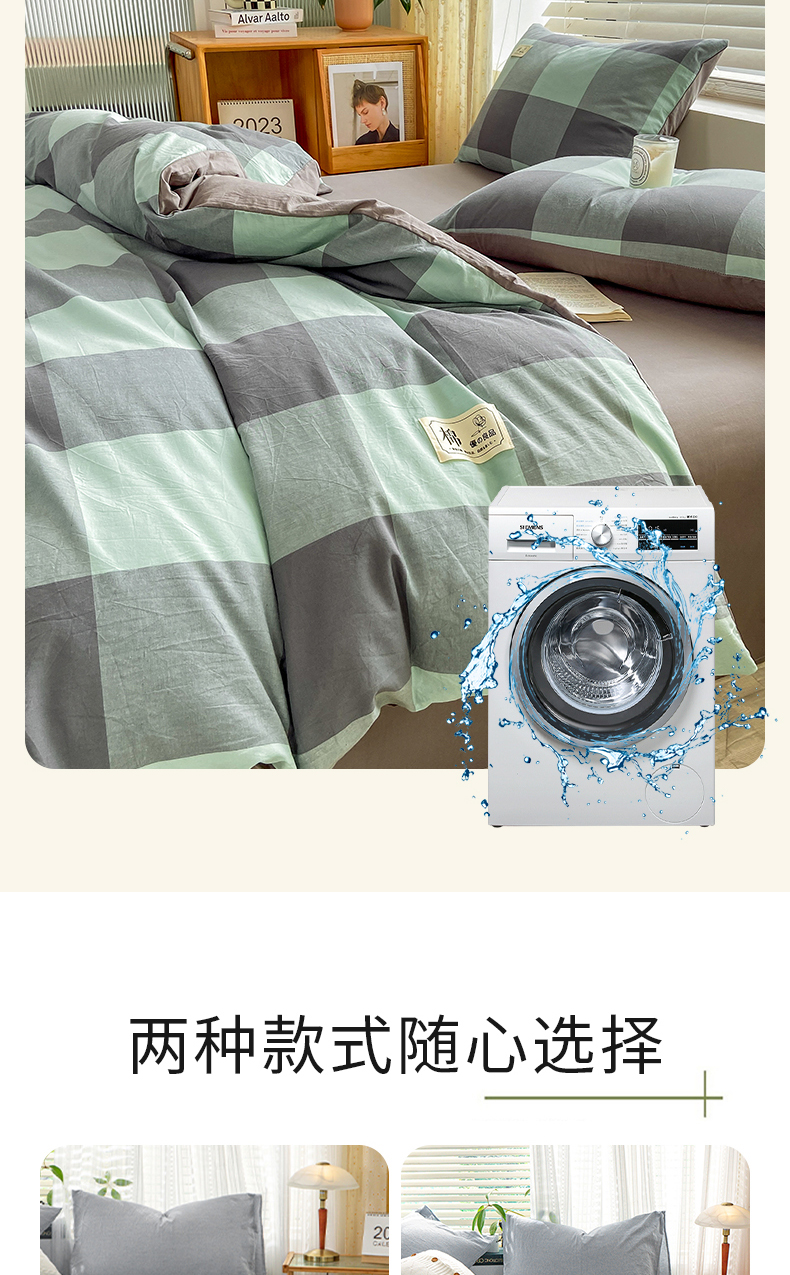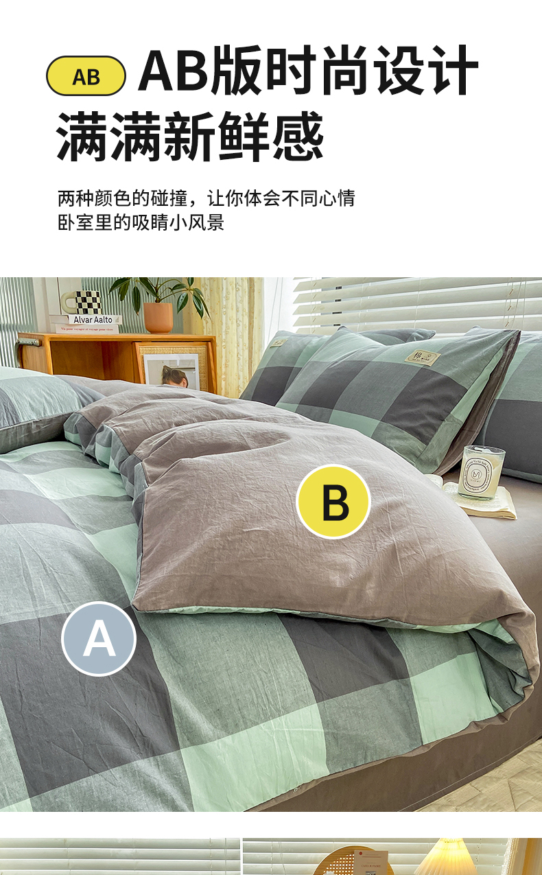 恋人优选 2025新款A类全棉纯棉水洗棉系列(AB版)单被套 被套单件 绿灰大格(AB版)