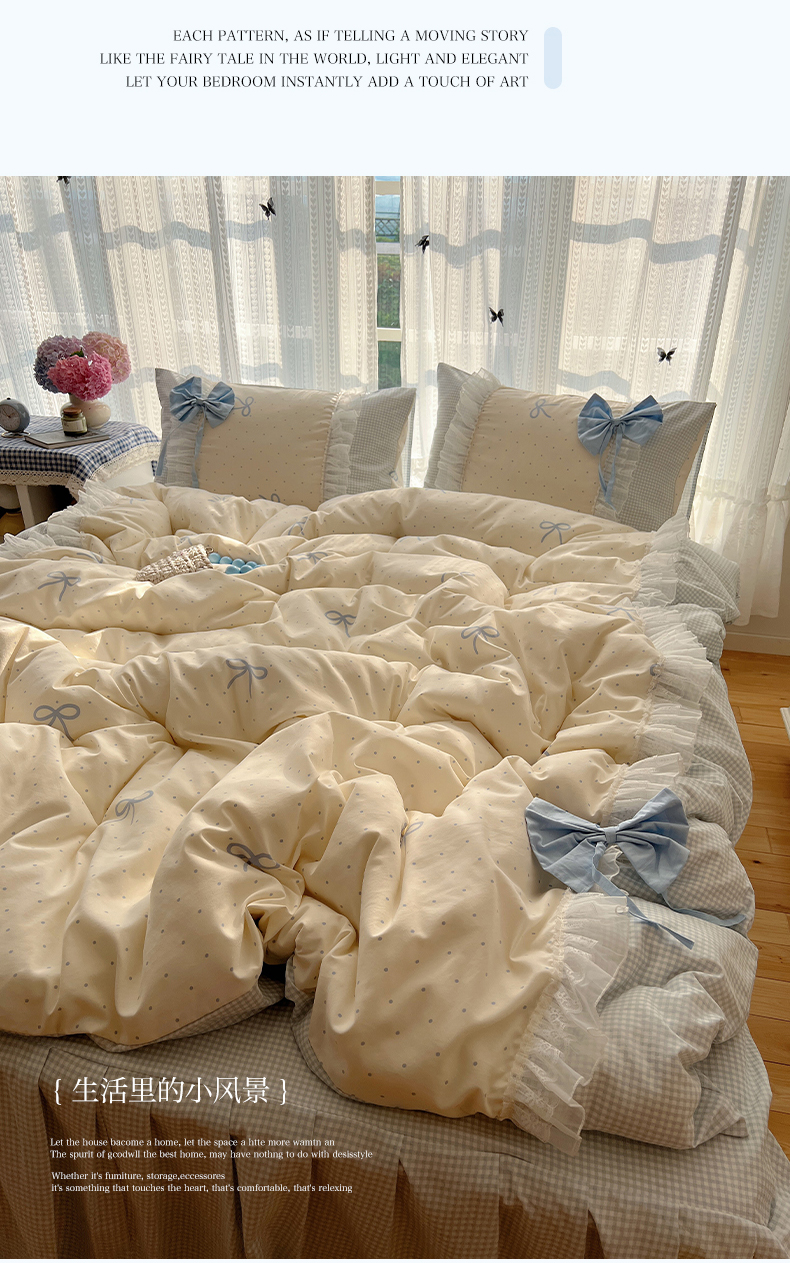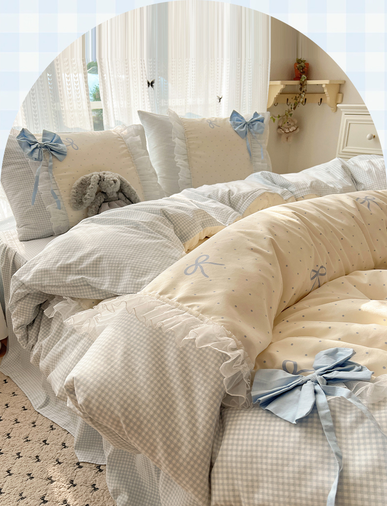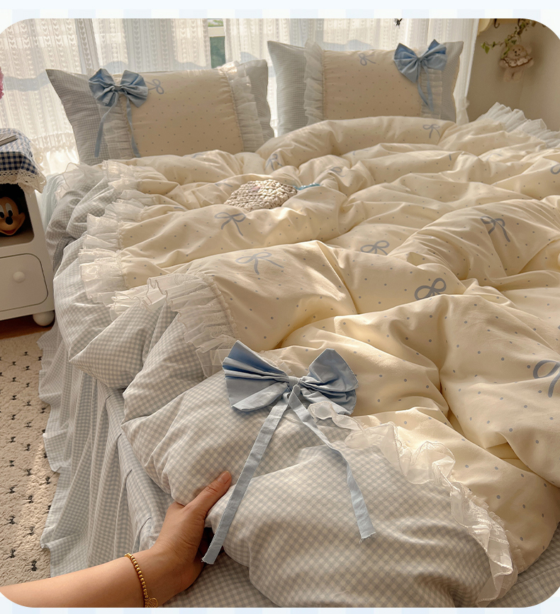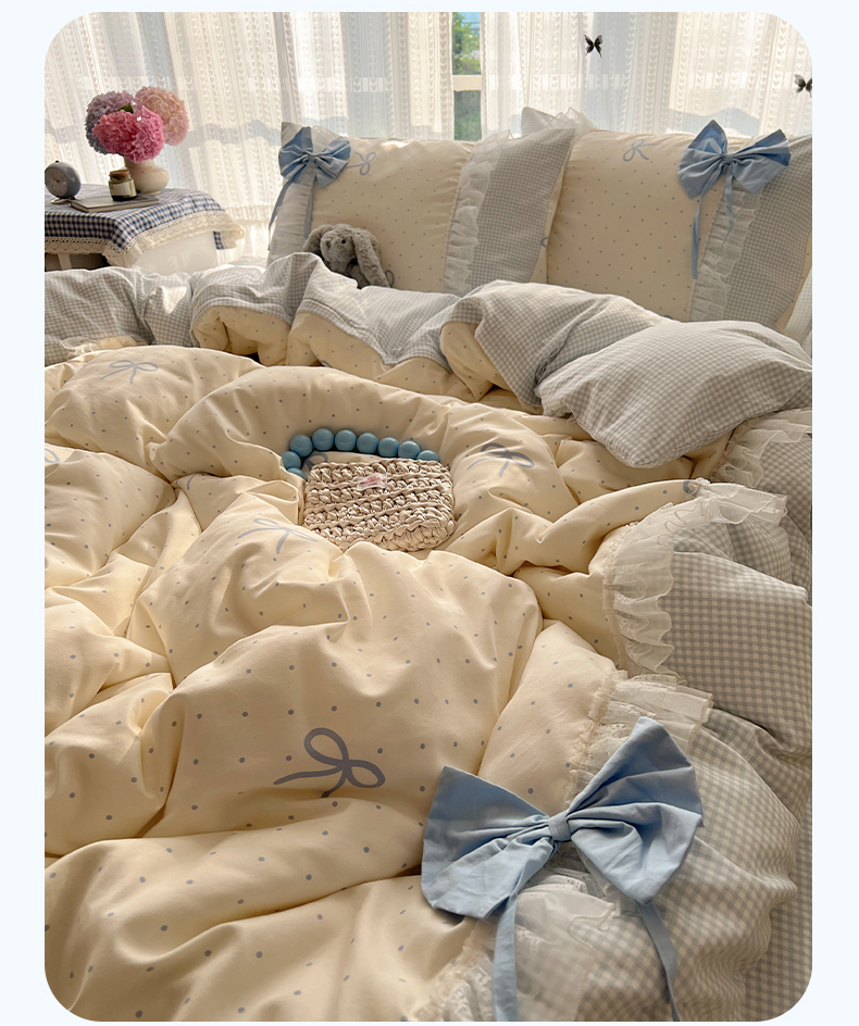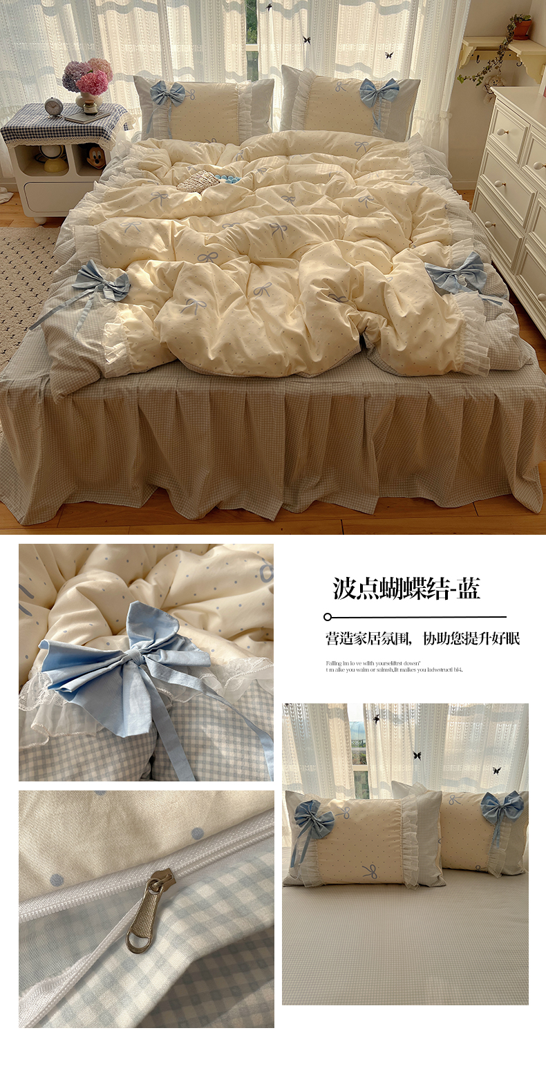 当前位置: 91家纺网 > 商品网购 > 床品套件 > 四件套 > 水洗棉四件套 > 瑞莱 2025新款水洗棉拼接工艺花边款四件套-波点蝴蝶结 波点蝴蝶结-蓝