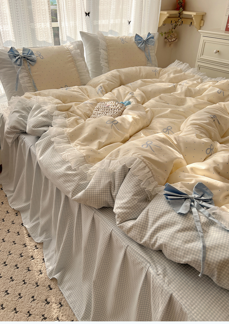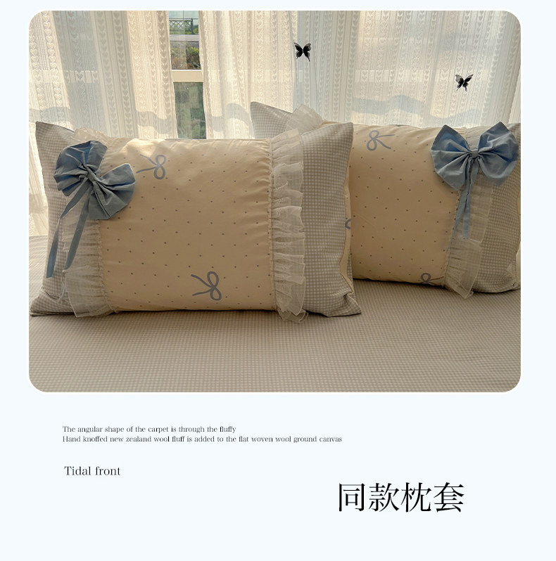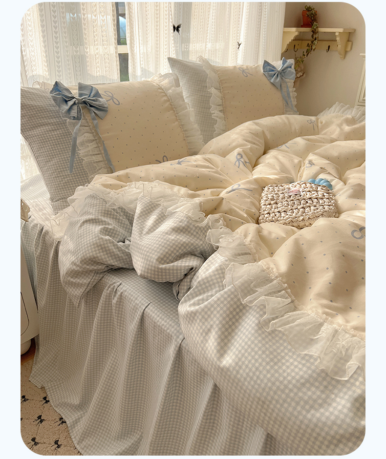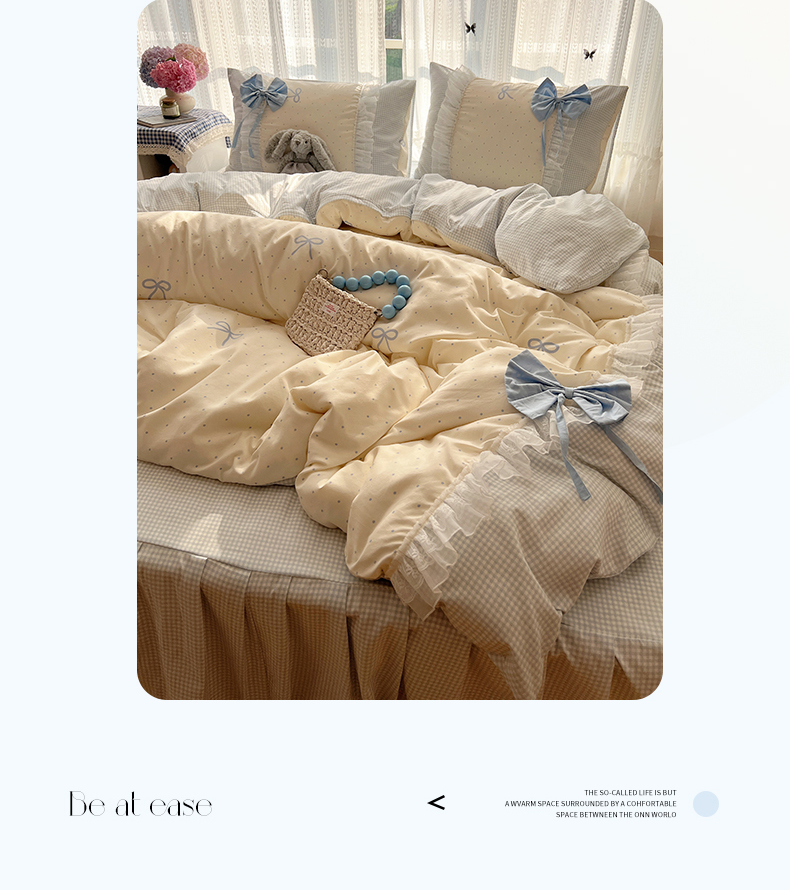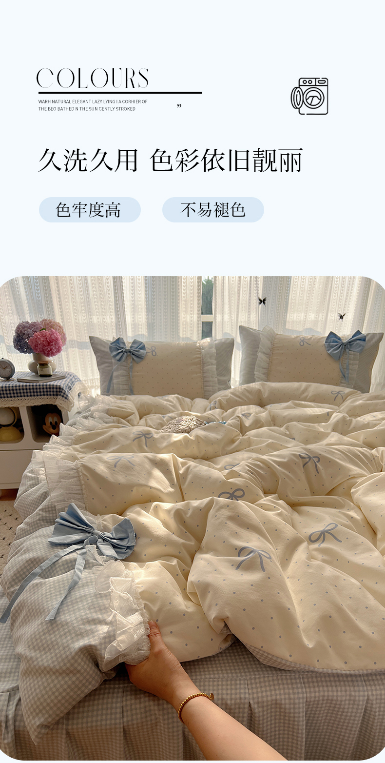 当前位置: 91家纺网 > 商品网购 > 床品套件 > 四件套 > 水洗棉四件套 > 瑞莱 2025新款水洗棉拼接工艺花边款四件套-波点蝴蝶结 波点蝴蝶结-蓝