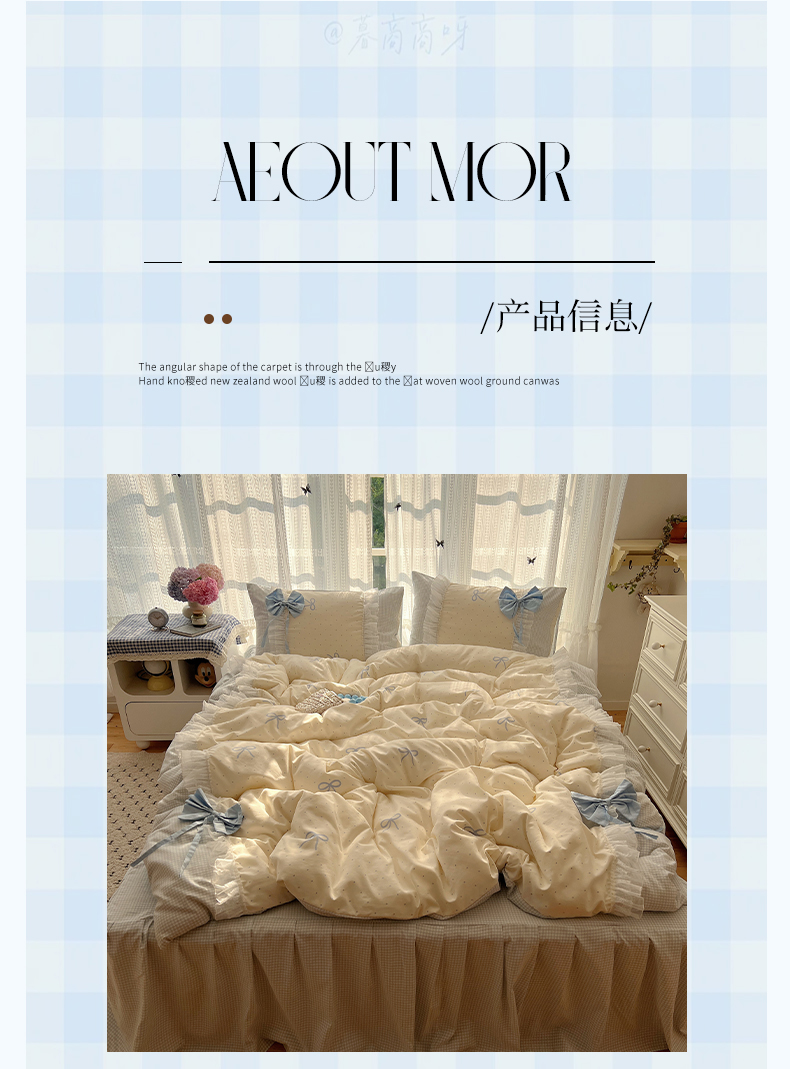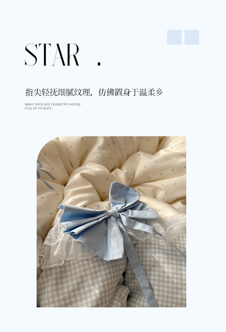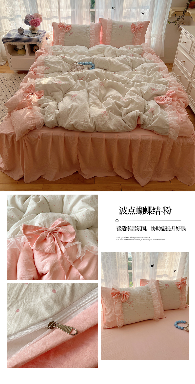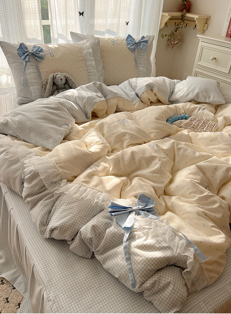 当前位置: 91家纺网 > 商品网购 > 床品套件 > 四件套 > 水洗棉四件套 > 瑞莱 2025新款水洗棉拼接工艺花边款四件套-波点蝴蝶结 波点蝴蝶结-蓝
