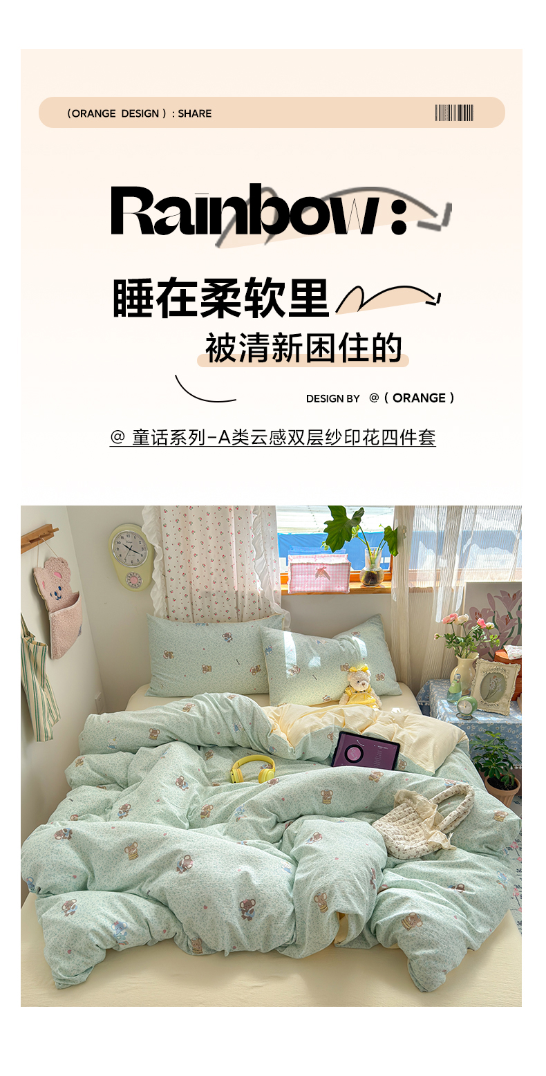 当前位置: 91家纺网 > 商品网购 > 床品套件 > 四件套 > 双层纱四件套 > 罗亿家纺 2025新款云感双层纱印花四件套 童话-少女象
