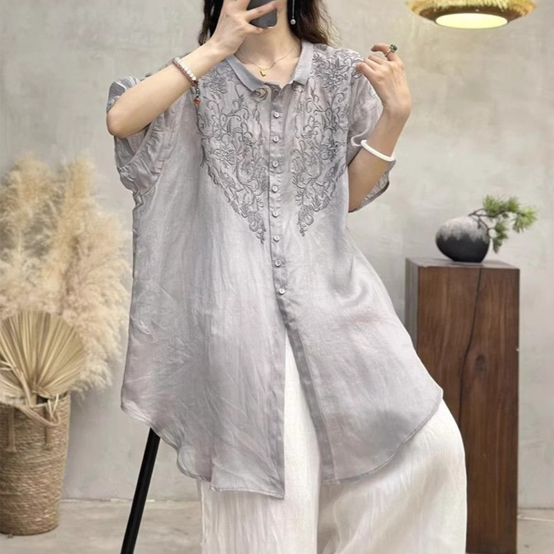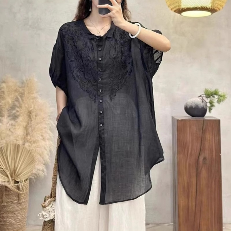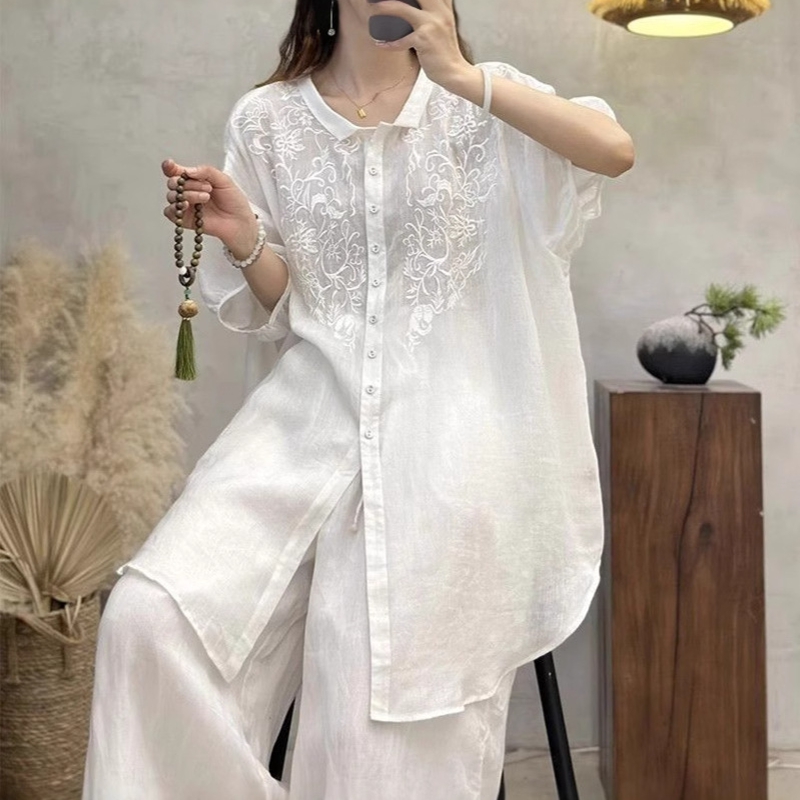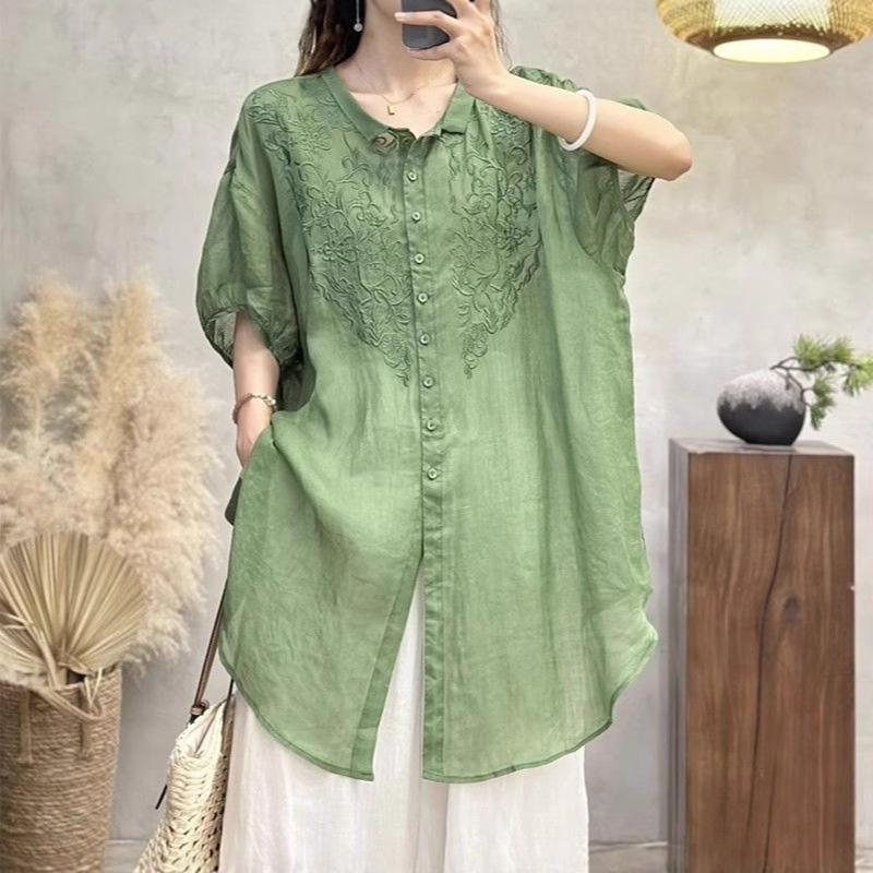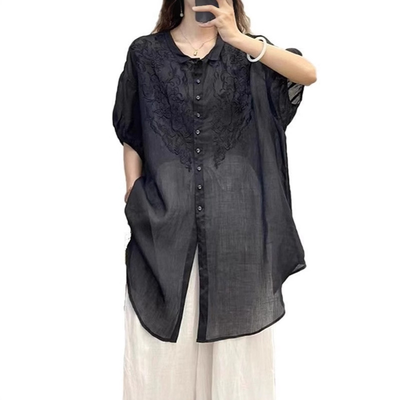 商品名称:(总)洛兰沙家居馆【只代发】【只代发】 2025新款刺绣棉麻短袖衬衫女2025夏季中长款宽松显瘦休闲薄款上衣女