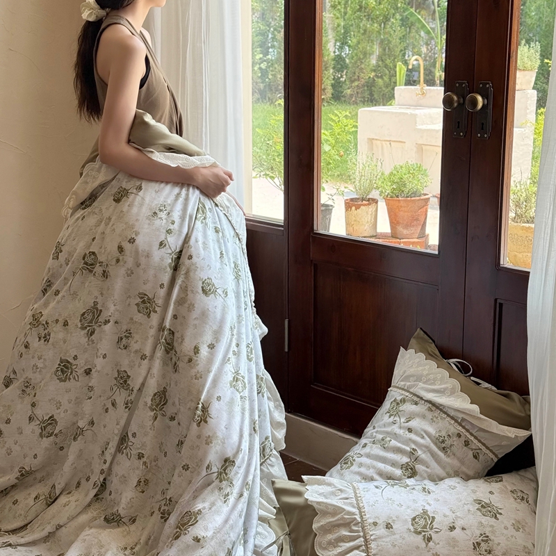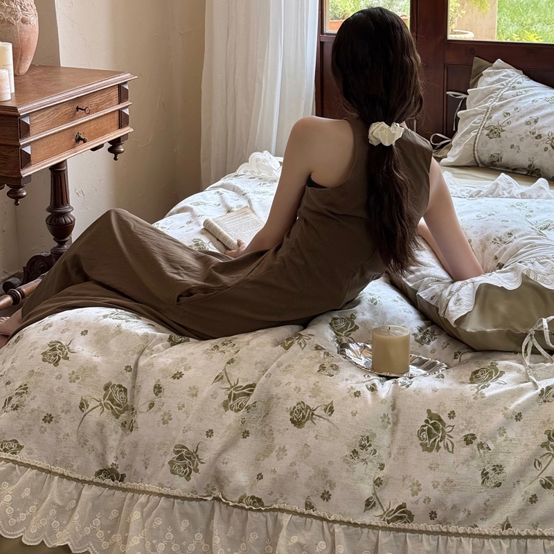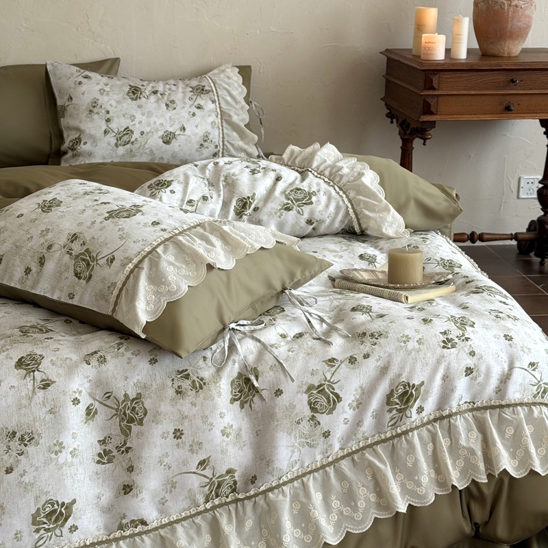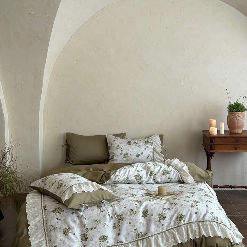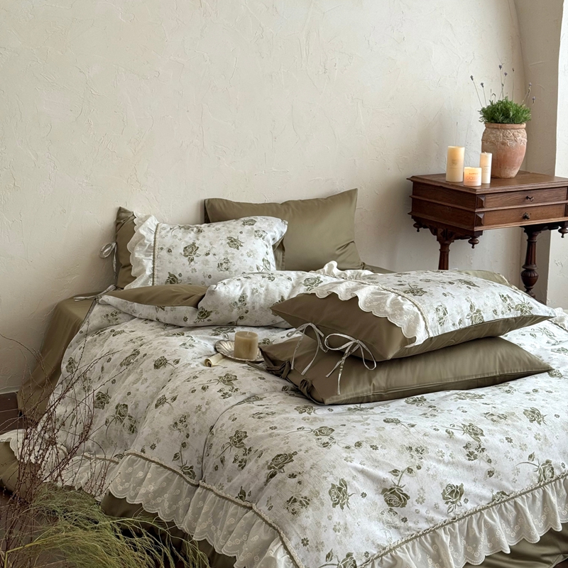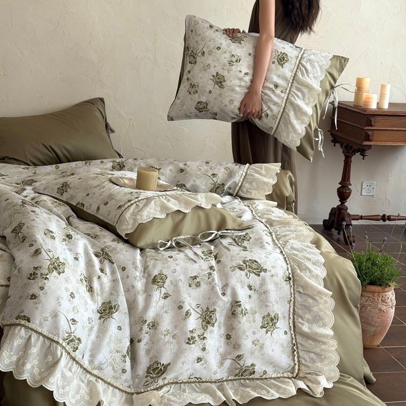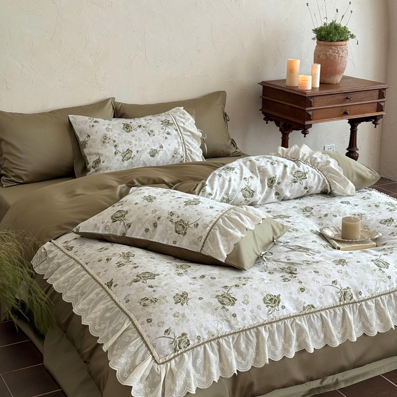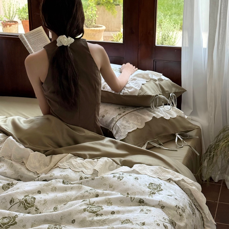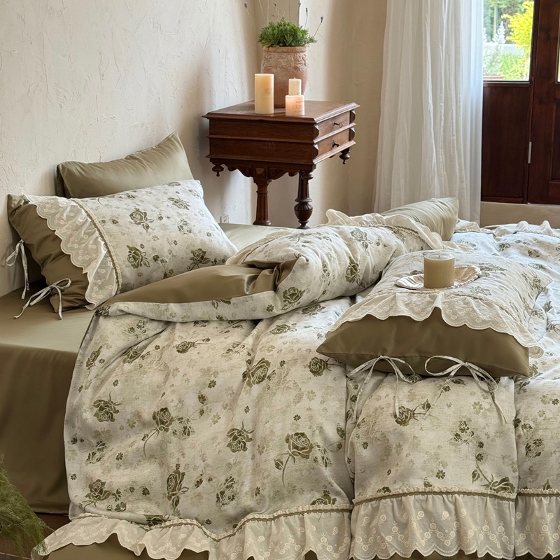 (总)佳汐蓝家纺 2026春夏新款棉麻皱皱双层纱四件套-栀子茉莉 控价:卷后不低于398,栀子茉莉-绿色床单,栀子茉莉-麻色床单