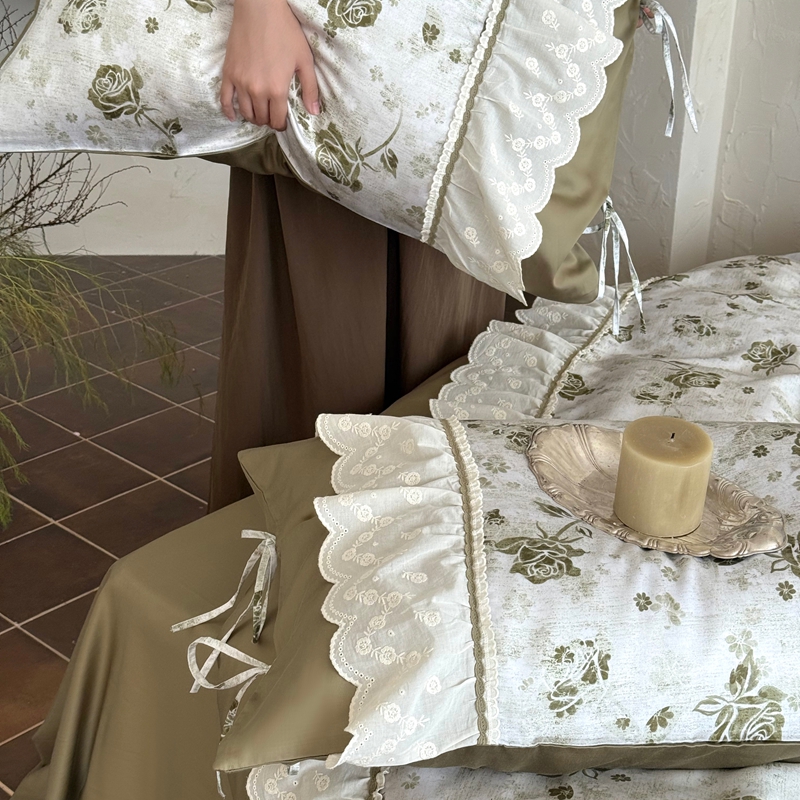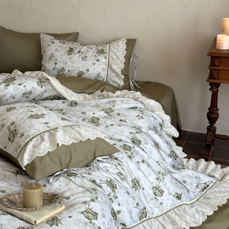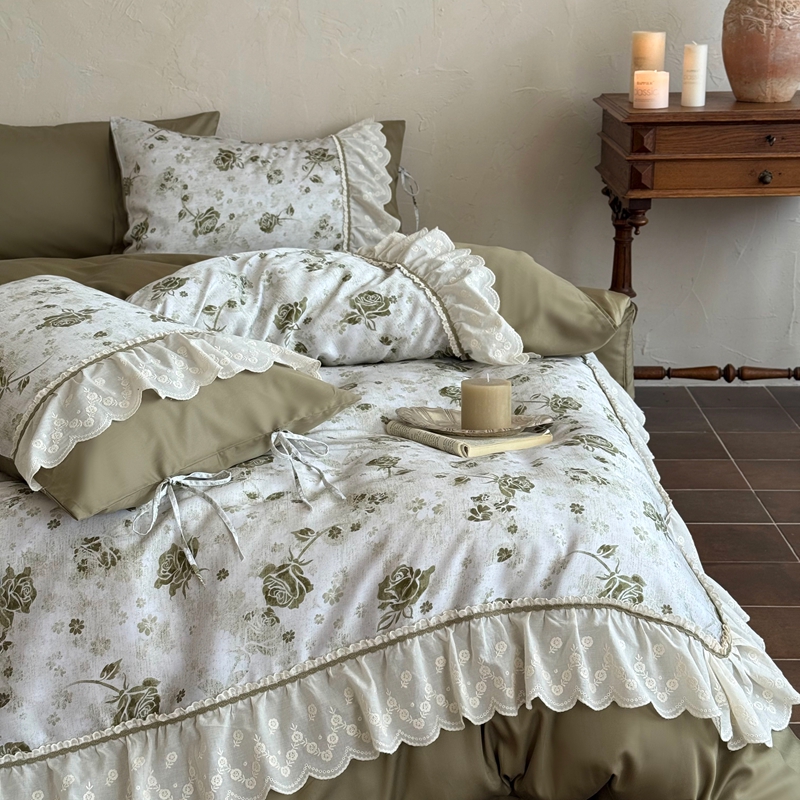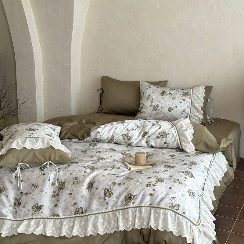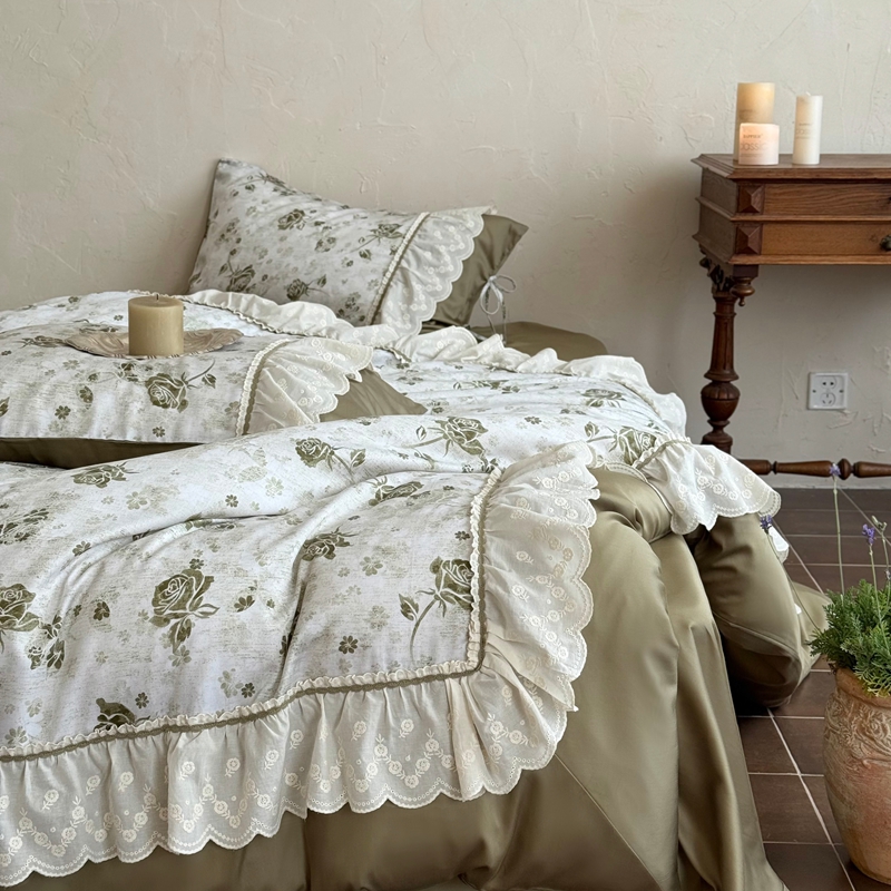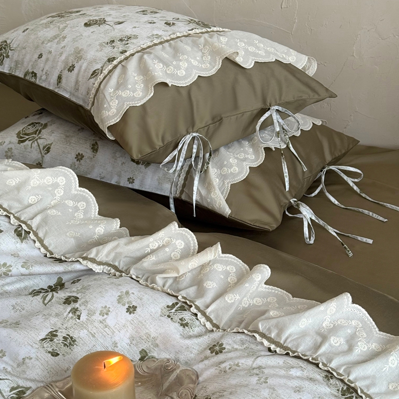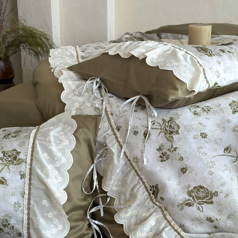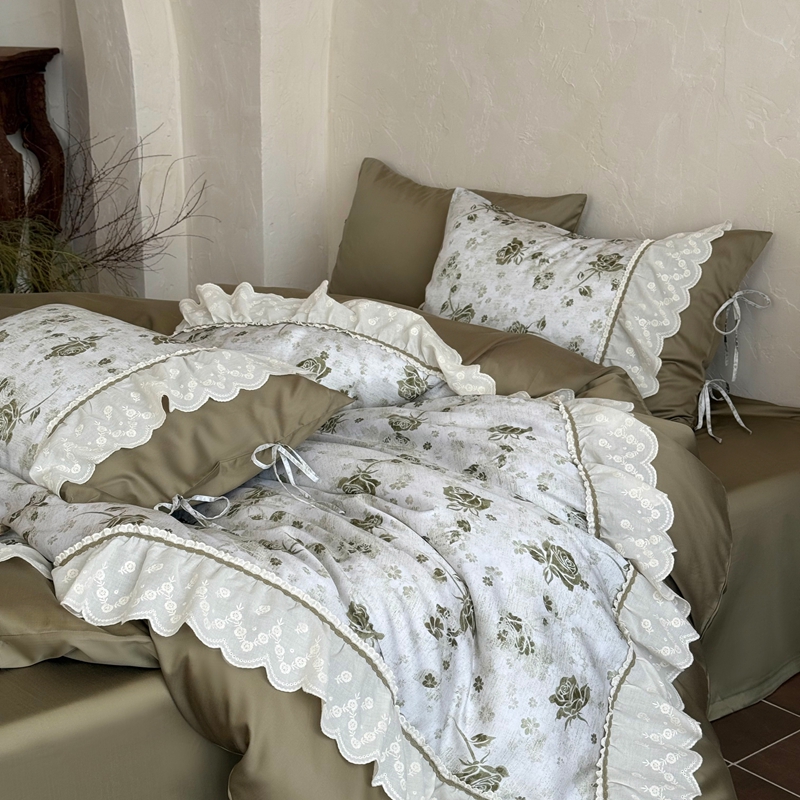 (总)佳汐蓝 2025春夏新品双层皱皱纱刺绣+织带+荷叶边四件套--白茶花,奶白,曲奇