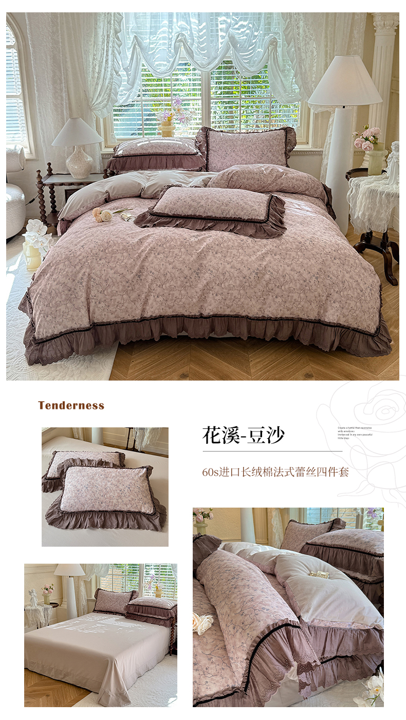巧玲珑 2025新款法式蕾丝印花60支进口长绒棉四件套 花溪-豆沙