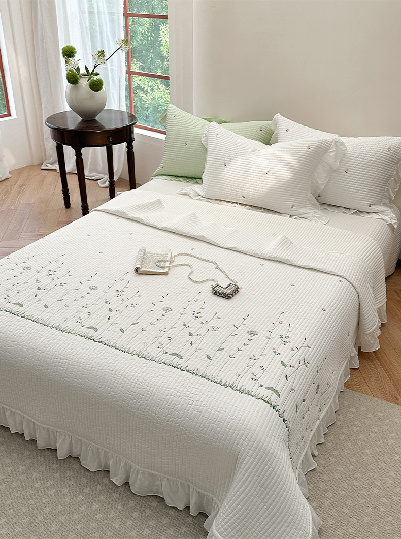 琳可家居 2025新款100%再生纤维素纤维刺绣款花边床盖-田园花憩 田园花憩-白