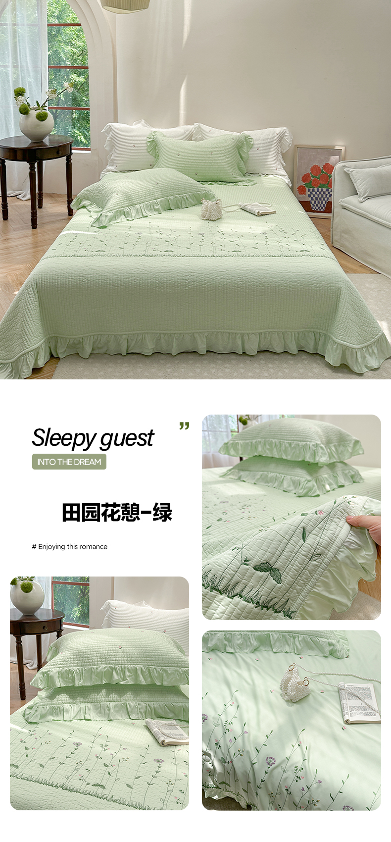 2022新款40S纯棉水洗棉全棉荷叶边夹棉床盖三件套青草绿,青草绿
