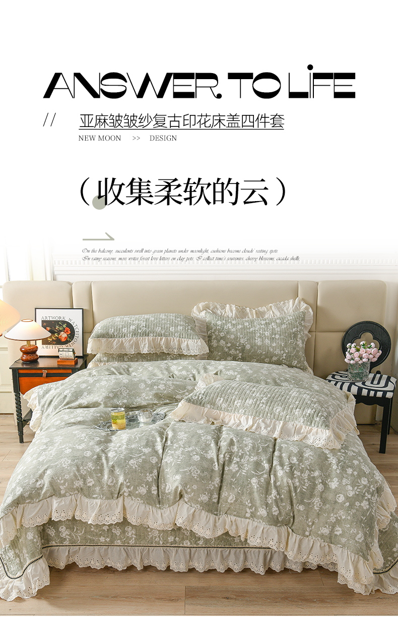 商品名称:家之硕家纺 2025秋冬款原麻亚麻皱皱纱复古印花床盖单品 风华绿