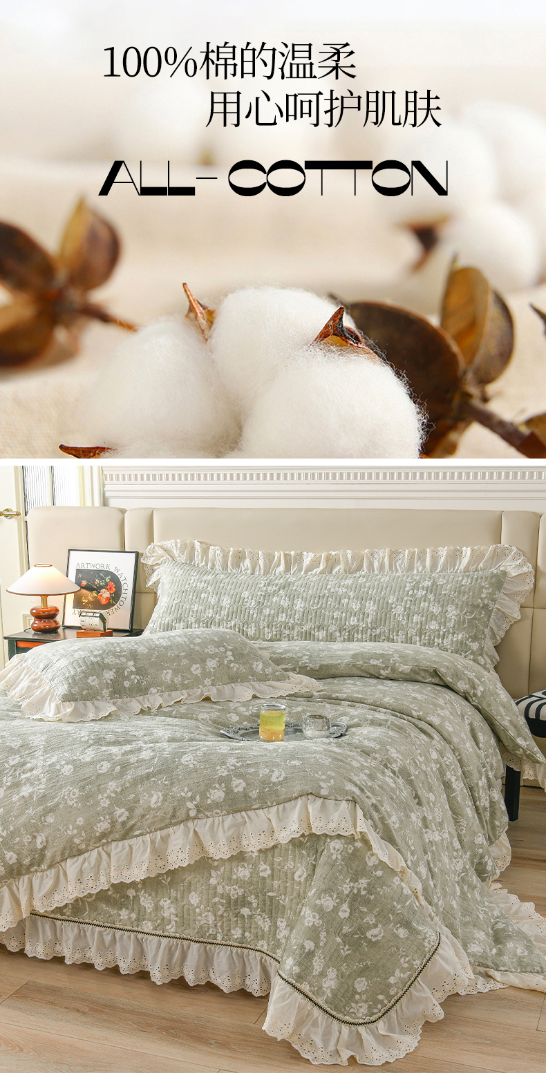 家之硕家纺 2025秋冬款原麻亚麻皱皱纱复古印花床盖单品 风华绿