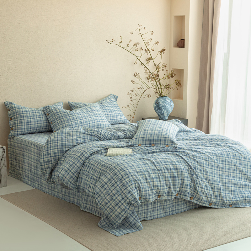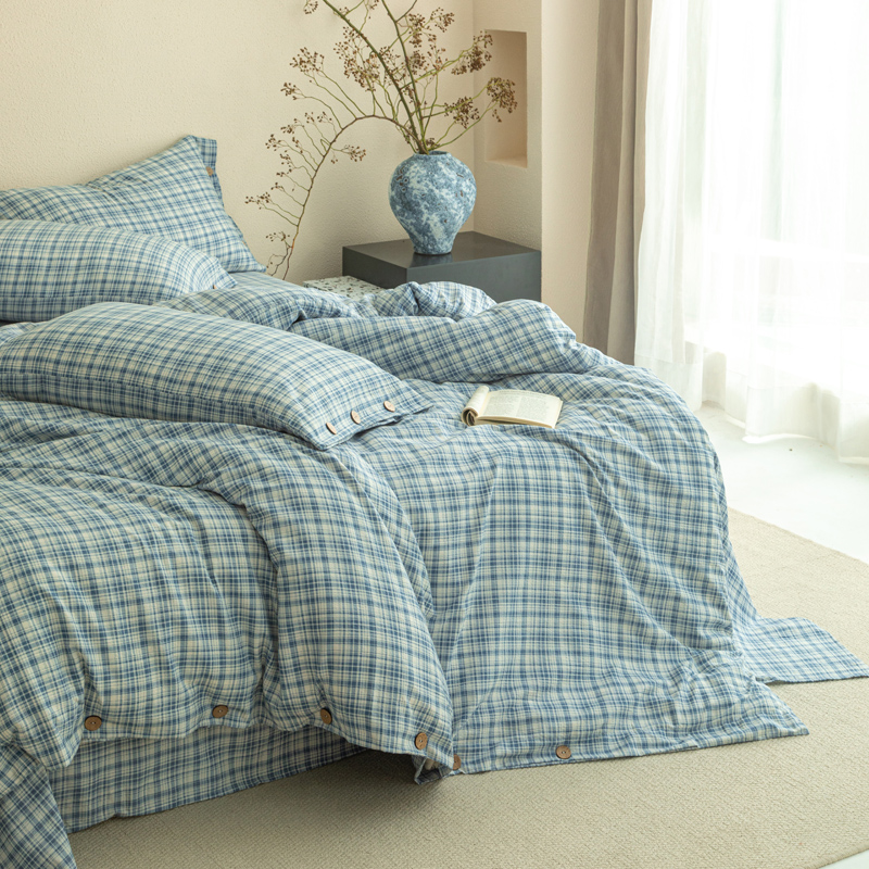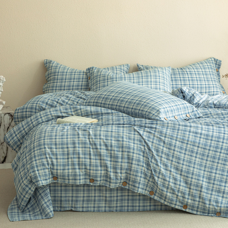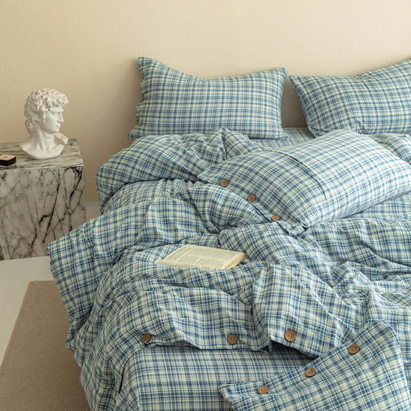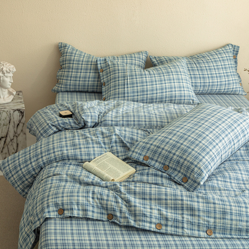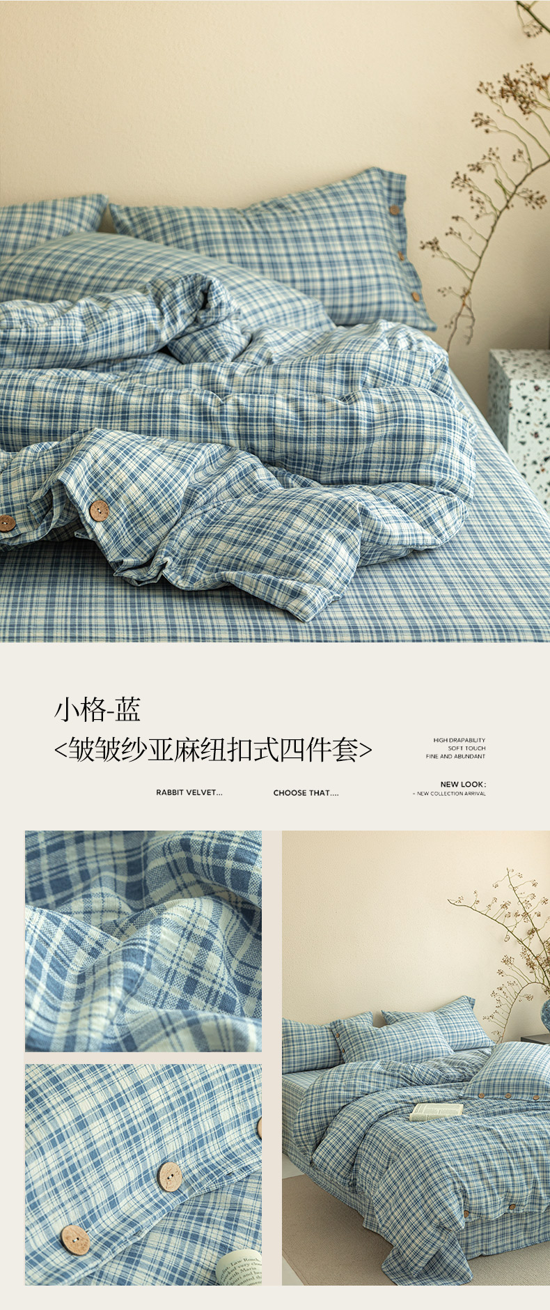 当前位置: 91家纺网 > 商品网购 > 床品套件 > 四件套 > 化纤活性四件套 > 库里梦家纺 2025新款皱皱纱亚麻纽扣式四件套 小格-蓝