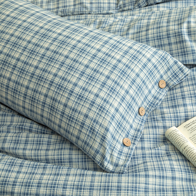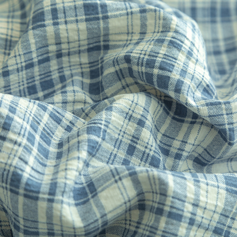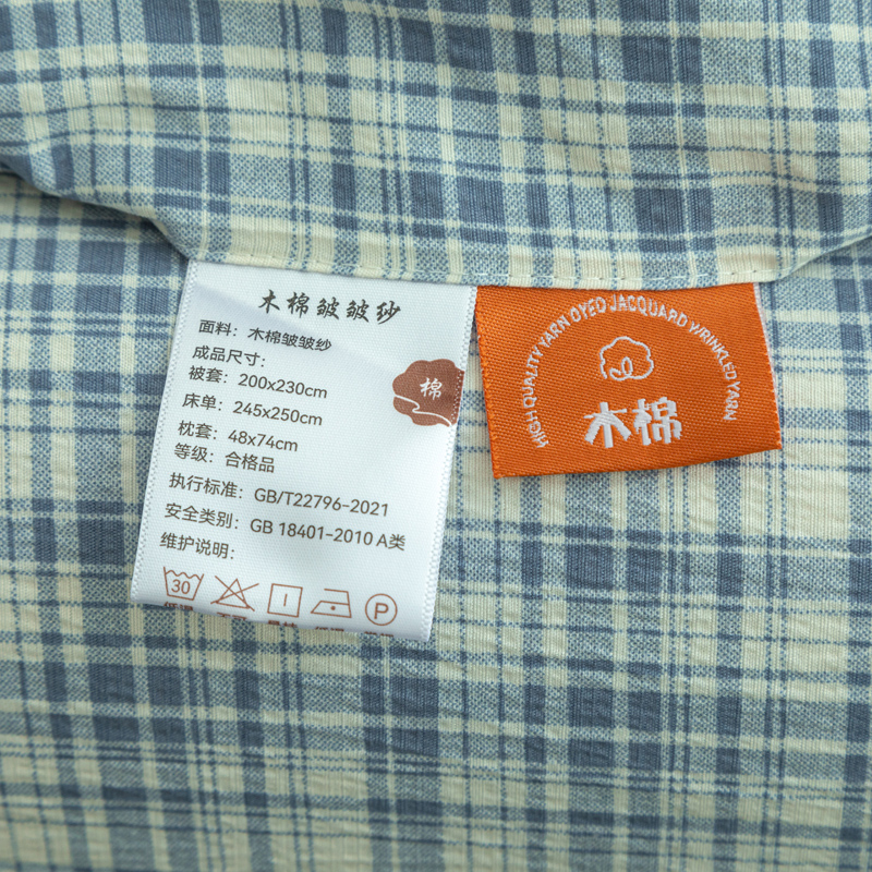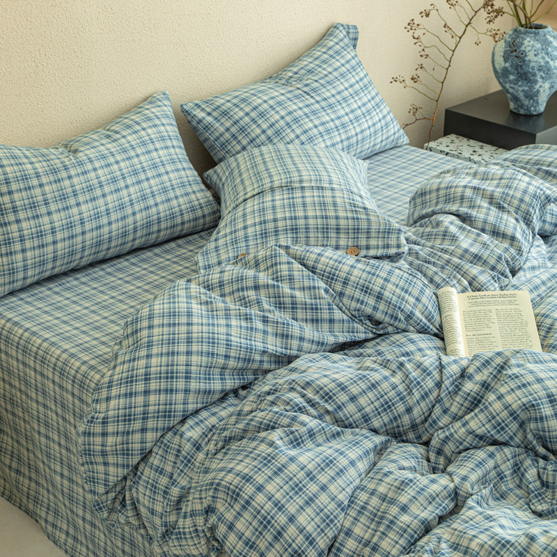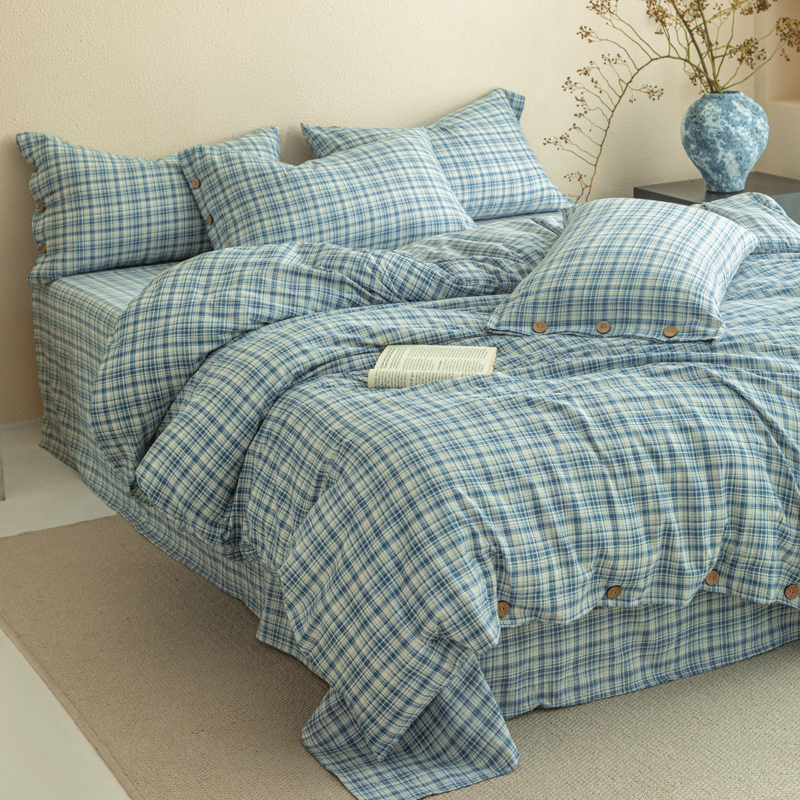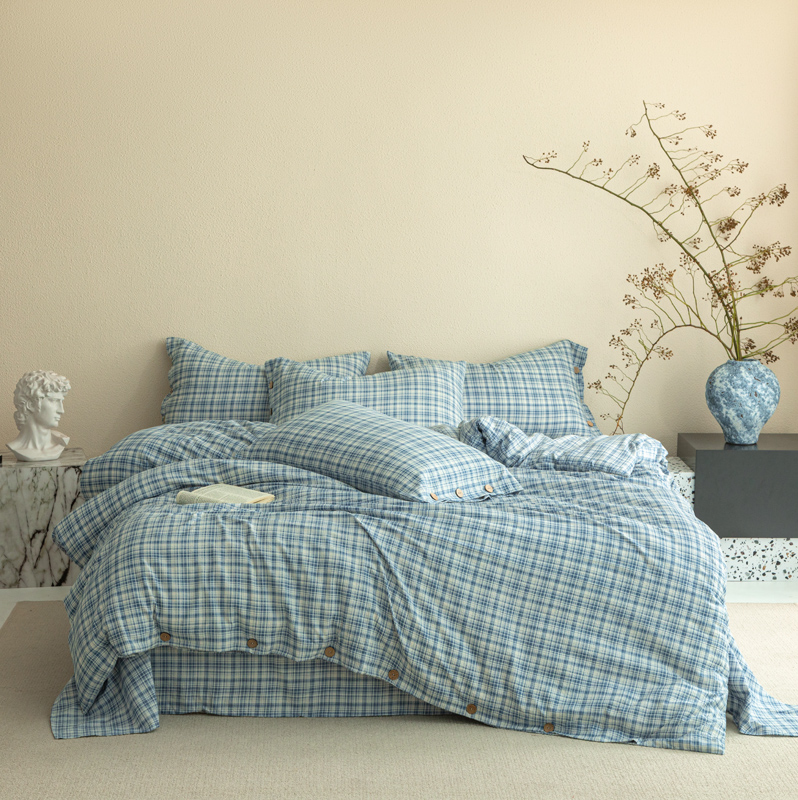 当前位置: 91家纺网 > 商品网购 > 床品套件 > 四件套 > 化纤活性四件套 > 库里梦家纺 2025新款皱皱纱亚麻纽扣式四件套 小格-蓝