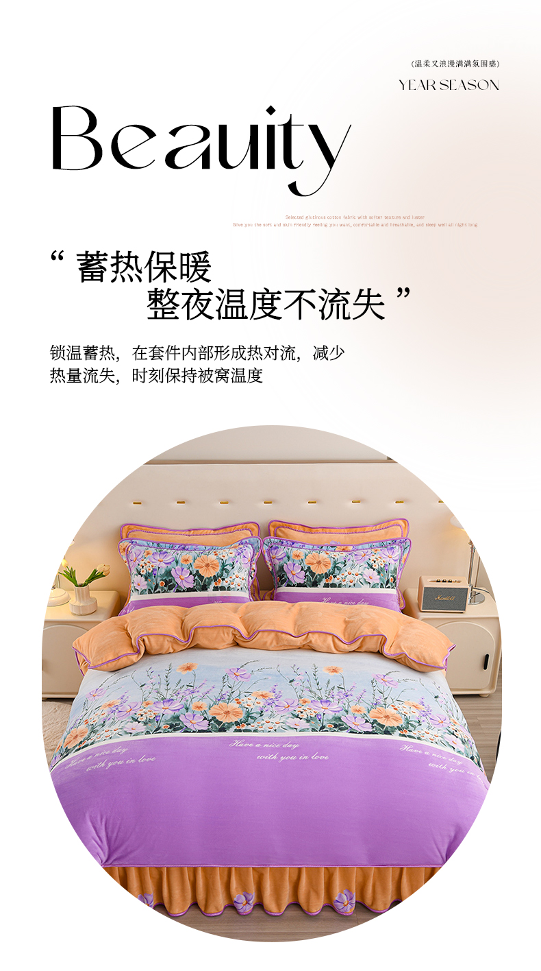 晚静家纺 2024新款8.5斤牛奶绒金貂法莱绒床裙款保暖绒四件套 杏运小花,杏运小花