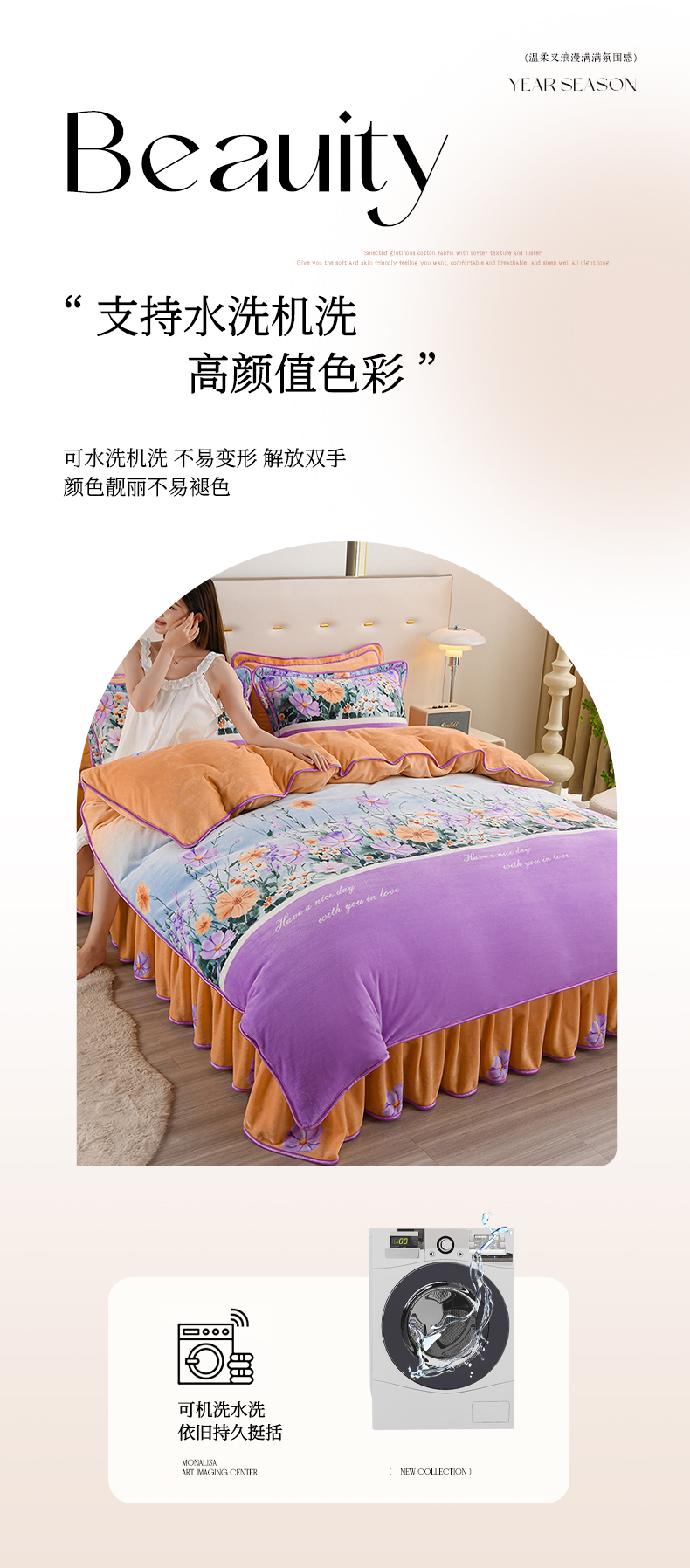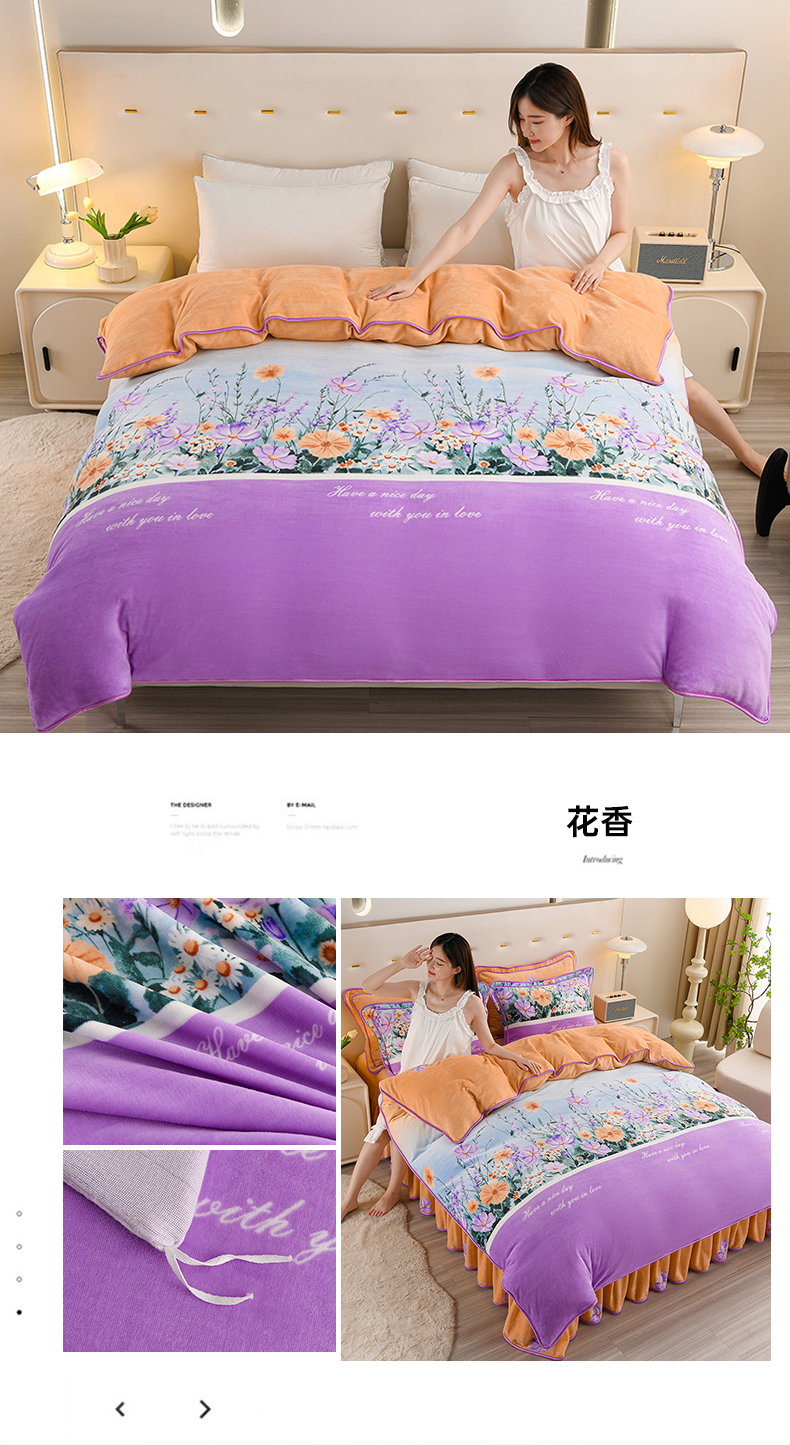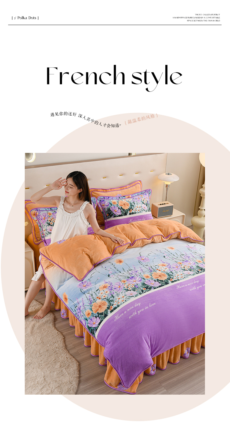 晚静家纺 2024新款8.5斤牛奶绒金貂法莱绒床裙款保暖绒四件套 多彩有杏,多彩有杏