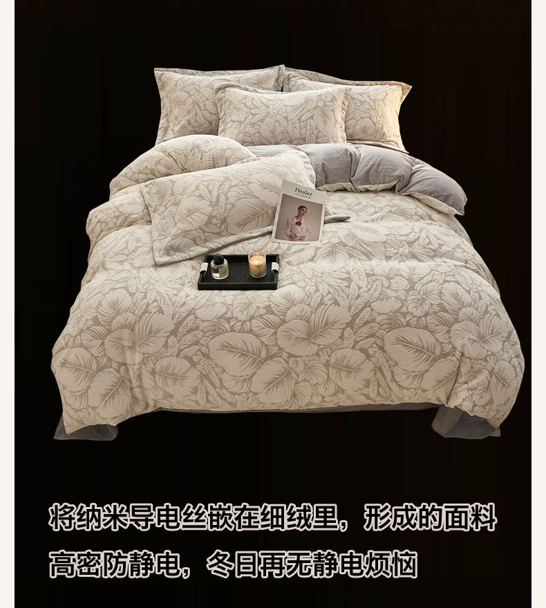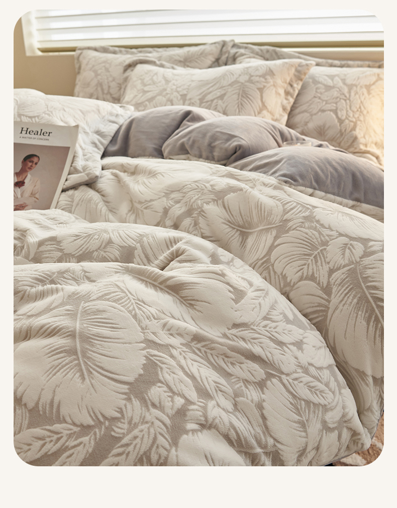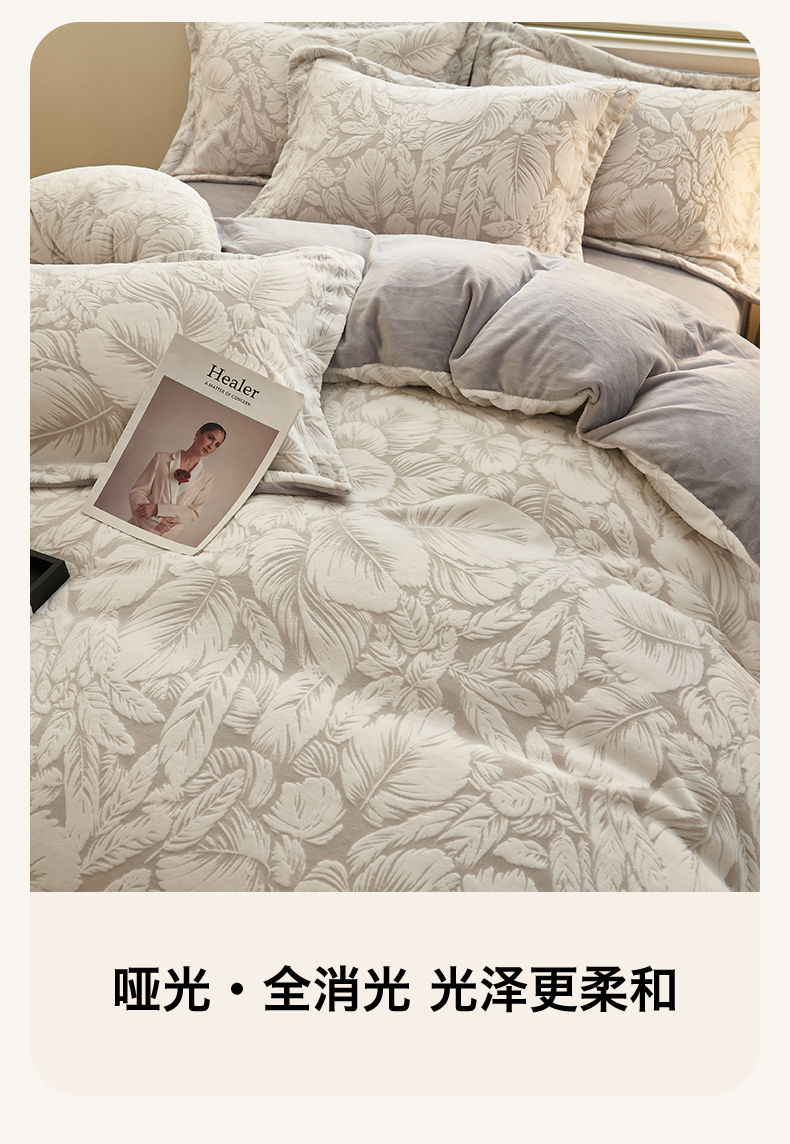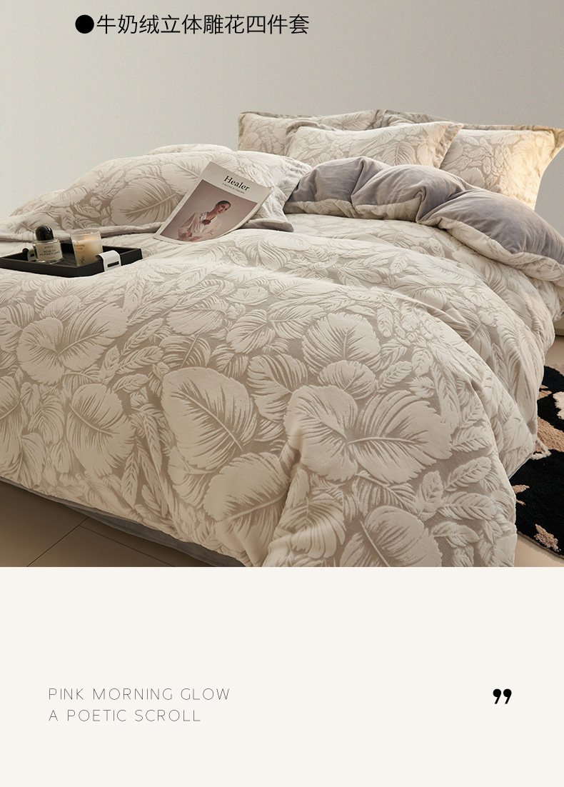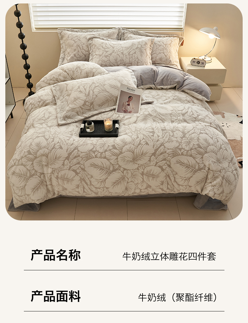 商品名称:恒爱家纺 2025新款牛奶绒立体剪花四件套 翩叶-灰